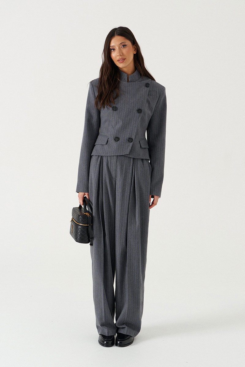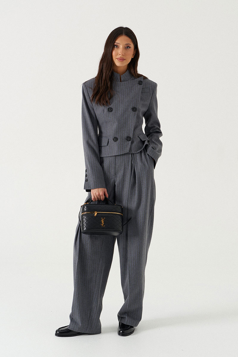 Жакет укороченный полуприталенного силуэта, выполнен из текстильной, чуть ворсистой ткани, серого цвета в узкую полоску. Характеристика: полуприталенный силуэт, вороник-стойка, центральная застежка на пуговицы слегка на запах, слева на груди имитация прорези для кармана, чуть ниже талии имиьация карманов с клапанами, подплечники, рукав втачной с небольшим разрезом застегивающимся на пуковицы, по переду и сзади изедлия простроченные выточки, спинка с центральным швом.