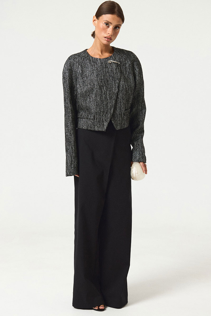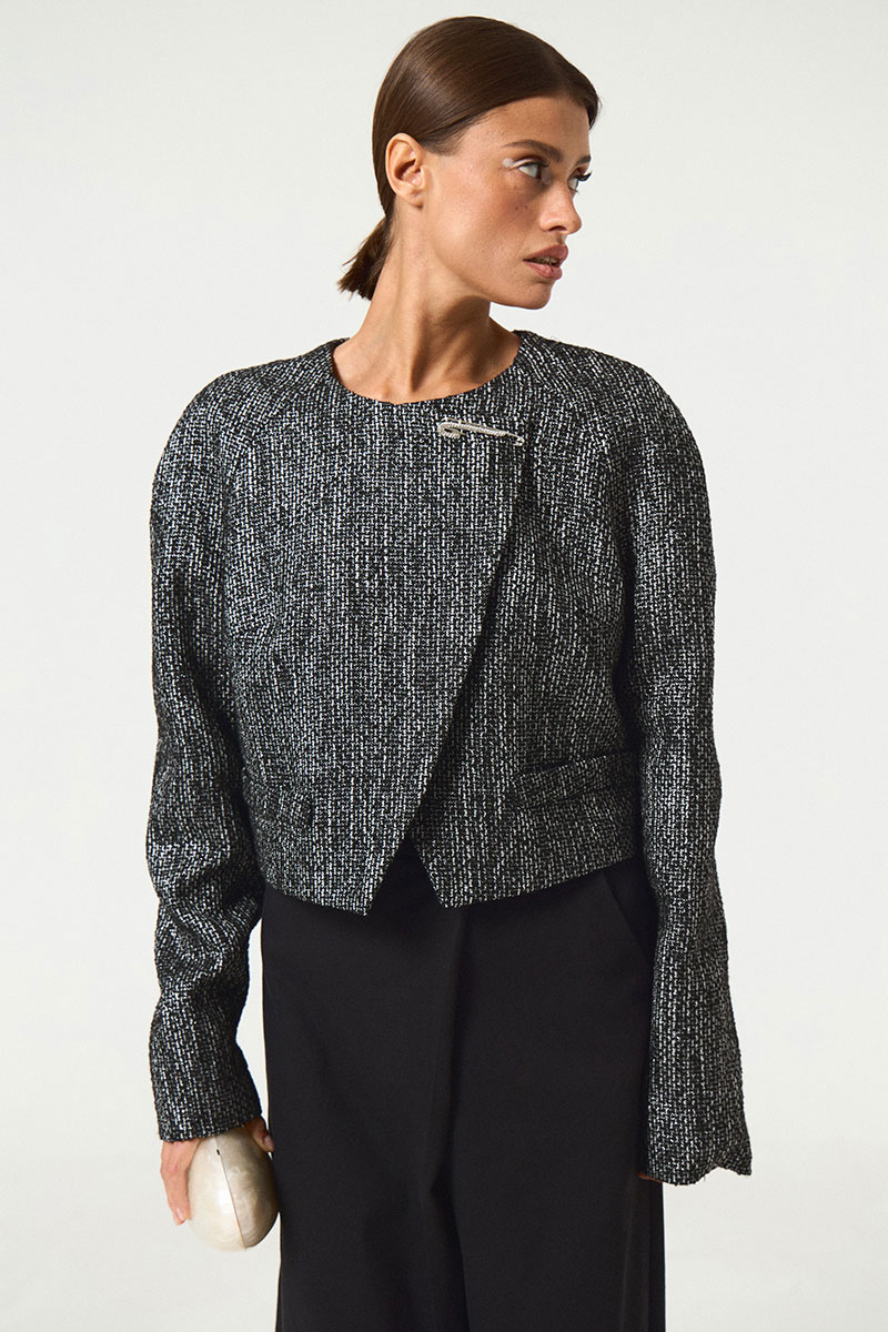 Укороченный жакет прямого силуэт. Рукав реглан. Вырез горловины округлый, без воротника. Двубортная застежка на обметанные петли и пуговицы.