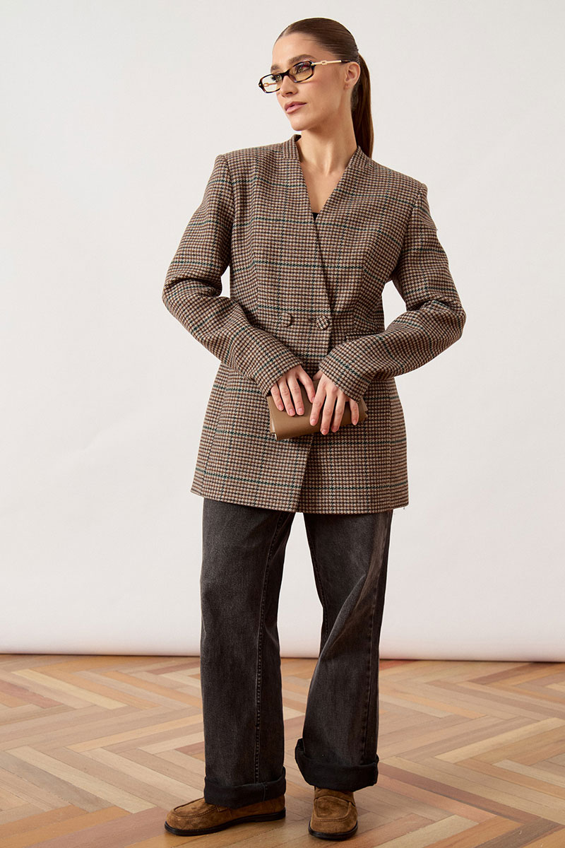 Жакет женский, полуприлегающего силуэта, выполнен из костюмной ткани в мелкую клетку. Модель с углубленным V-образным вырезом горловины, без воротника и лацканов. Застежка смещенная (двубортная) на две пары пуговиц. Перед с талиевыми вытачками и прорезными карманами с клапанами, расположенными горизонтально. Рукав втачной, двухшовный, классической длины. Спинка со средним швом и рельефами от проймы до низа. Изделие на притачной подкладке, линия плеча подчеркнута плечевыми накладками.
