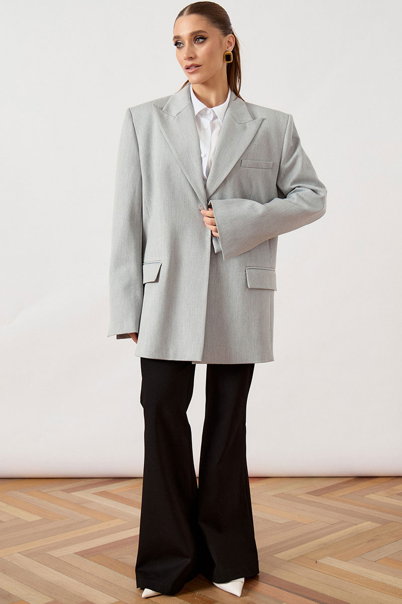 Жакет мужского кроя (оверсайз) выполнен из костюмной ткани светло-серого цвета, на притачной подкладке. Модель прямого свободного силуэта с акцентной расширенной линией плеча. Воротник классический пиджачного типа с острыми лацканами. Центральная застежка на одну декоративную пуговицу контрастного светлого оттенка. Полочка с нагрудным прорезным карманом с листочкой слева и двумя функциональными горизонтальными прорезными карманами с клапанами в нижней части изделия. Рукав втачной, длинный, двухшовный, свободного прилегания. Спинка со средним швом и шлицей для свободы движения. Нижний край жакета обработан классическим швом вподгиб