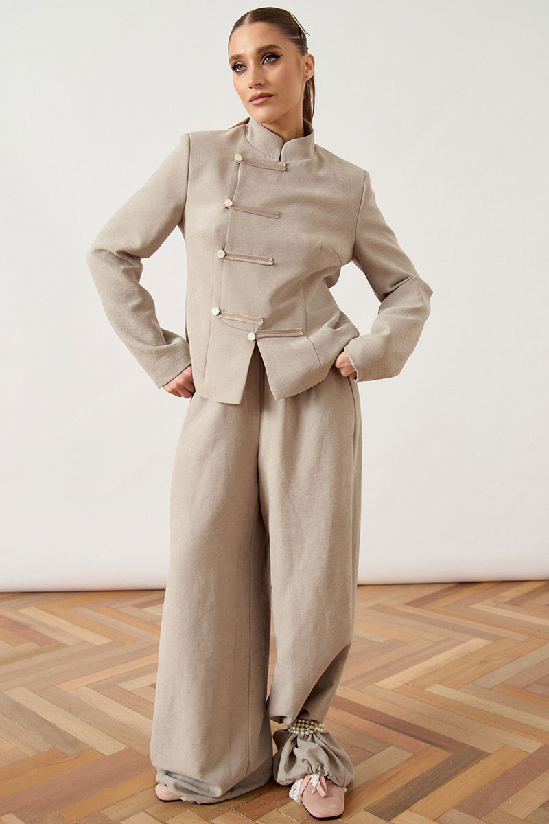 Жакет приталенного силуэта выполнен из плотной костюмной ткани молочного оттенка, на притачной подкладке. Модель с воротником-стойкой и выразительной смещенной застежкой в восточном стиле на четыре пары функциональных навесных петель и пуговиц, выполненных из основного материала. Полочка с вертикальными рельефами, обеспечивающими точную посадку по фигуре. Рукав втачной, длинный, классического кроя. Спинка со средним швом. Нижний край изделия обработан классическим швом вподгиб.
