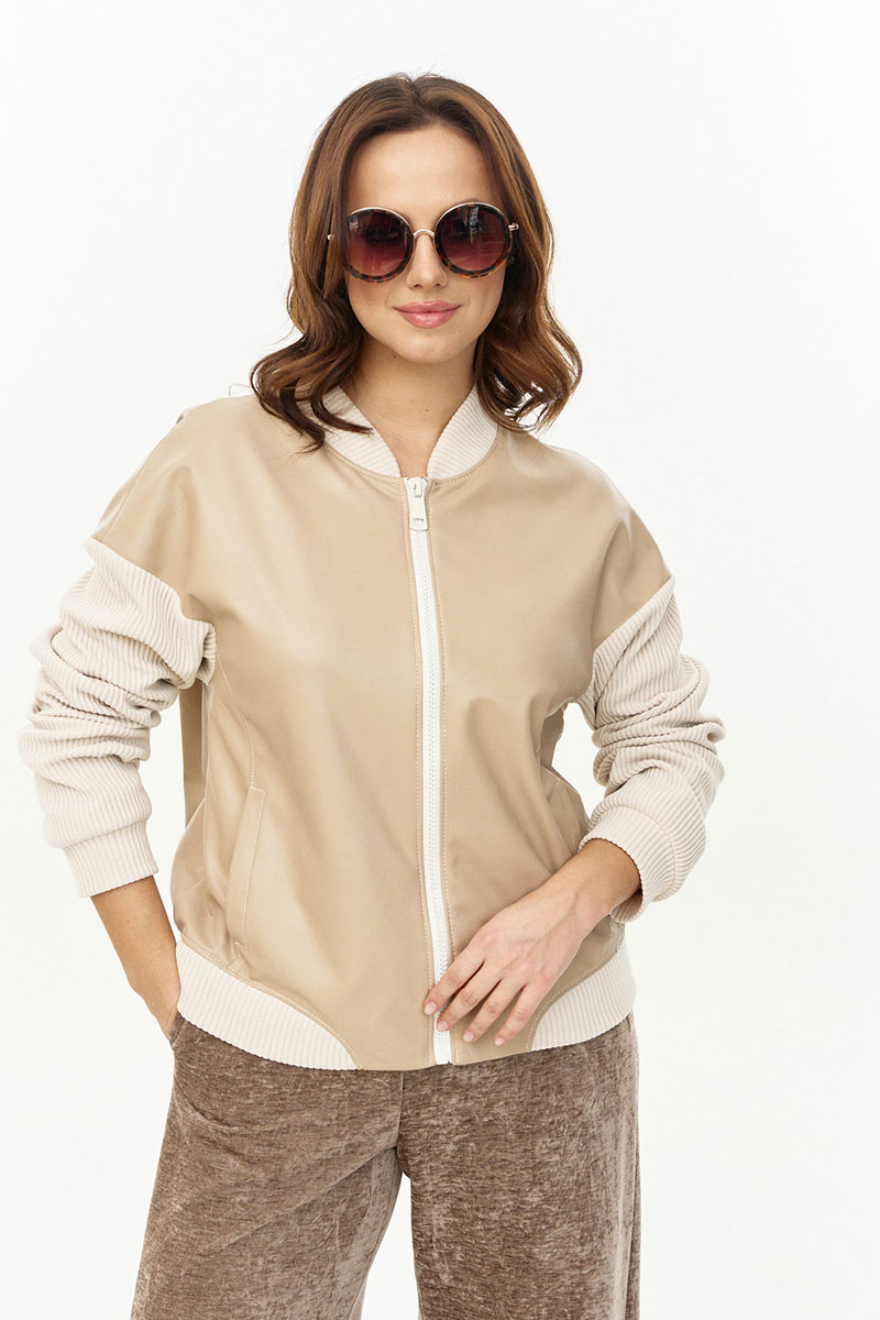 Бомбер из мягкой и эластичной экокожи, длиной до линии бедер, с застежкой на молнию, горловиной со стойкой и боковыми карманами в швах. Рукава, стойка и манжета низа из отделочного вельветового трикотажа. Спинка декорированаавторским принтом с использованием флока. Изделие на подкладке.