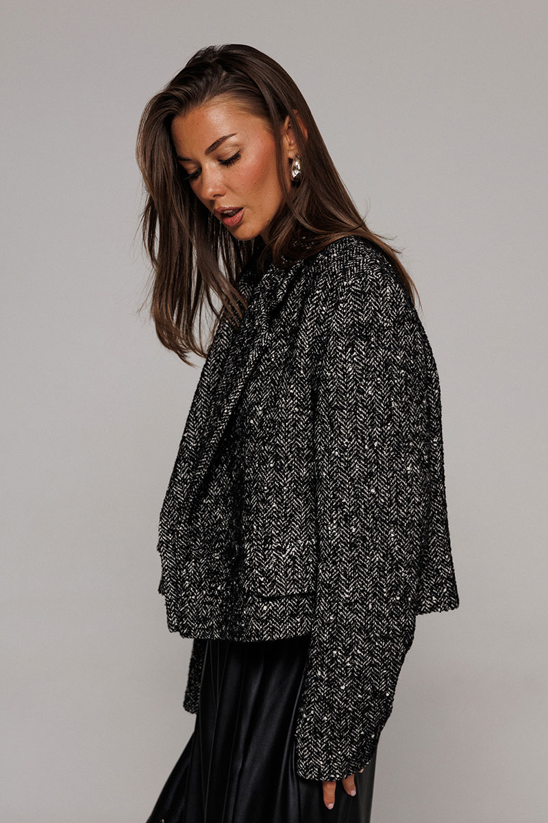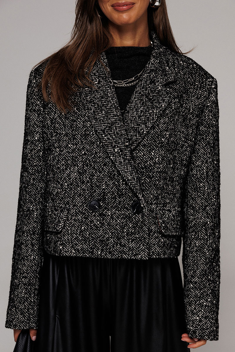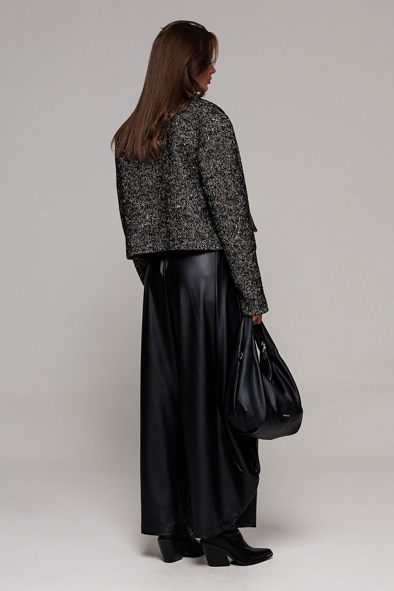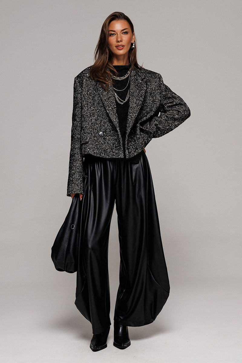 Жакет укороченный прямого силуэта, двубортный с втачным двухшовным рукавом. Полочка с застежкой на петлю-пуговицу и имитацией кармана с клапаном и отрезным бочком. Спинка с отрезным бочком и центральным швом. Воротник пиджачного типа с отрезной стойкой. Жакет на подкладке.