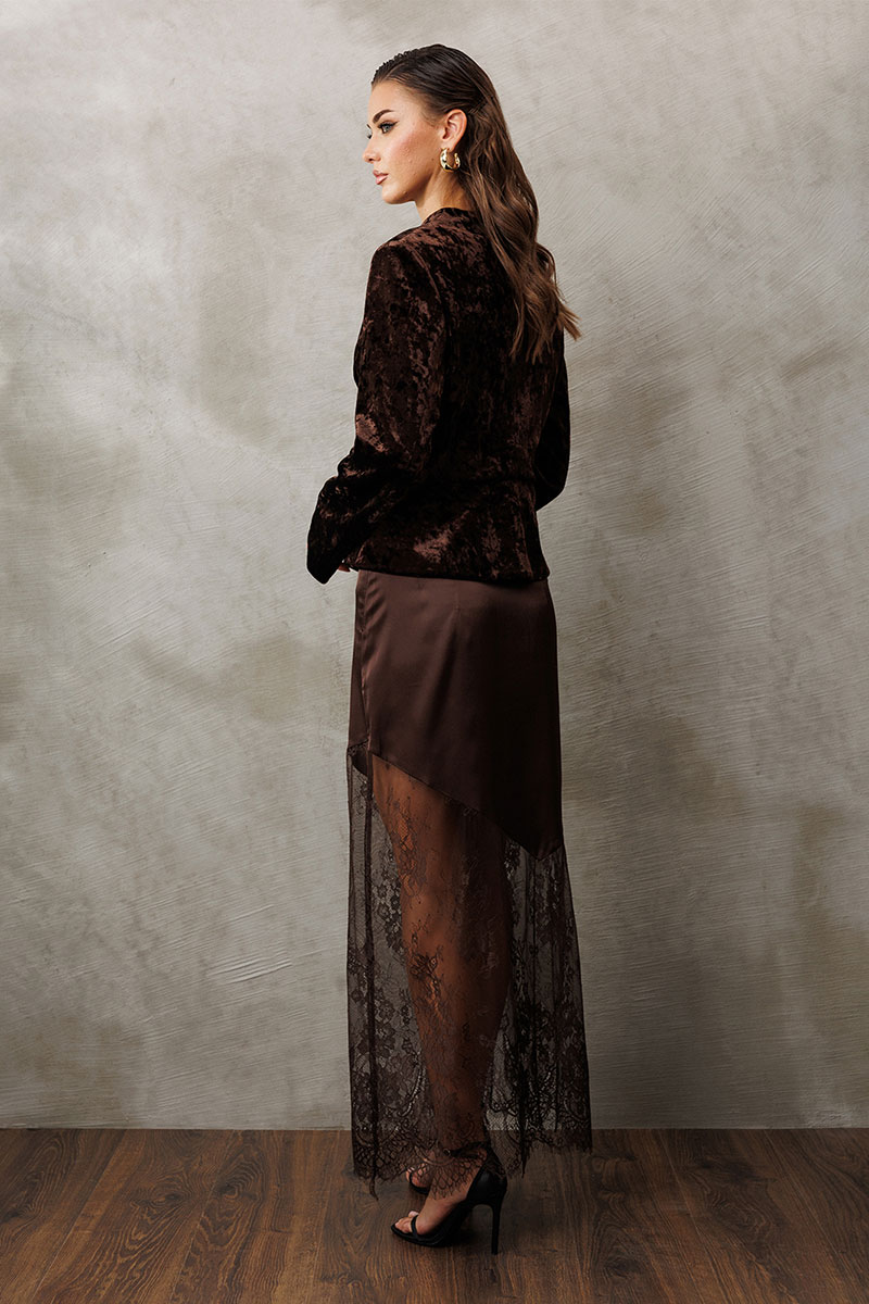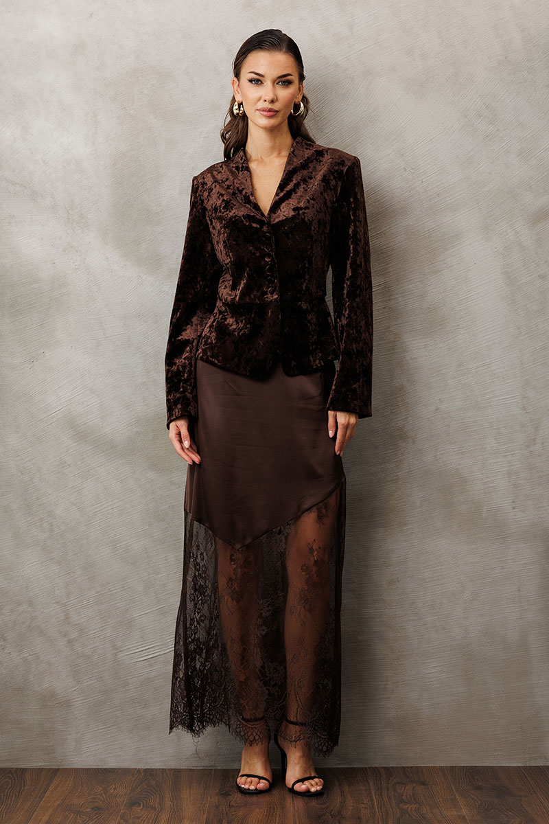 Жакет из велюровой ткани полуприлегающего силуэта, с втачным двухшовным рукавом. Полочка и спинка с отрезной баской по линии талии. Полочка с V-образным вырезом, однобортной застежкой на петли пуговицы и талиевой вытачкой от баски. Спинка с центральным швом. Жакет с отрезным бочком, переходящим на полочку и на спинку. Жакет на подкладке.