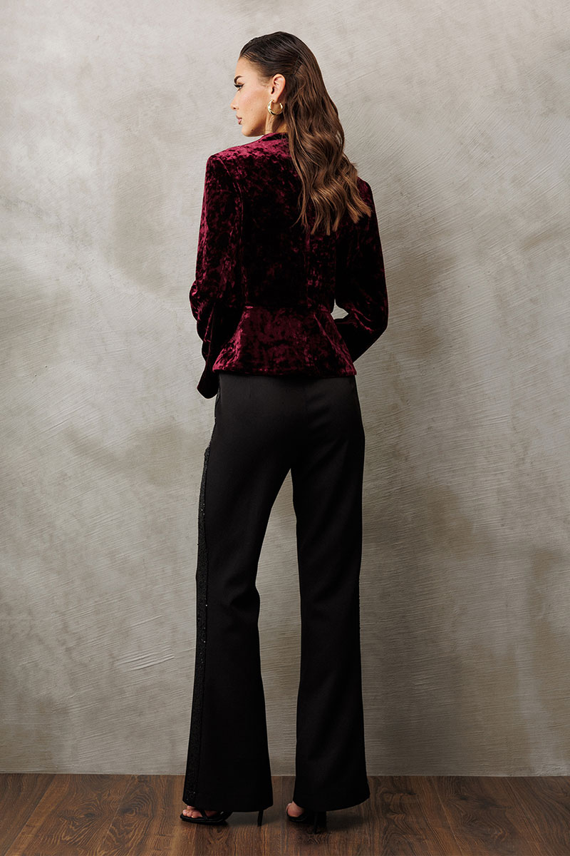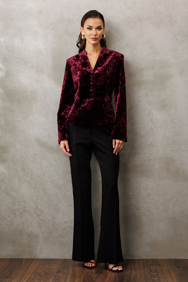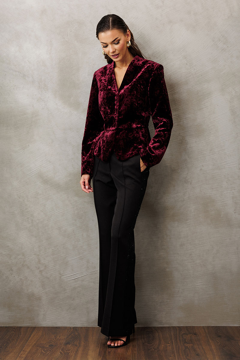 Жакет из велюровой ткани полуприлегающего силуэта, с втачным двухшовным рукавом. Полочка и спинка с отрезной баской по линии талии. Полочка с V-образным вырезом, однобортной застежкой на петли пуговицы и талиевой вытачкой от баски. Спинка с центральным швом. Жакет с отрезным бочком, переходящим на полочку и на спинку. Жакет на подкладке.