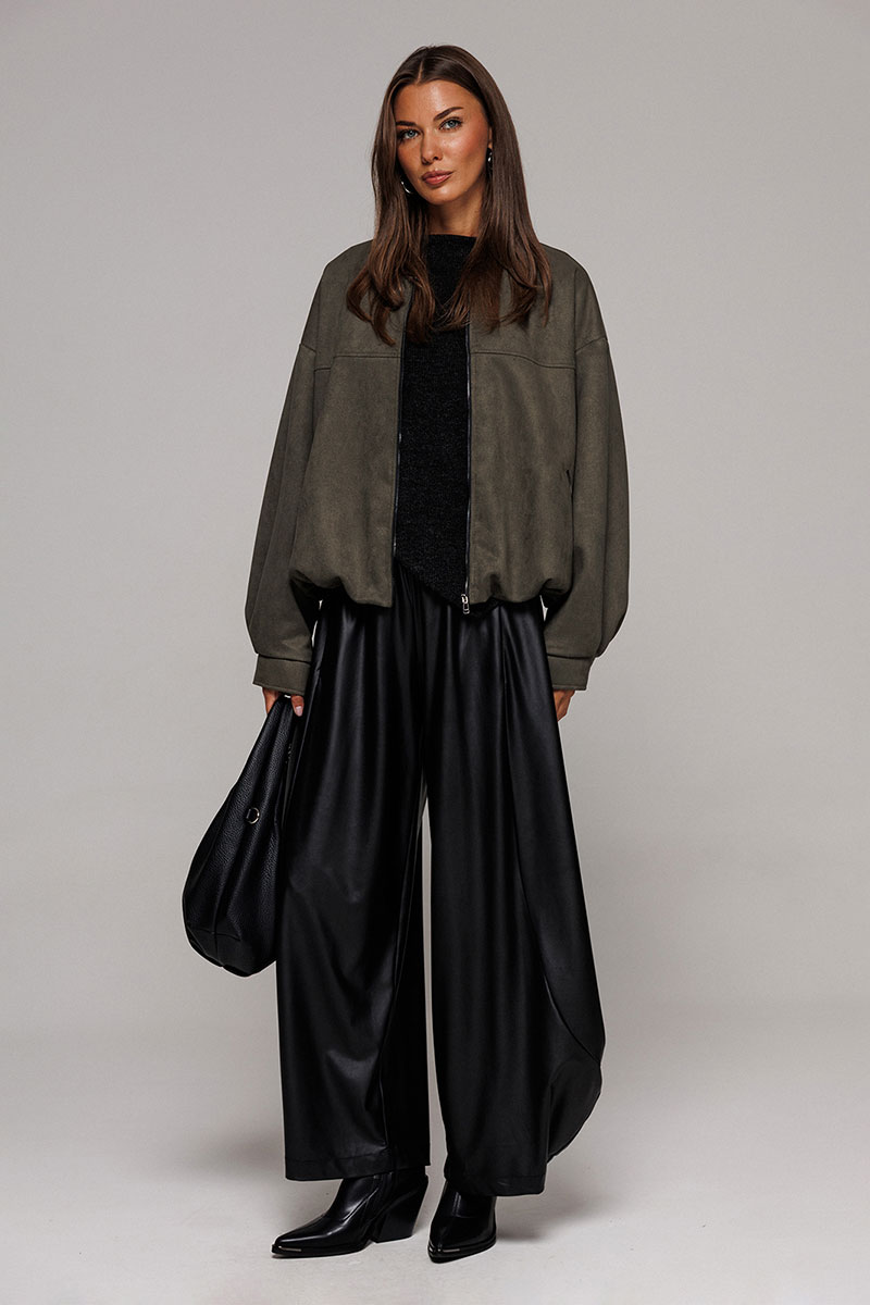 Жакет-бомбер из искусственной замши свободного силуэта со спущенной линией плеча. Рукав втачной двухшовнный, внизу со складками, притачной манжетой с застежкой на кнопку. Полочка с застежкой на тесьму молнию, с кокеткой и карманами с застежкой на молнию. Синка с кокеткой. По горловине планка из довяза. Низ жакета-бомбера со сборкой. Изделие на подкладке.