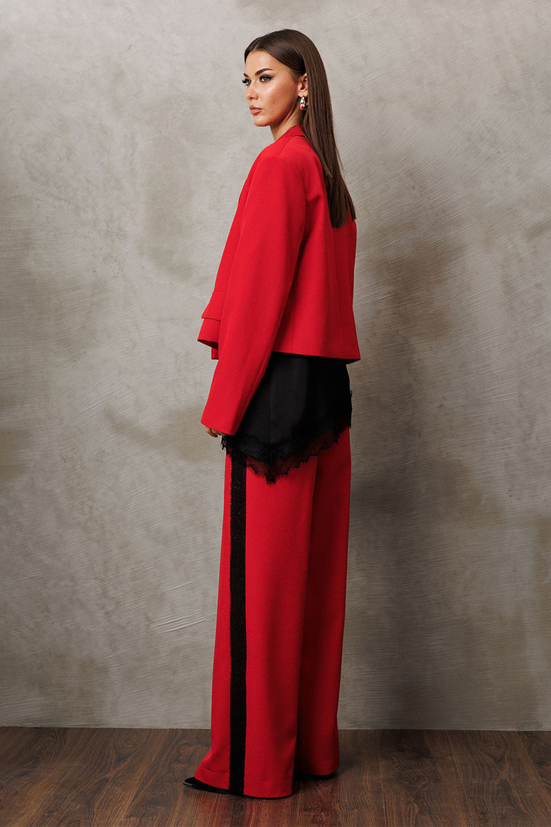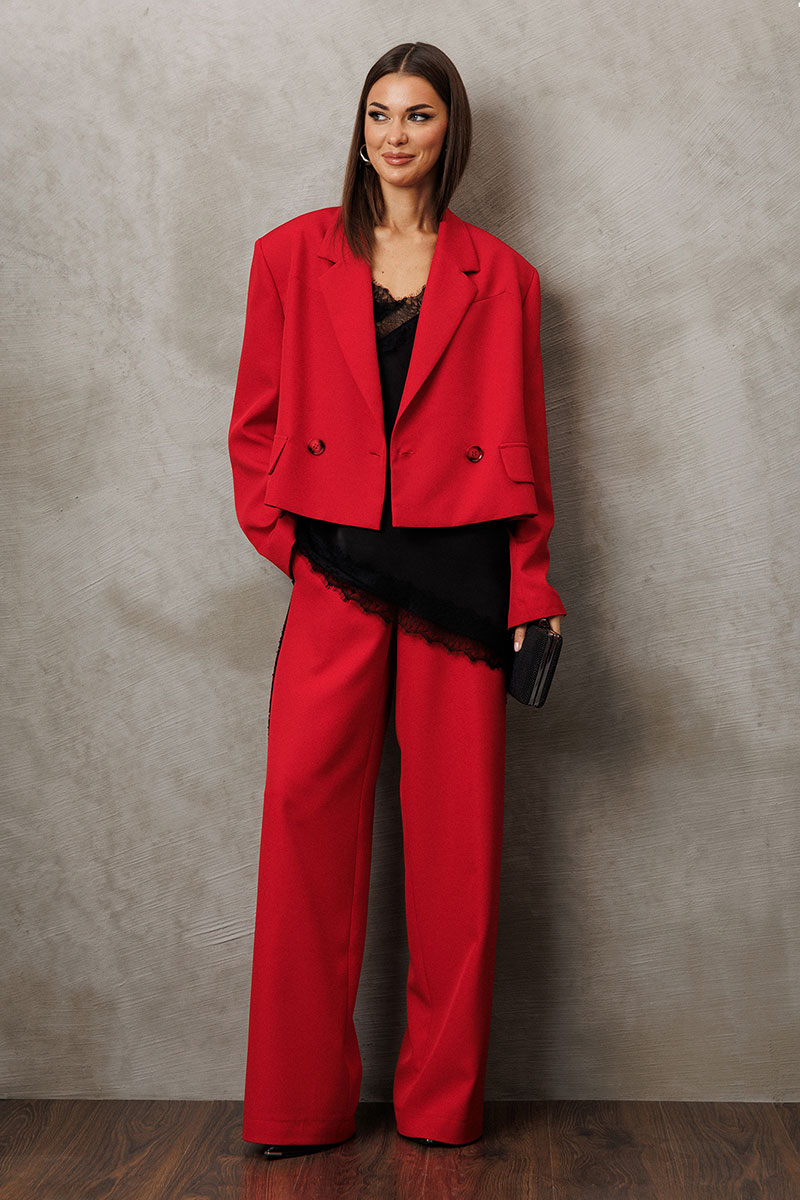 Жакет, укороченный прямого силуэта, двубортное с втачным двухшовным рукавом. Полочка с застежкой на петлю-пуговицу и имитацией кармана с клапаном. Спинка с центральным швом. Жакет с отрезным бочком, переходящим на полочку и на спинку. Воротник пиджачного типа с отрезной стойкой. Жакет на подкладке.