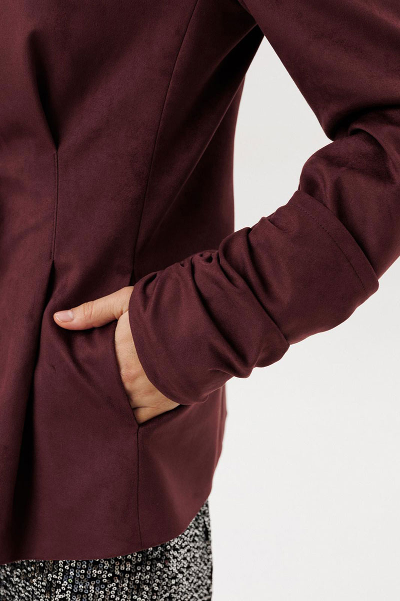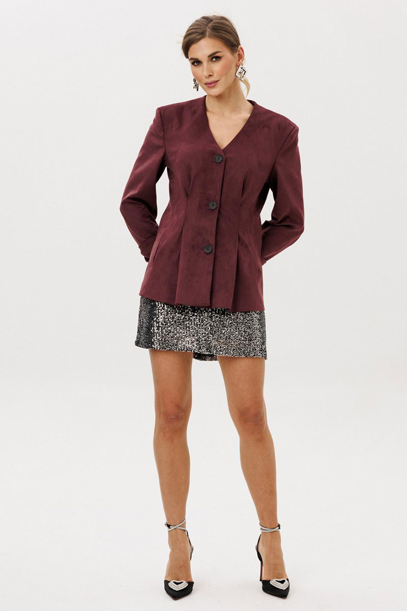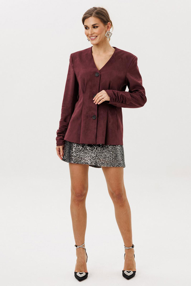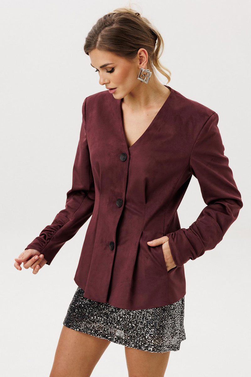 Жакет прилегающего силуэта с центральной бортовой застежкой на 3 прорезных петли и пуговицы. Жакет выполнен из искусственной замши. Перед со складкой застроченной на уровне талии, с бочком. В шве притачивания бочка обработан карман “ в швах”. Спинка со складками ,застроченными на уровне линии талии. Рукава втачные двухшовные длинные с накладной деталью со сборкой внизу верхней части рукава. Вырез горловины V-образный. Жакет на подкладке и с плечевыми накладками.