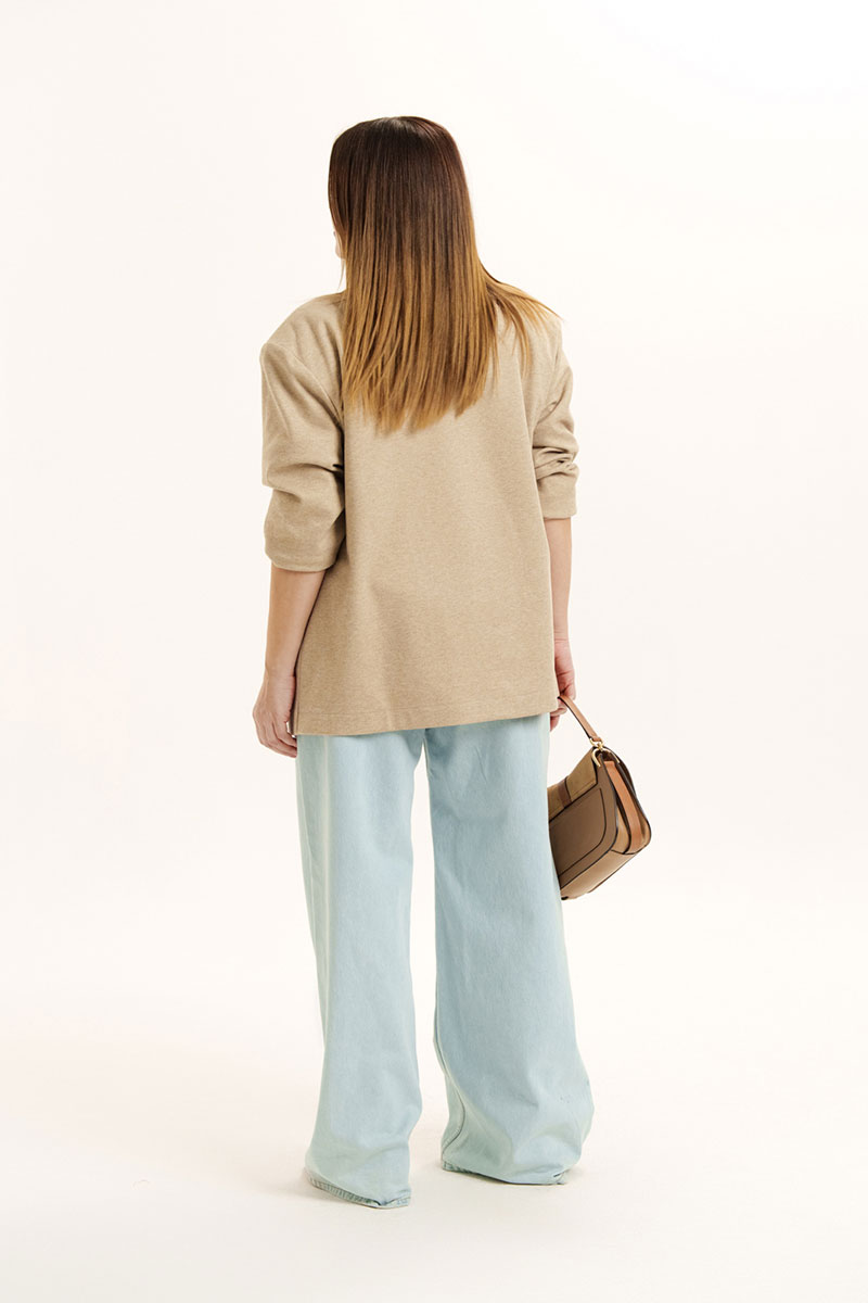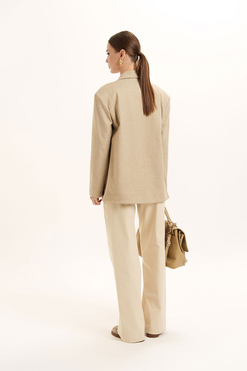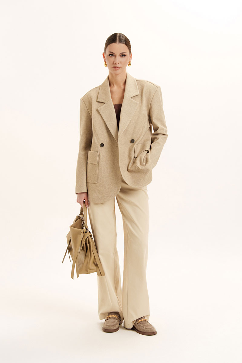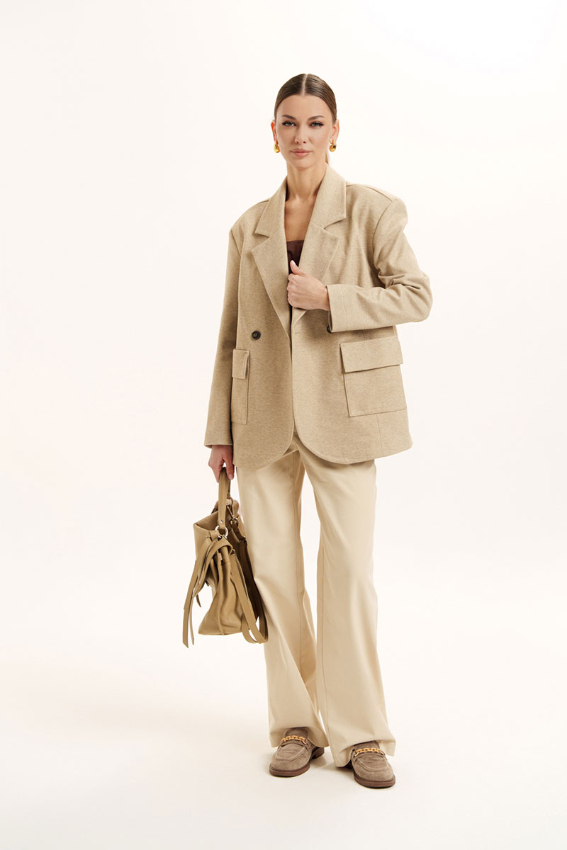 Жакет прямого покроя из мягкого трикотажного полотна. Вырез горловины оформлен воротником пиджачного типа с двубортной застежкой на петли с пуговицами. Рукава - втачные с расширенной линией плеча. Усилены плечевыми накладками. На передних половинках - настрочные карманы с цельнокроеными отворотами, имитирующими клапаны. Перед изделия посажен на подкладку.