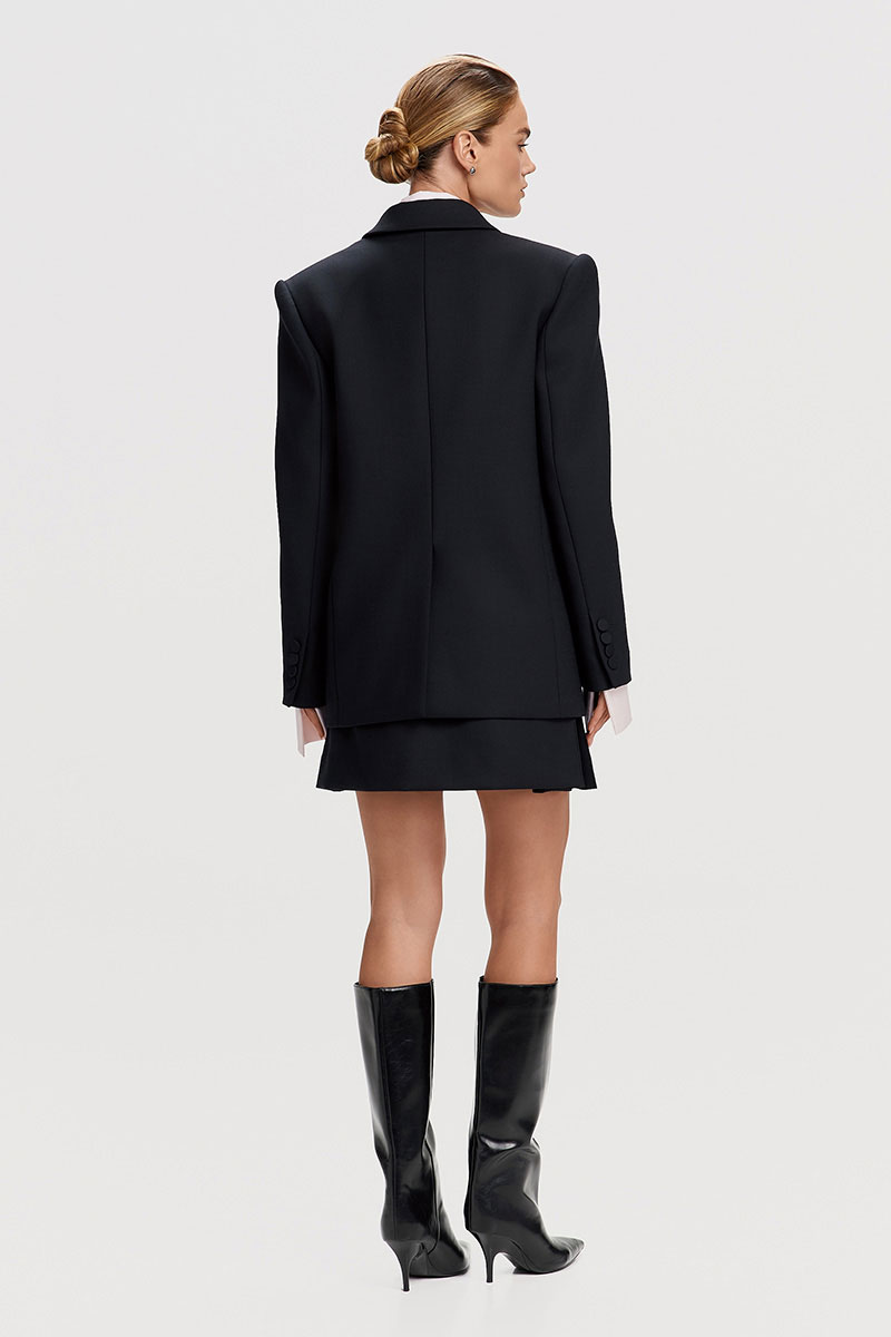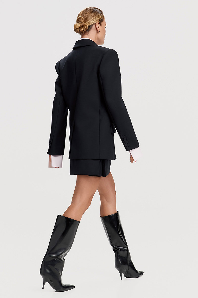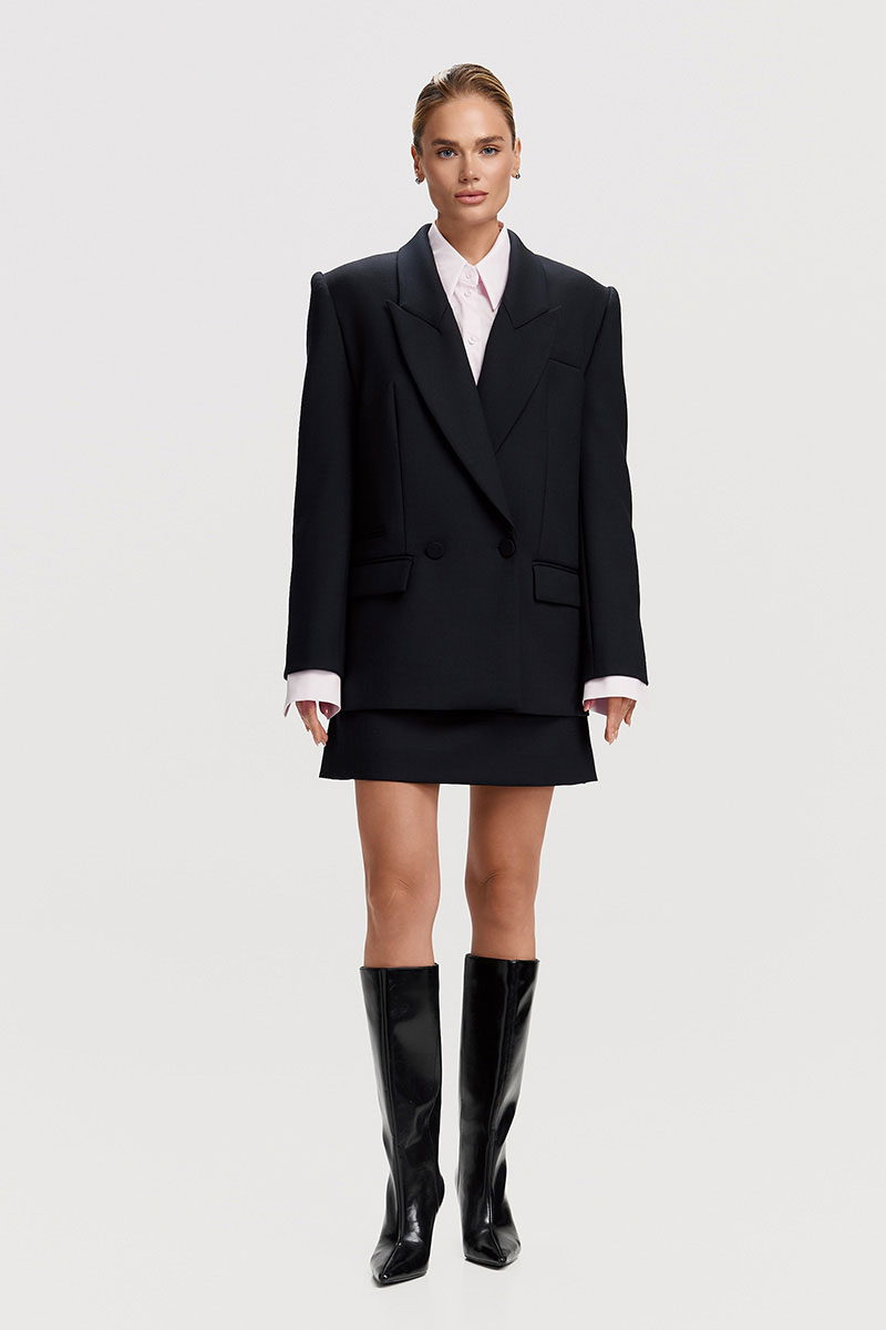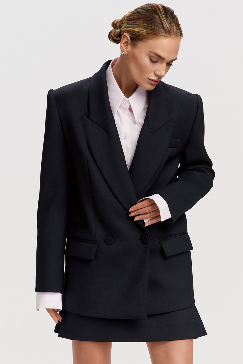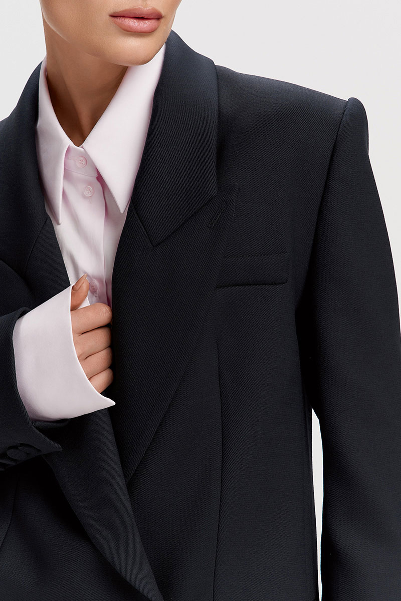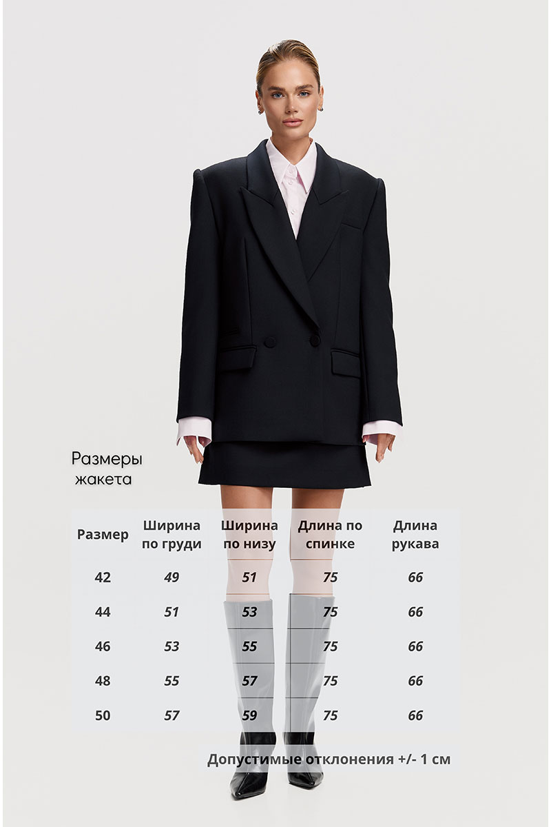 Классический и стильный жакет иссине-черного цвета, прямого, свободного кроя, на подкладке. Двубортная застёжка жакета на две петли с обтянутыми основной тканью пуговицами и одну потайную. Детали переда с вытачками и горизонтально расположенными боковыми карманами с клапанами. На левой полочке — имитация верхнего прорезного кармана с листочкой, на правой — имитация кармана на уровне талии. Спинка со средним швом и шлицей в нижней части. Воротник пиджачного типа на отрезной стойке: углы воротника тупые, лацканов — острые. Втачные рукава с открытыми шлицами по низу. На шлицах по 4 отделочные петли и пуговицы. Жакет идеальный компаньон для юбок арт. 2031 и 2034. Измерения готового изделия расположены в табличке с фотографиями. Параметры модели на фото (см): 90/65/95, размер: 44/S, рост: 175 см.