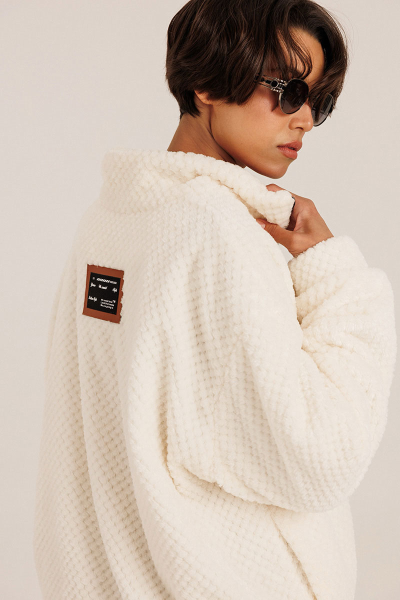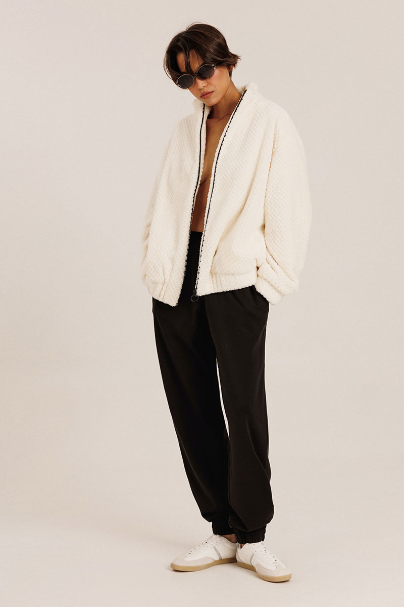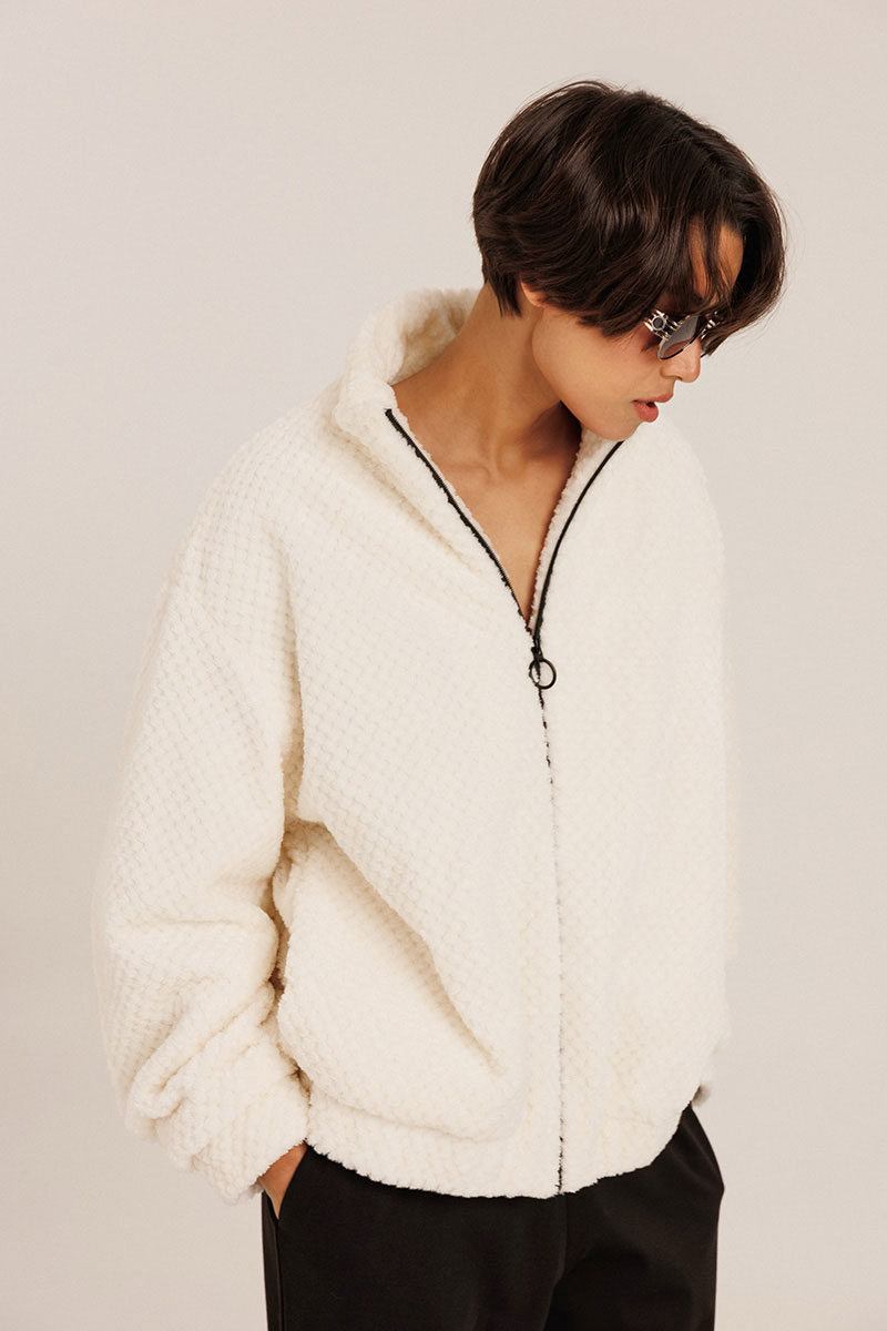 Жакет женский из искусственной ткани на подкладке. Воротник-стойка. В боковых швах обработаны карманы. На верхней части спинки настрочена декоративная нашивка. Рукав прямой, по низу обработан манжетой с эластичной тесьмой внутри. По низу жакета обтачная планка с эластичной тесьмой. Застежка на декоративную тесьму-молнию, входящую в воротник-стойку.