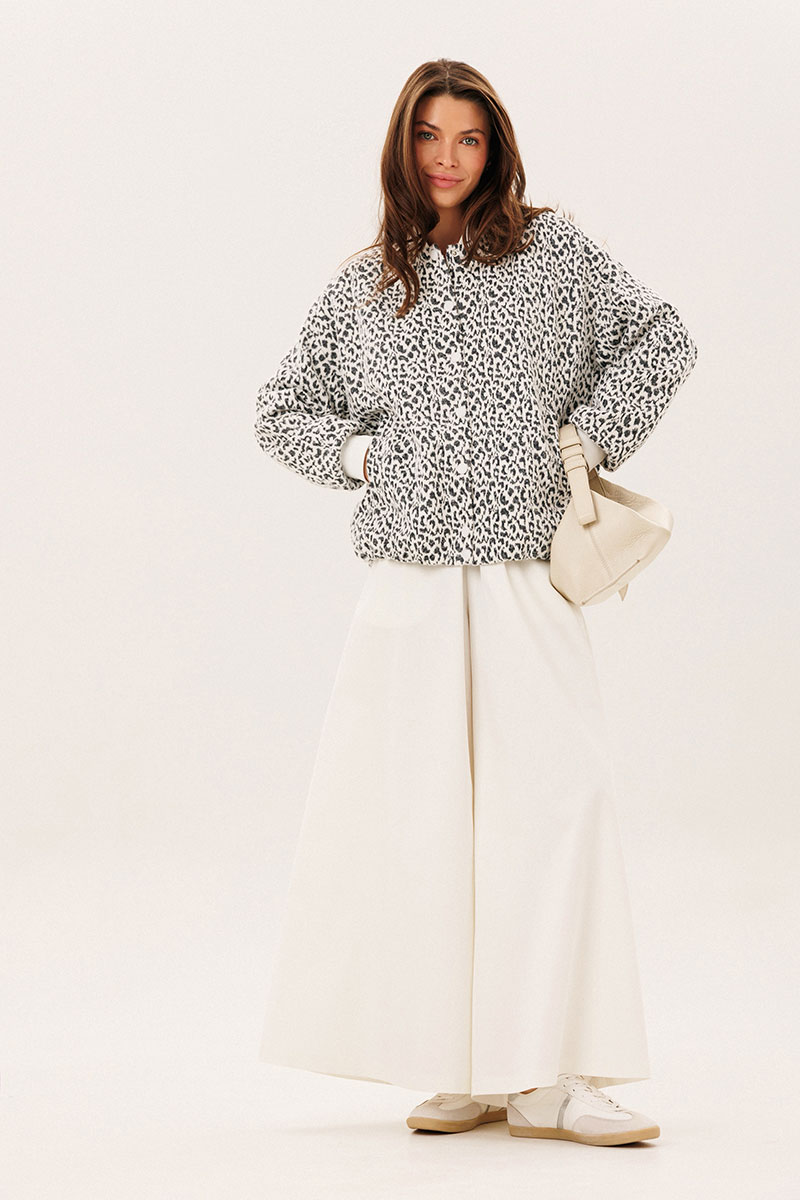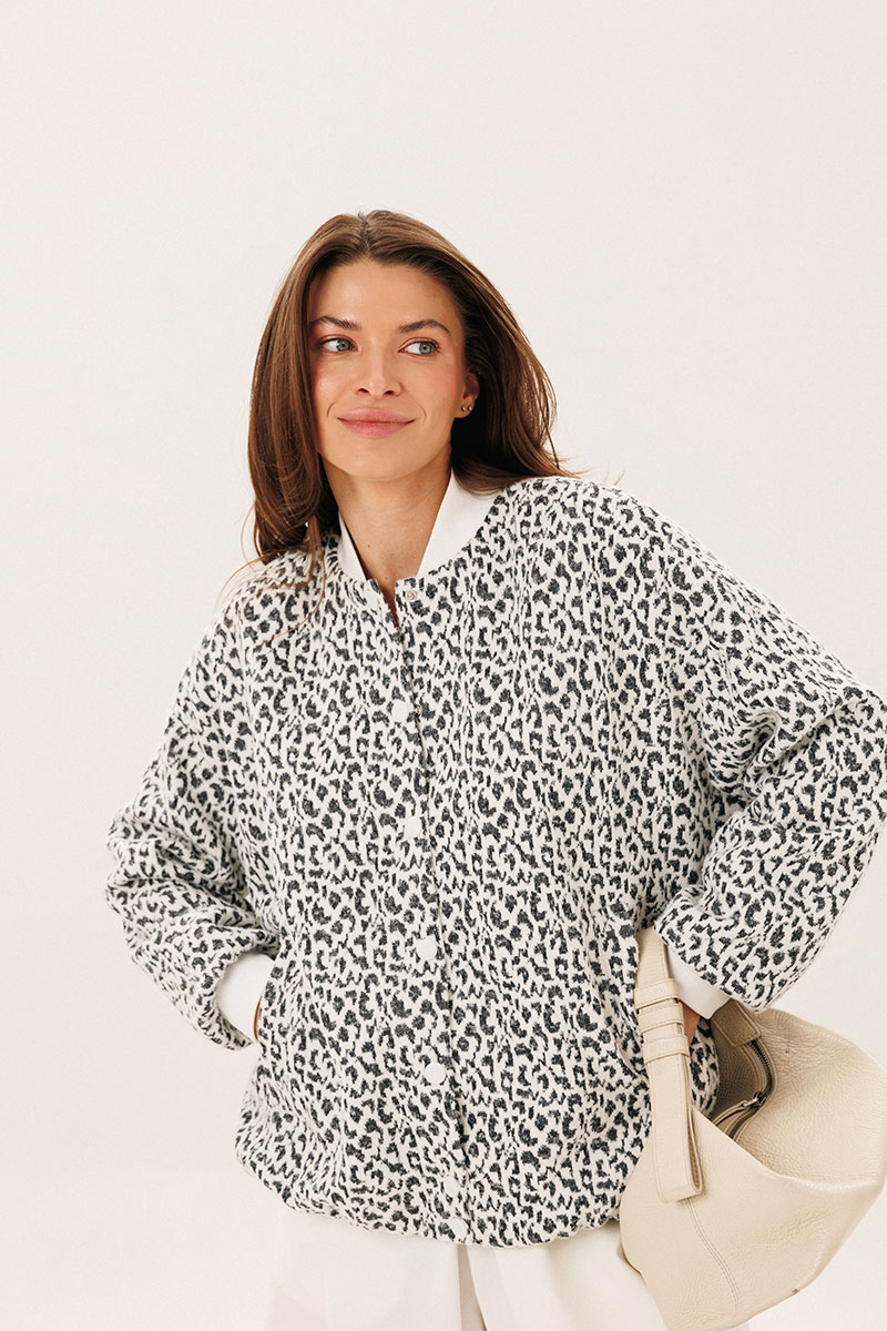 Бомбер прямого силуэта до линии бедер: свободный, на подкладке, со спущенной линией плеча. Воротник стойка, низ слегка собран на эластичную резинку. Рукав длинный с манжетой. По переду прорезные карманы. Застежка на кнопки.