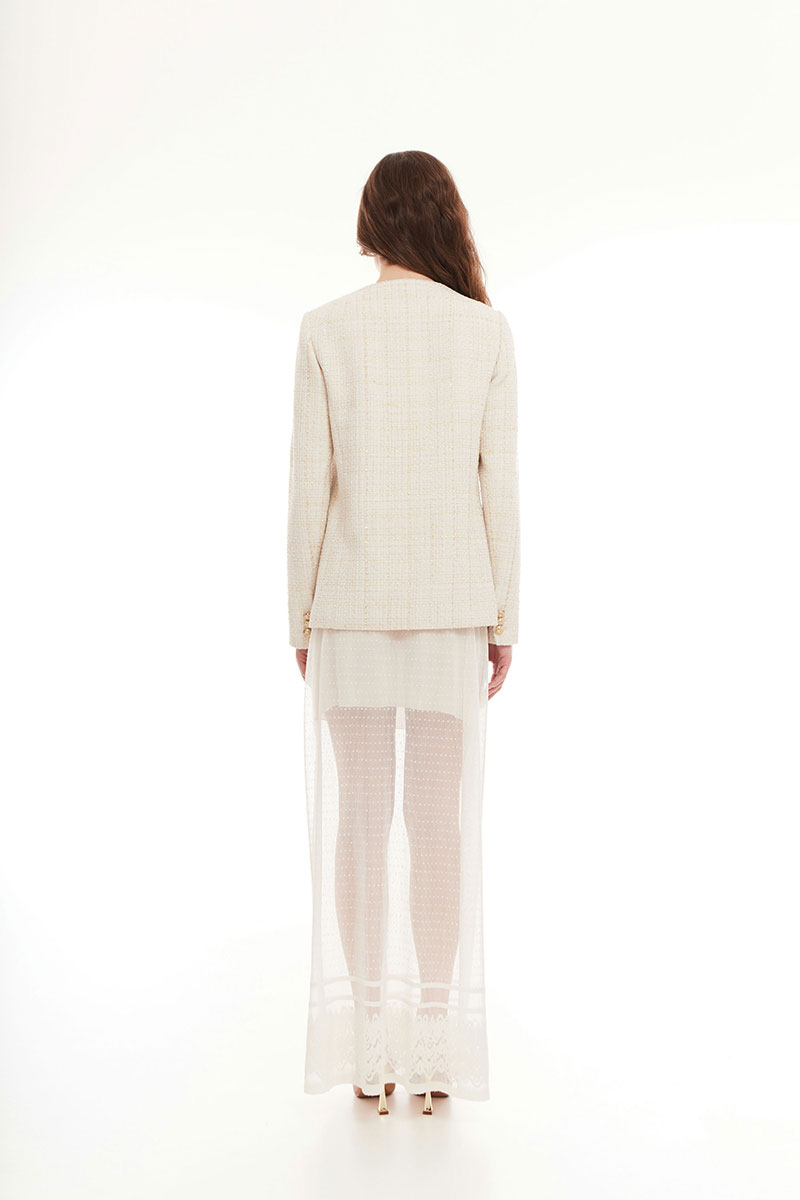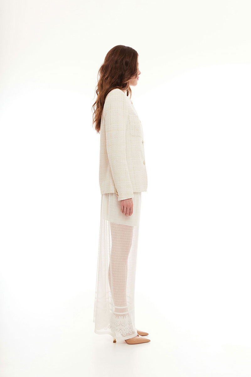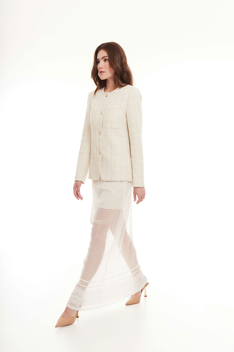 Жакет женский, однобортный, полуприлегающего силуэта, на подкладке, без воротника. Застежка на петли и пуговицы. На переде нагрудный накладной карман. Рукава втачные, в нижней части отлетная шлица с пуговицами и прорезными петлями.