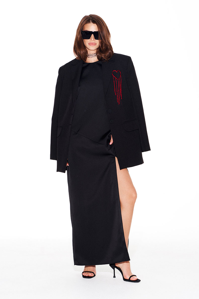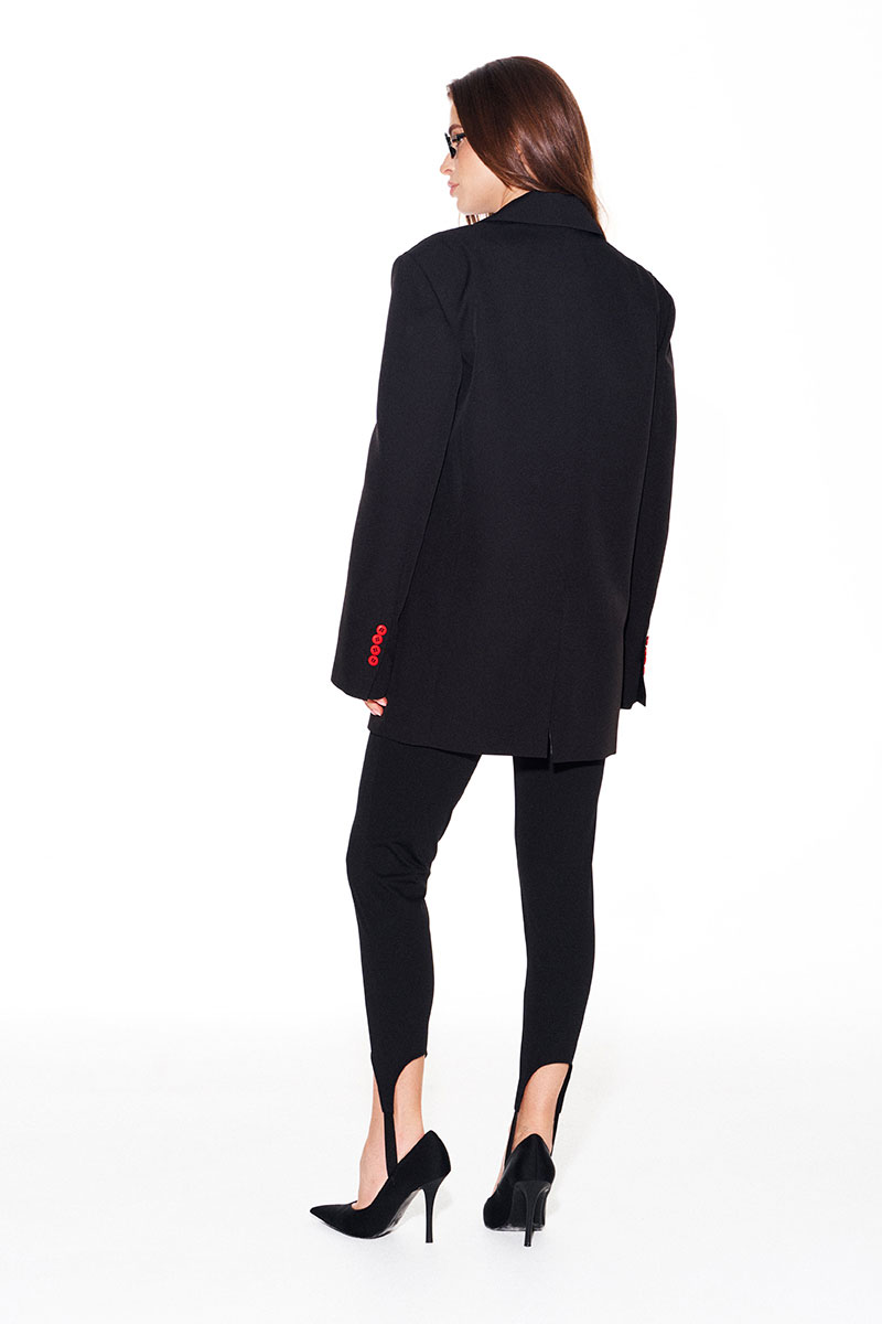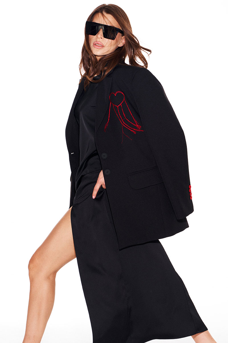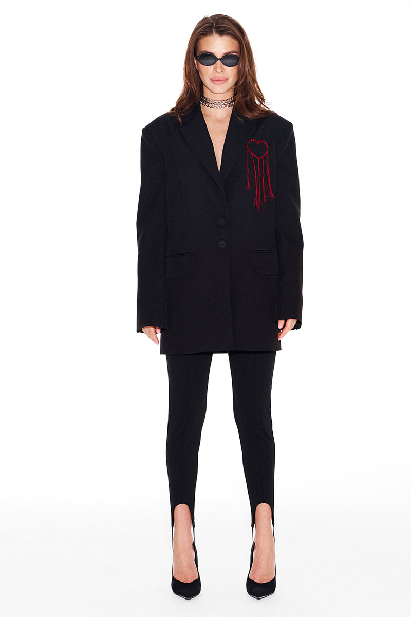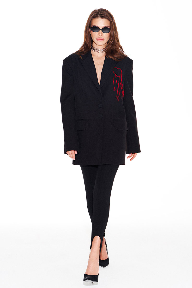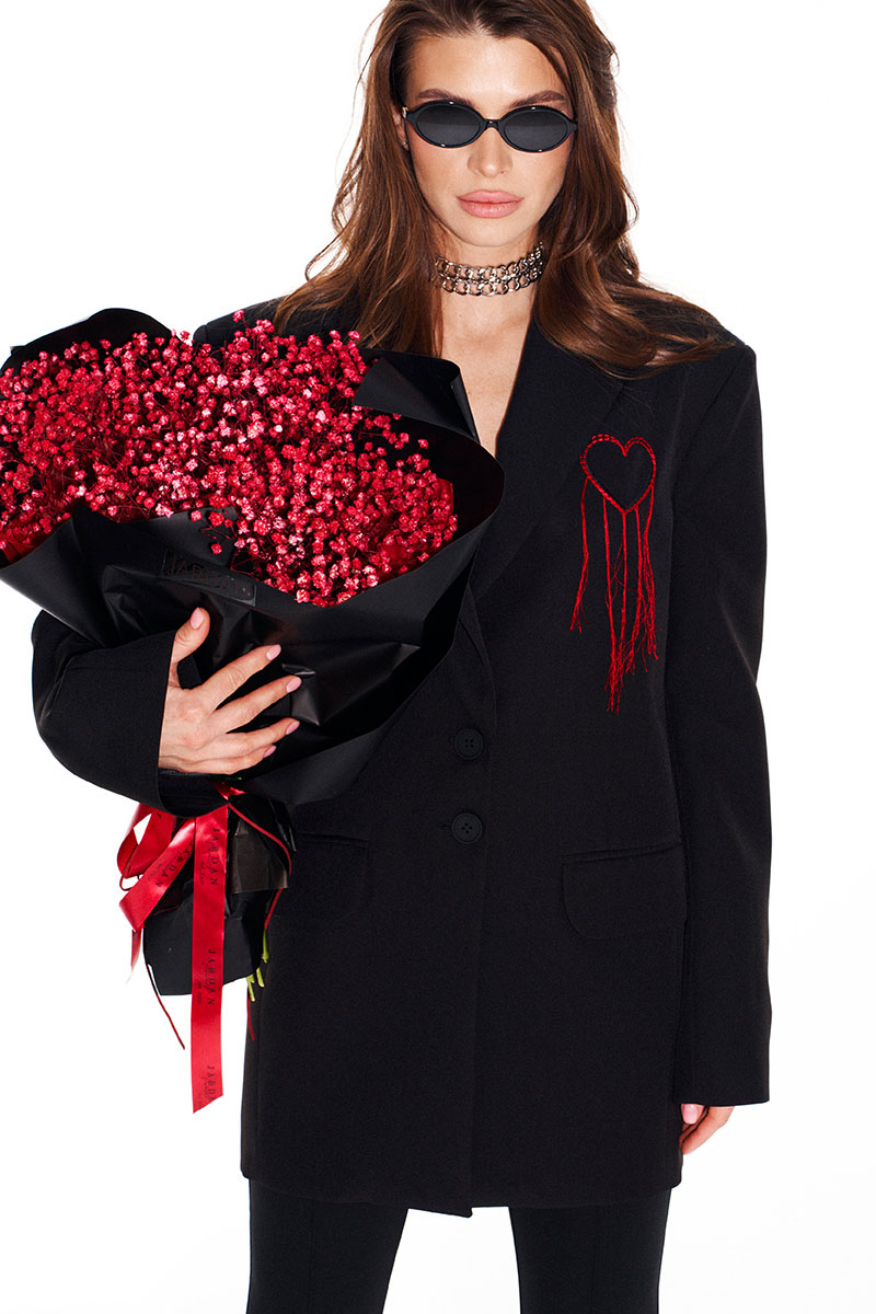 Жакет свободного объема, прямого силуэта, с центральной застежкой на 2 петли и 2 пуговицы, отложным воротником и лацканами пиджачного типа, на подкладке. Детали переда с талиевыми вытачками, отрезными бочками и прорезными карманами с клапанами и двумя обтачками. На левой полочке выполнена вышивка «Сердце». Спинка со средним швом, отрезными бочками и шлицей. Рукав втачной, двухшовный, длинный. В локтевых швах функциональные шлицы, застегивающиеся на 4 петли и 4 пуговицы.