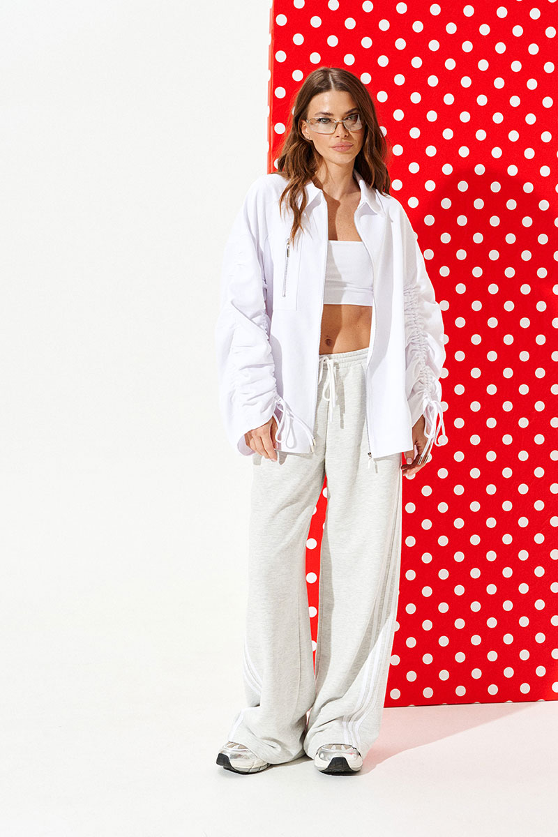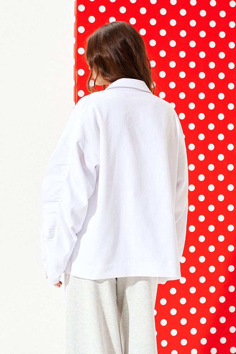 Блузон свободного объема, прямого силуэта, с центральной застежкой на тесьму-молнию. Воротник стояче-отложной с отрезной стойкой. На правой детали переда выполнен декоративный накладной карман с застежкой на тесьму-молнию. Спинка цельная. Боковые швы заканчиваются разрезами. Рукав втачной, трехшовный, длинный, с кулиской, в которую продет шнур-завязка. Локтевой шов со сборкой.