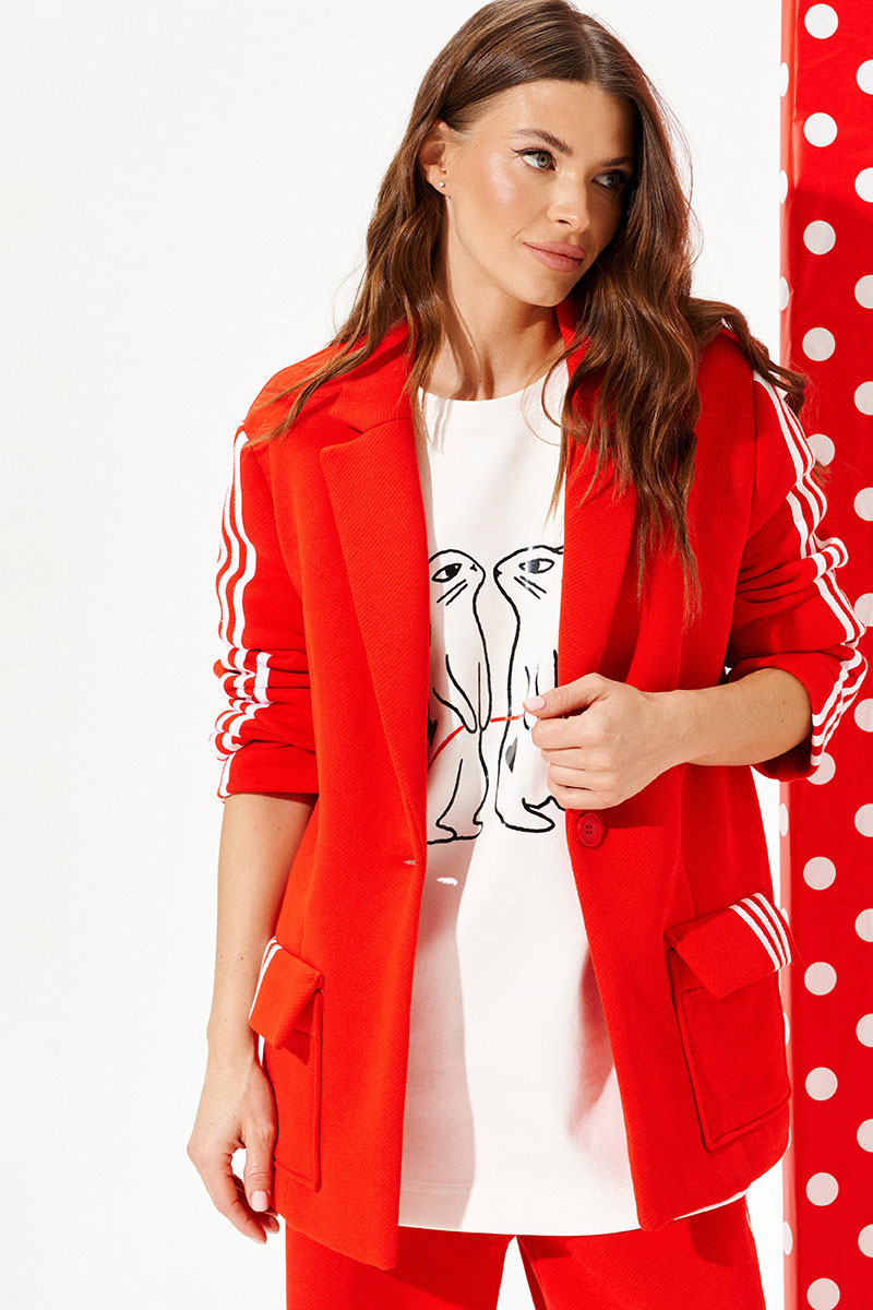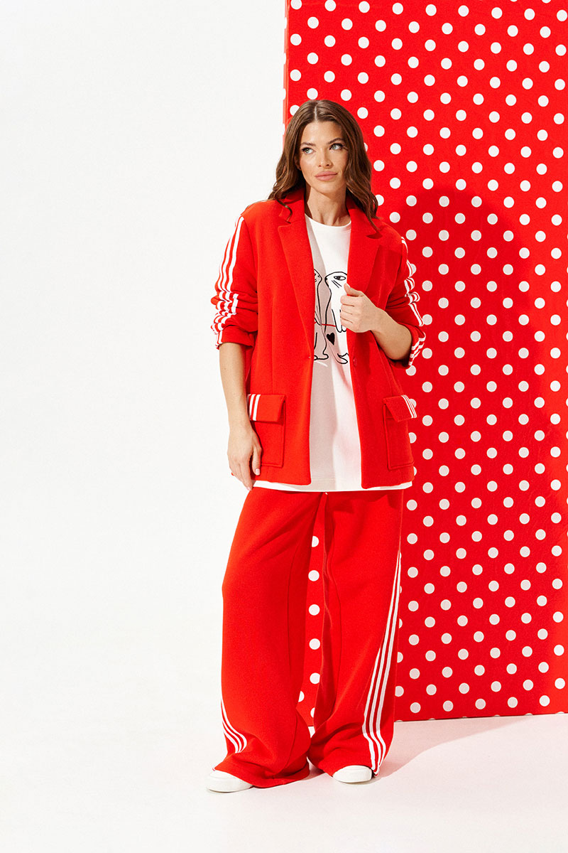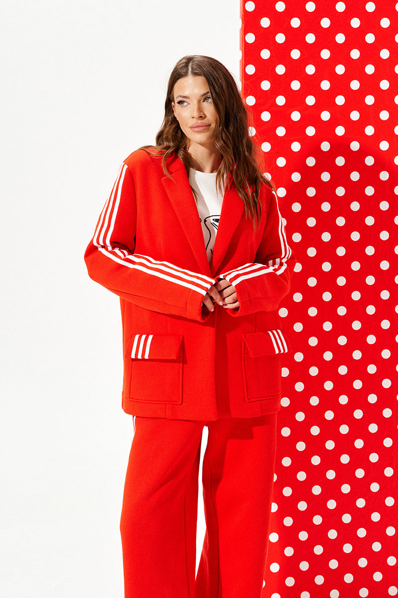 Жакет из трикотажного полотна свободного объема, прямого силуэта, с центральной застежкой на 1 обметанную петлю и 1 пуговицу, отложным воротником и лацканами пиджачного типа. Детали переда с талиевыми вытачками и накладными карманами с клапаном. Спинка со средним швом. Рукав втачной, двухшовный, длинный. Рукава и клапаны декорированы декоративной тесьмой.