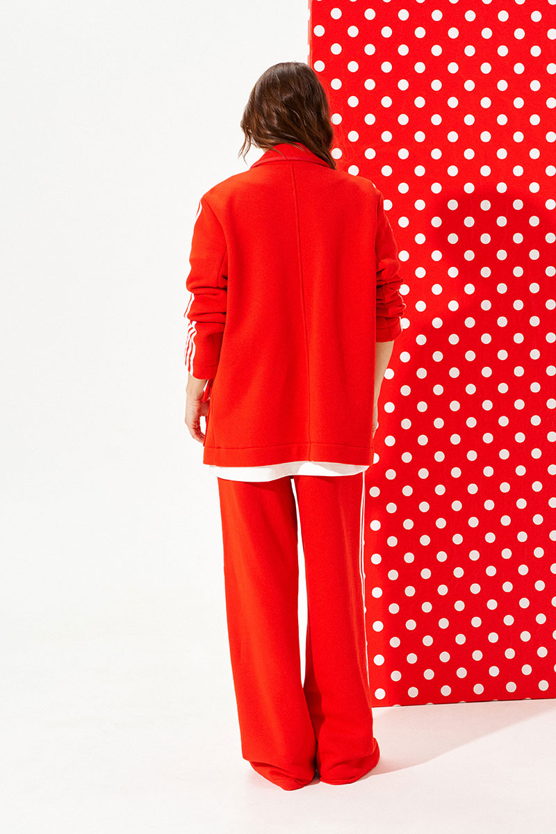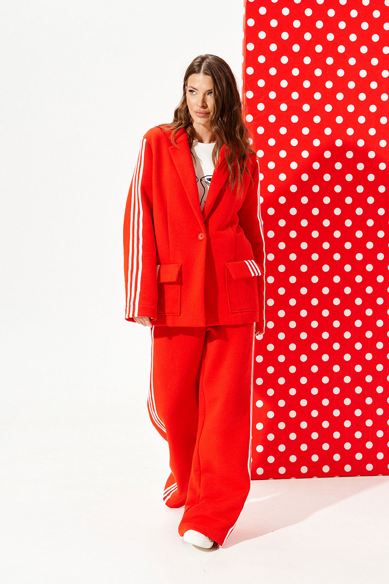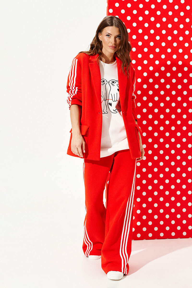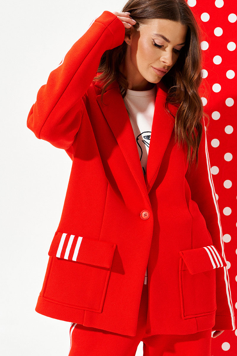 Жакет из трикотажного полотна свободного объема, прямого силуэта, с центральной застежкой на 1 обметанную петлю и 1 пуговицу, отложным воротником и лацканами пиджачного типа. Детали переда с талиевыми вытачками и накладными карманами с клапаном. Спинка со средним швом. Рукав втачной, двухшовный, длинный. Рукава и клапаны декорированы декоративной тесьмой.