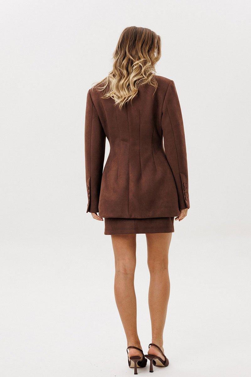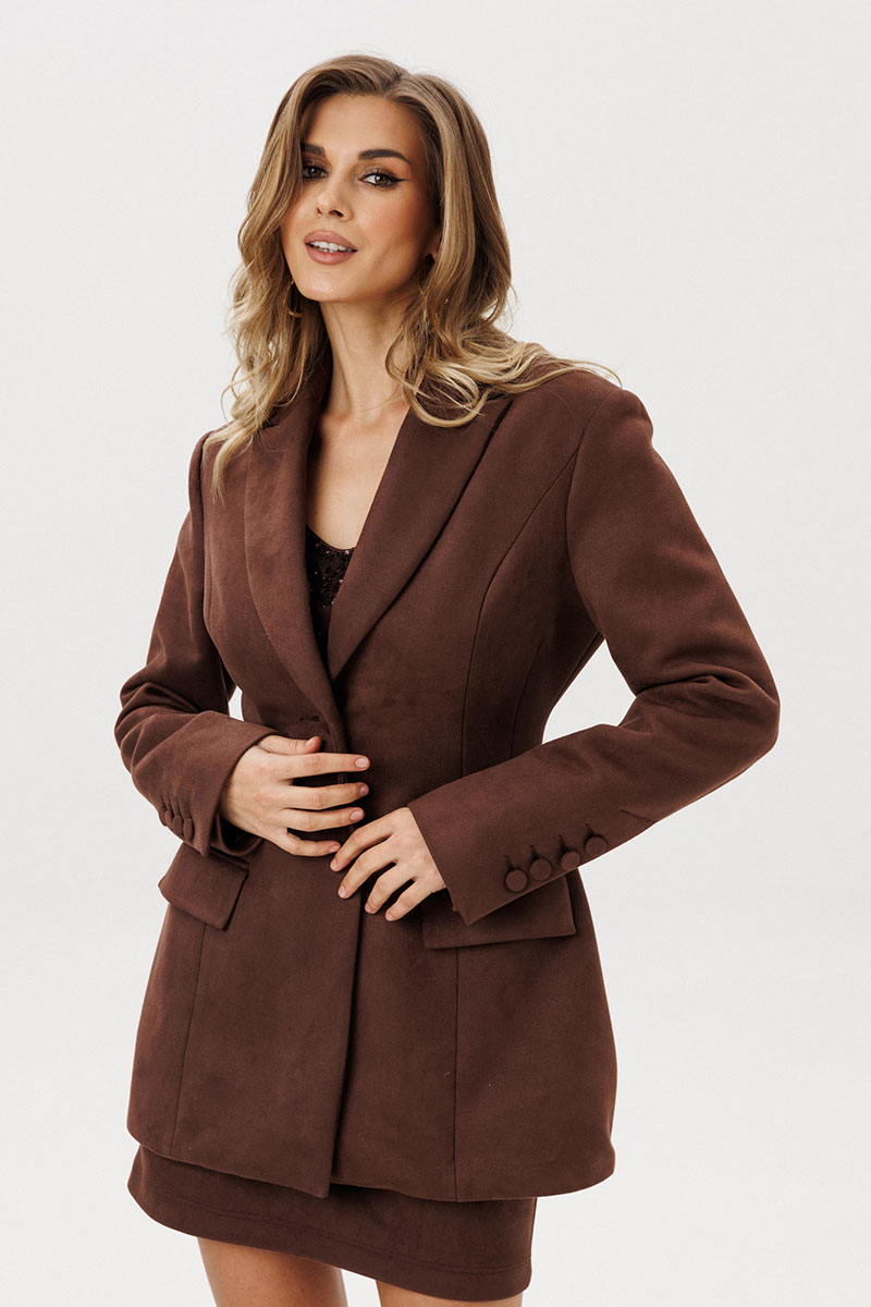 Жакет выполнине из плотной искуственной замши. Жакет Х-обраного силуэта, длиной ниже линии бедер. Спереди рельефы от проймы до низа, прорезные карманы с клапанами и центральная бортовая застежка на пуговицы. Воротник пиджачного типа. На спинке средний шов. Плечевой шов удлинен. Рукав втачной, двухшовный, по низу заднего шва шлица с застежкой на пуговицы. Жакет на притачной по низу подкладке.