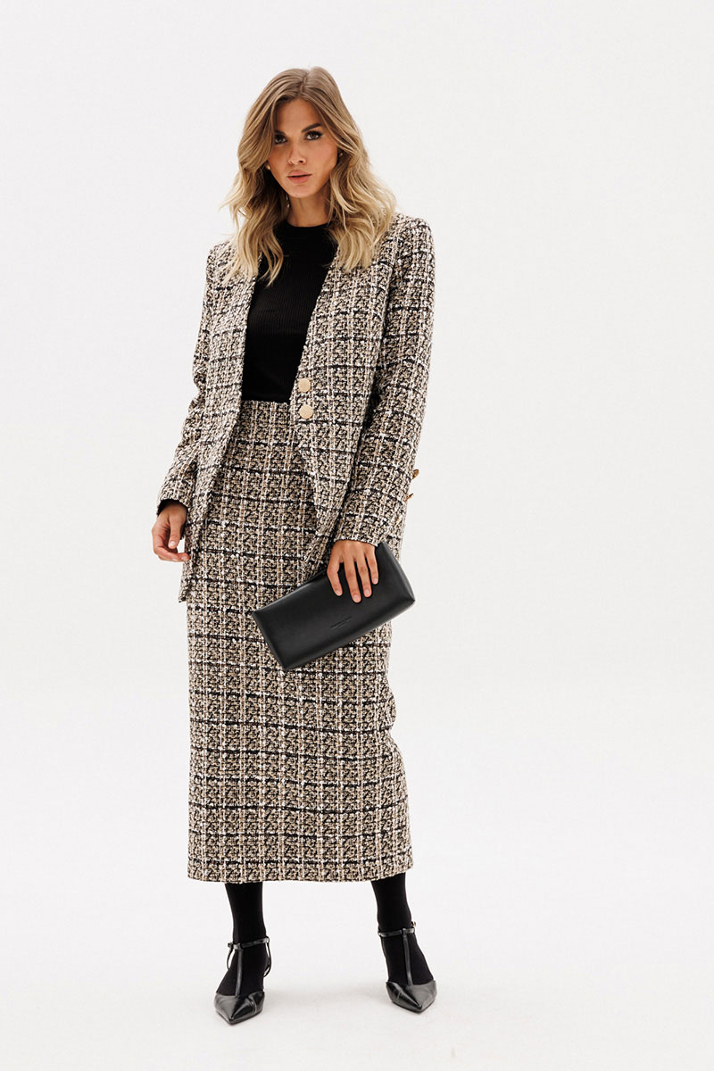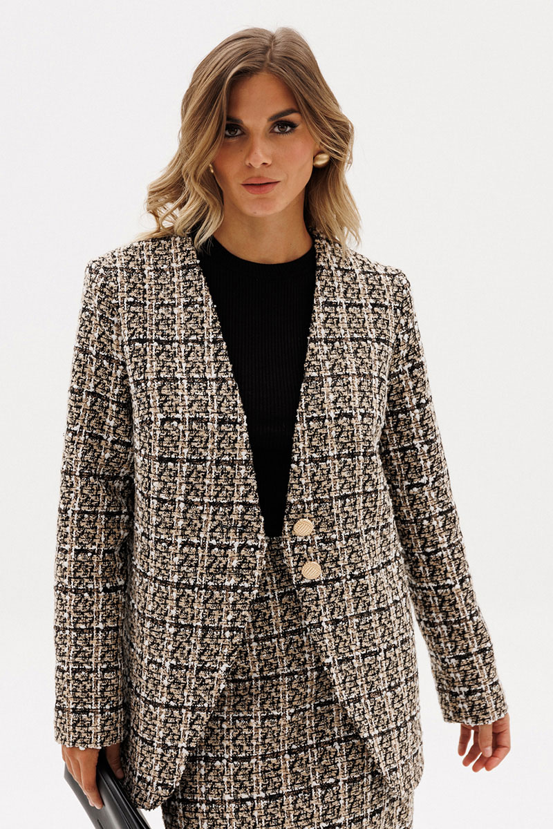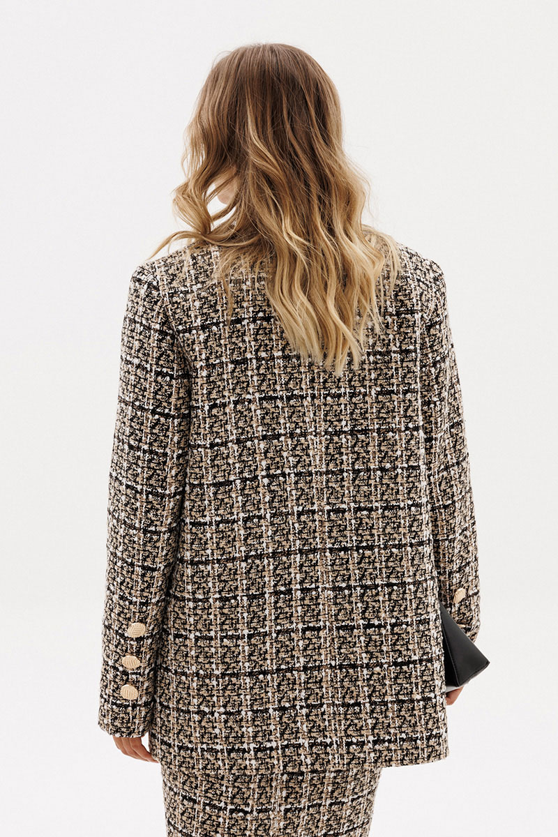 Жакет выполнен из твида. Жакет прямого силуэта, длиной до линии бедер. Спереди центральная застежка на пуговицы. Край борта фигурной формы. На спинке средний шов. Горловина V-образной формы. Рукав втачной двухшовный с декоративными пуговицами. Жакет на притачной по низу подкладке.
