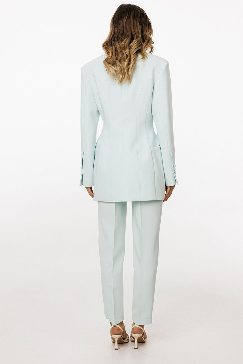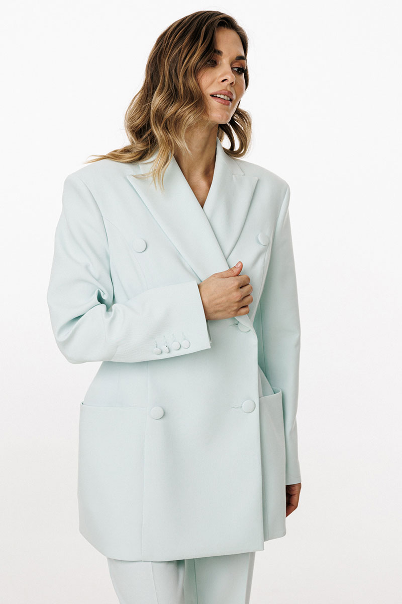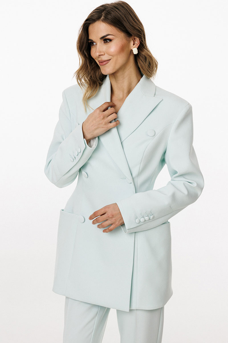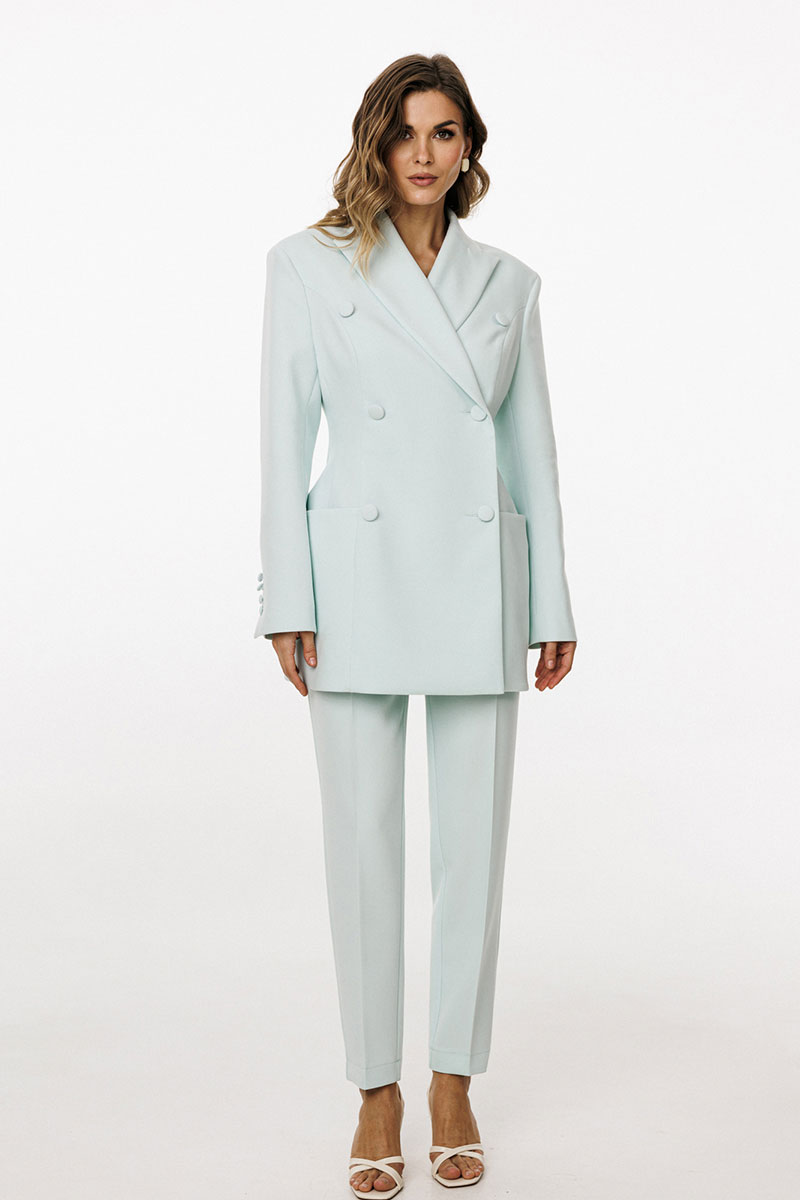 Жакет выполнен из костюмной ткани. Жакет К-образного силуэта, длиной ниже линии бедер. По переду обработаны рельефы от проймы до низа, талиевые вытачки, горизонтальные подрезы, переходящие на спинку, в которых обработаны карманы и лацканы. На спинке обработаны две пары рельефов от проймы до низа и средний шов. Воротник пиджачного типа. Жакет с плечевыми накладками, плечевой шов удлинен. Рукав втачной, двухшовный. По низу рукав обработан шлицей, застёгивающеюся на 4 петли и пуговицы. Жакет двубортный, на притачной по низу подкладке.