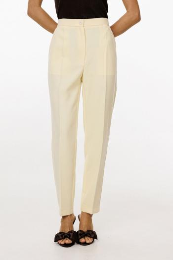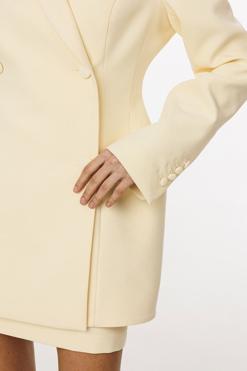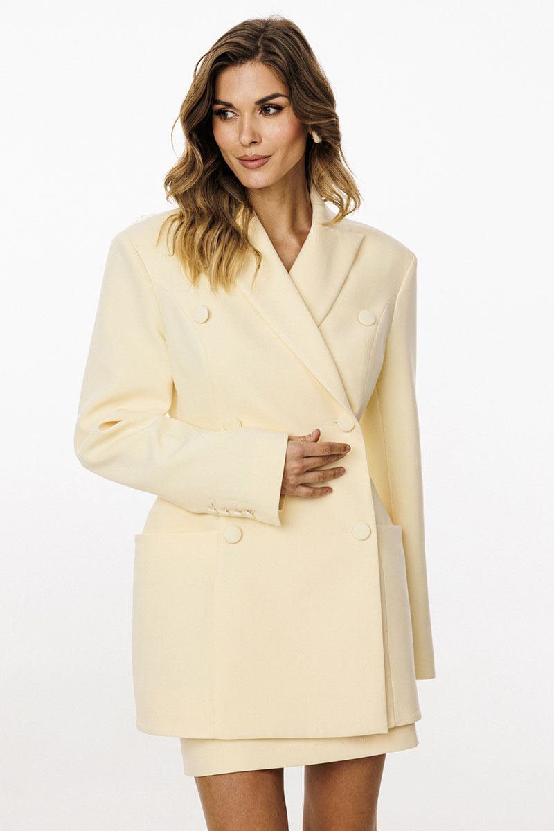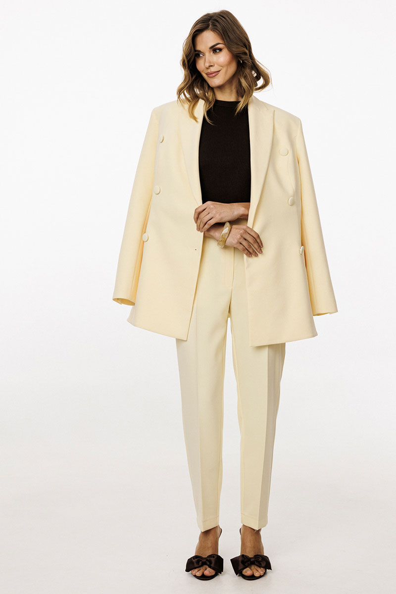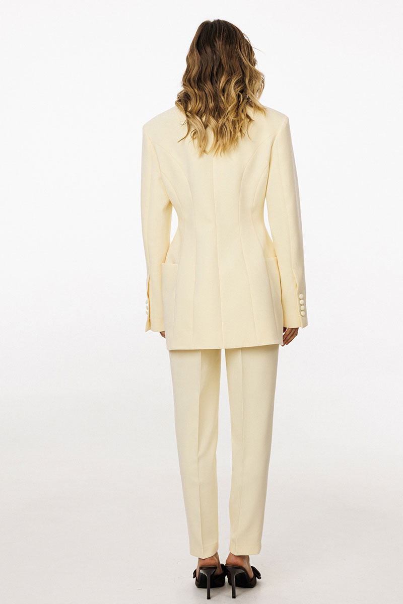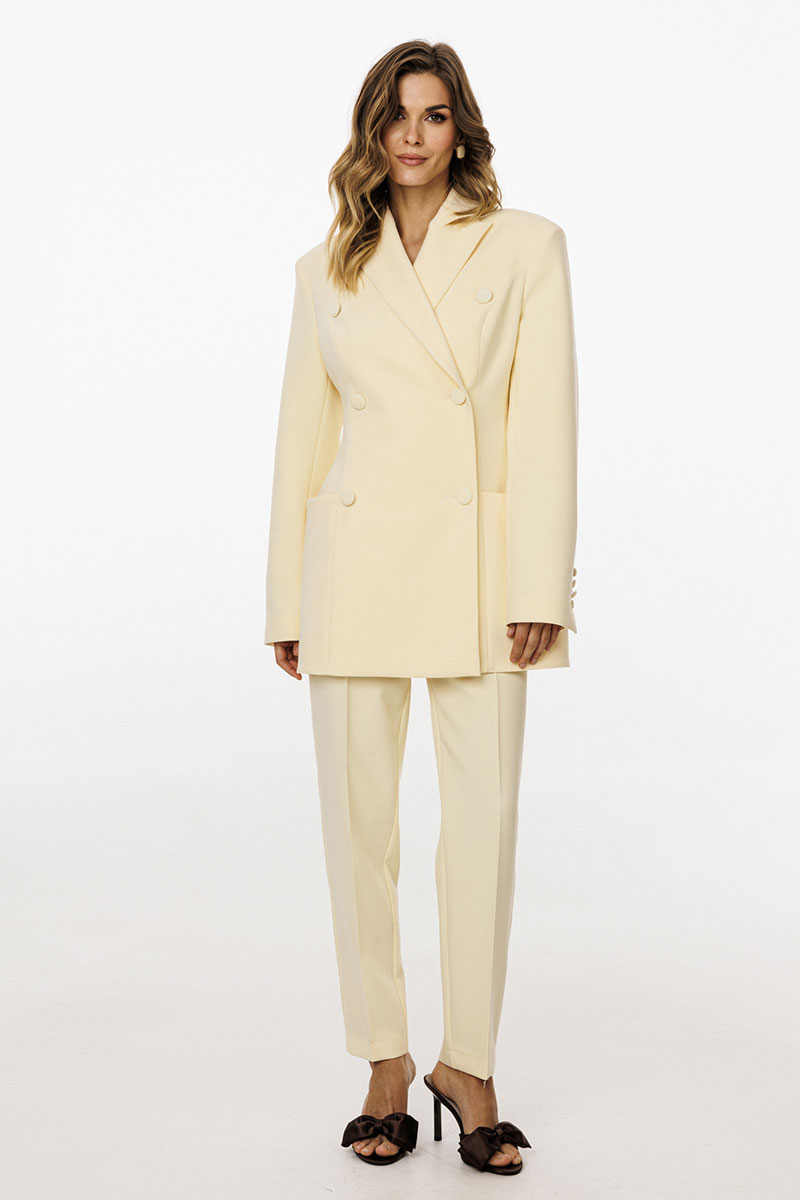 Жакет выполнен из костюмной ткани. Жакет К-образного силуэта, длиной ниже линии бедер. По переду обработаны рельефы от проймы до низа, талиевые вытачки, горизонтальные подрезы, переходящие на спинку, в которых обработаны карманы и лацканы. На спинке обработаны две пары рельефов от проймы до низа и средний шов. Воротник пиджачного типа. Жакет с плечевыми накладками, плечевой шов удлинен. Рукав втачной, двухшовный. По низу рукав обработан шлицей, застёгивающеюся на 4 петли и пуговицы. Жакет двубортный, на притачной по низу подкладке.