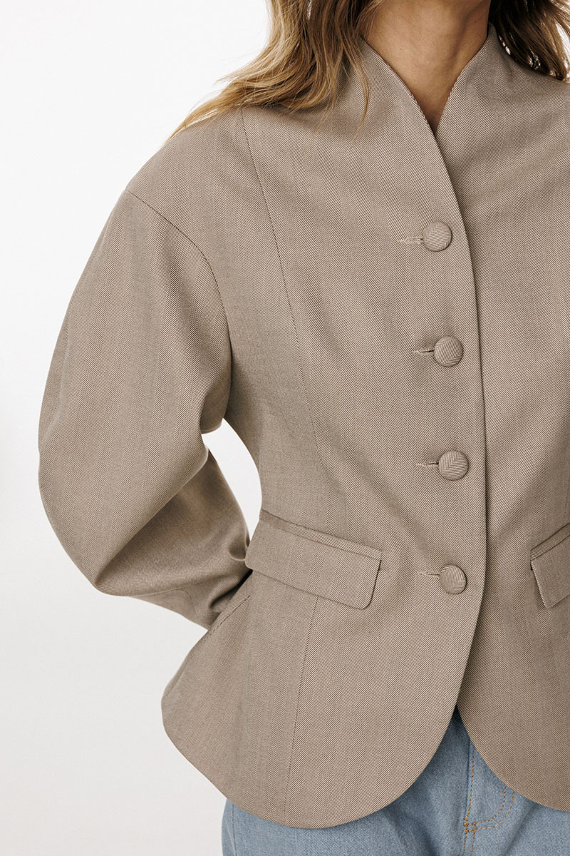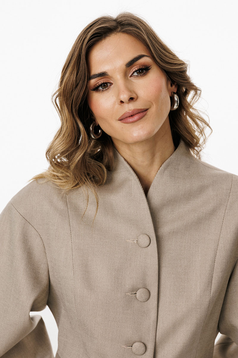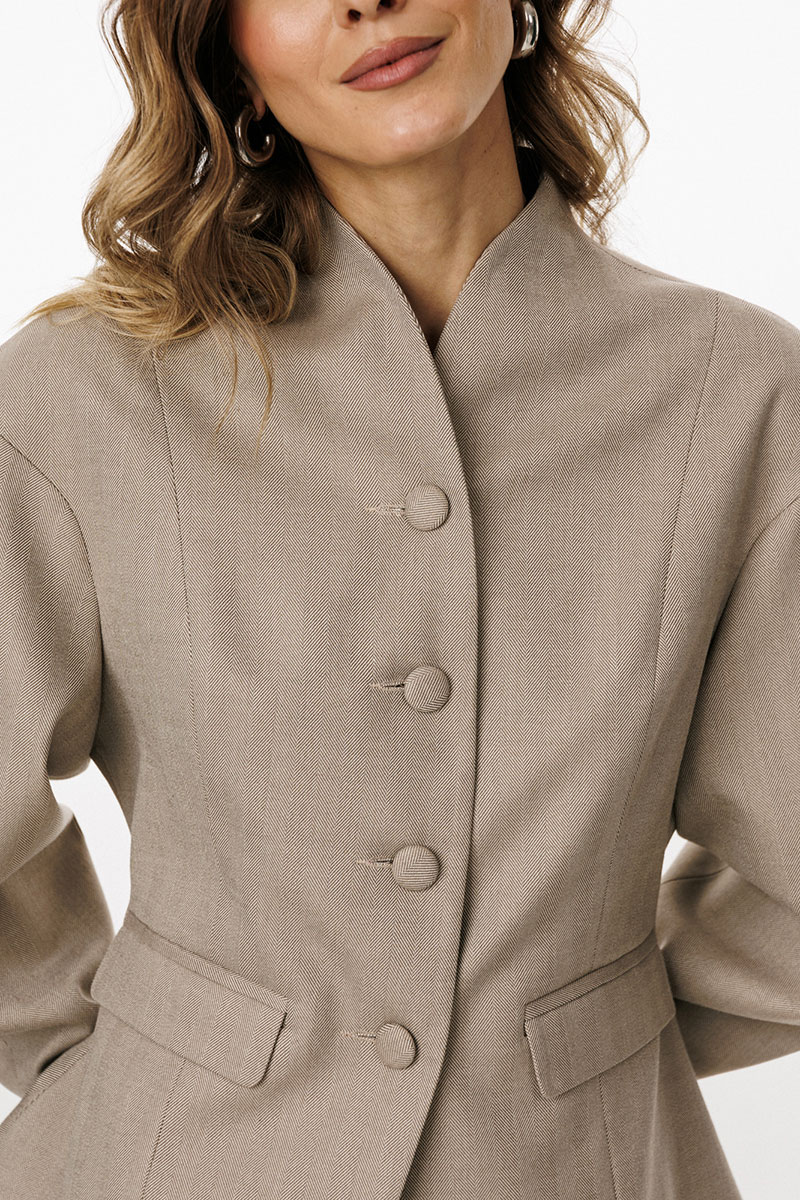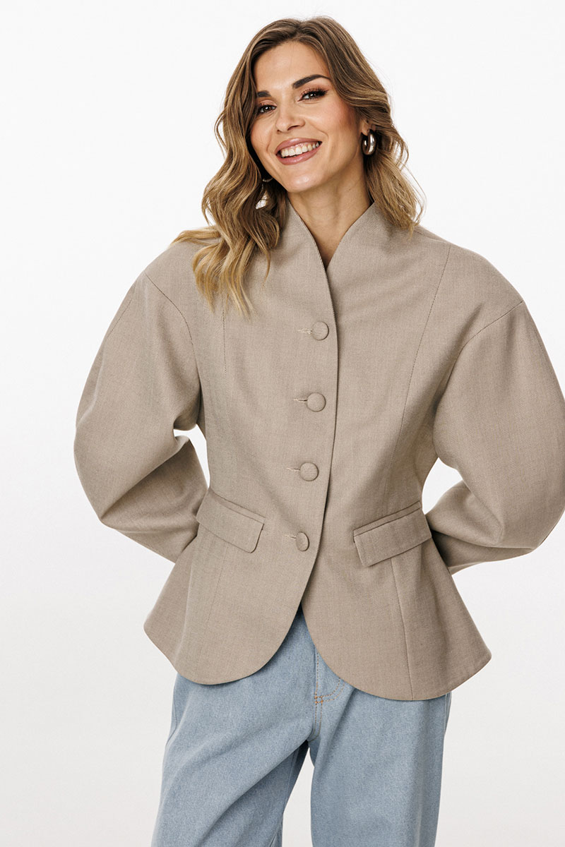 Жакет выполнен из костюмной ткани. Жакет О-образного силуэта, длиной до линии бедер. По переду обработаны рельефы от плечевого шва до низа, прорезные карманы с клапанами, и центральная бортовая застежка на 4 петли и пуговицы. Низ борта округлой формы. На спинке обработаны два рельефа от горловины до низа и средний шов. Горловина округлой формы, обработана цельнокроеным воротником-стойкой. Плечевой шов удлинен. Рукав фигурной формы, двухшовный, заужен к низу. Жакет с плечевыми накладками.
