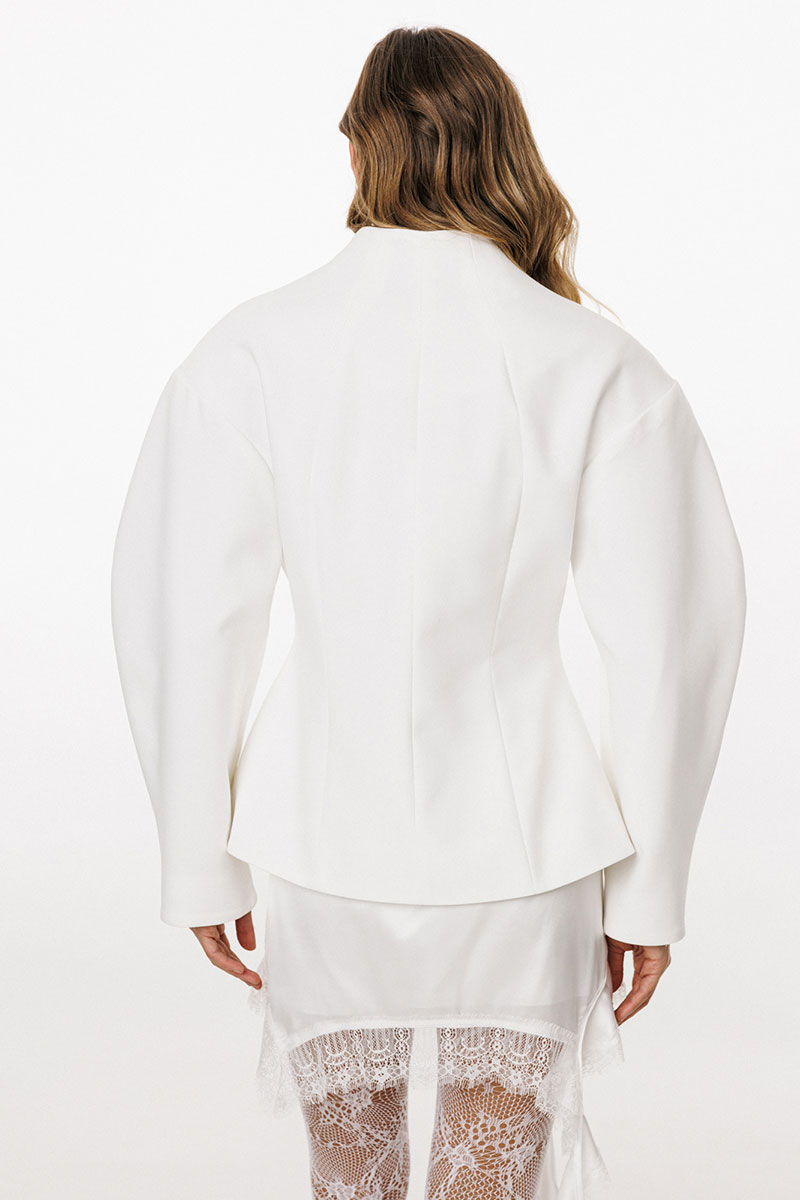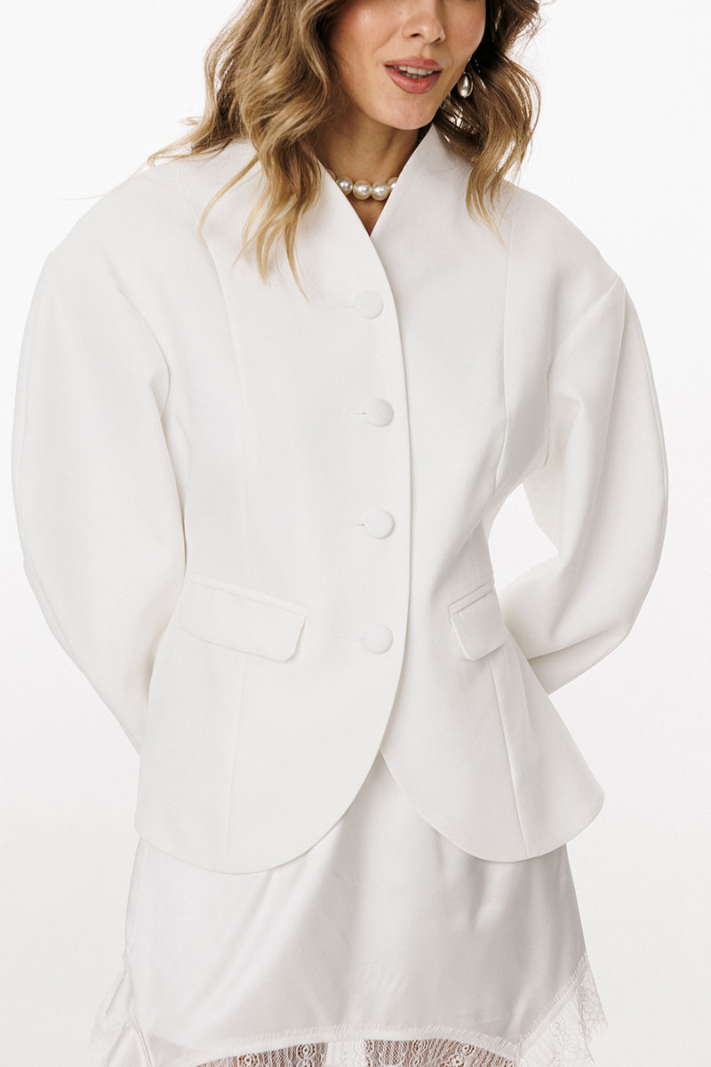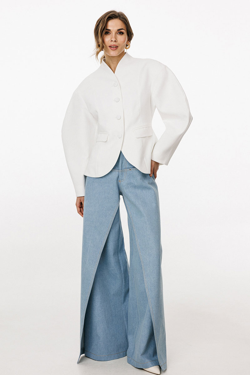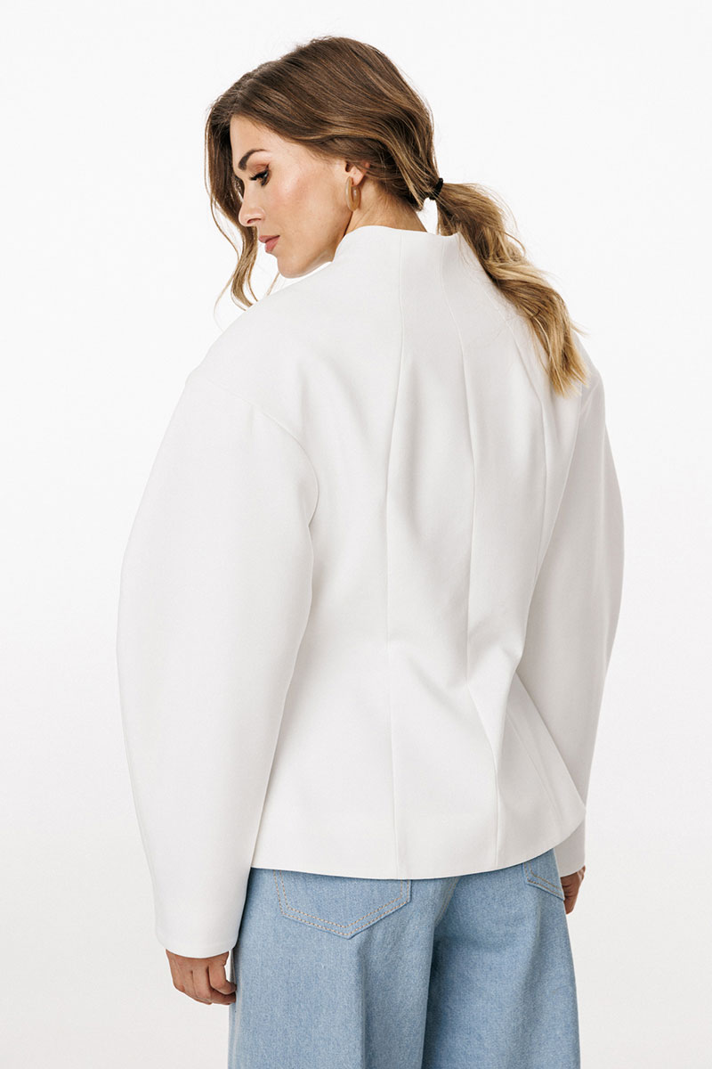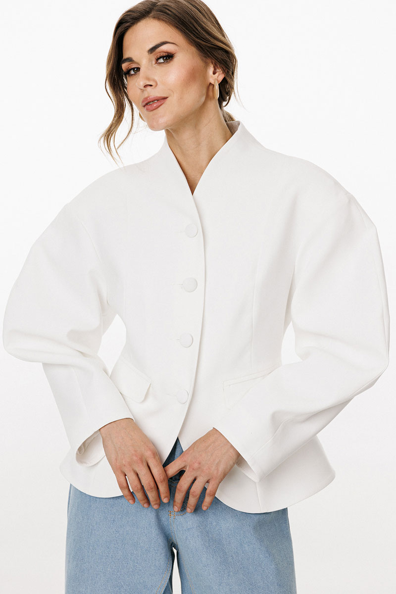 Жакет выполнен из костюмной ткани. Жакет О-образного силуэта, длиной до линии бедер. По переду обработаны рельефы от плечевого шва до низа, прорезные карманы с клапанами, и центральная бортовая застежка на 4 петли и пуговицы. Низ борта округлой формы. На спинке обработаны два рельефа от горловины до низа и средний шов. Горловина округлой формы, обработана цельнокроеным воротником-стойкой. Плечевой шов удлинен. Рукав фигурной формы, двухшовный, заужен к низу. Жакет с плечевыми накладками.