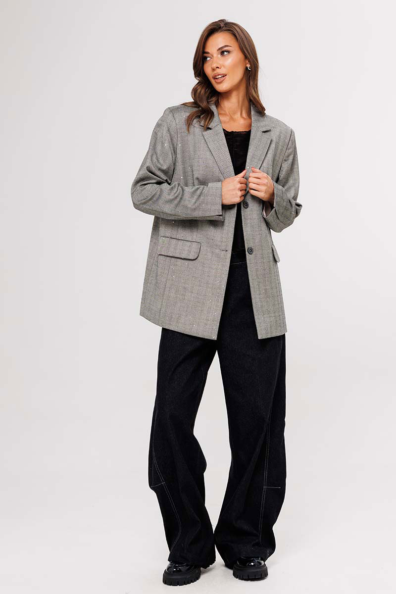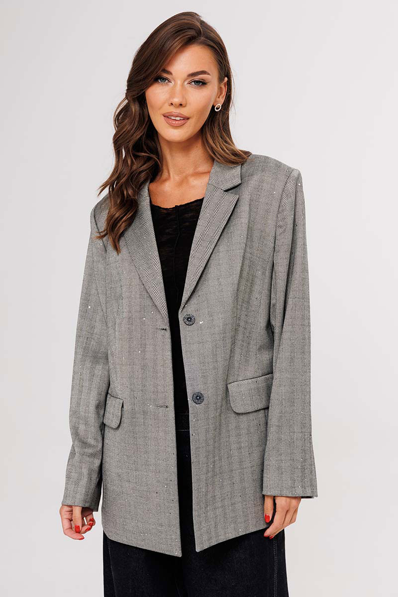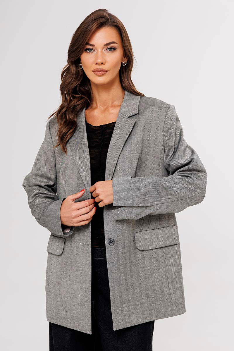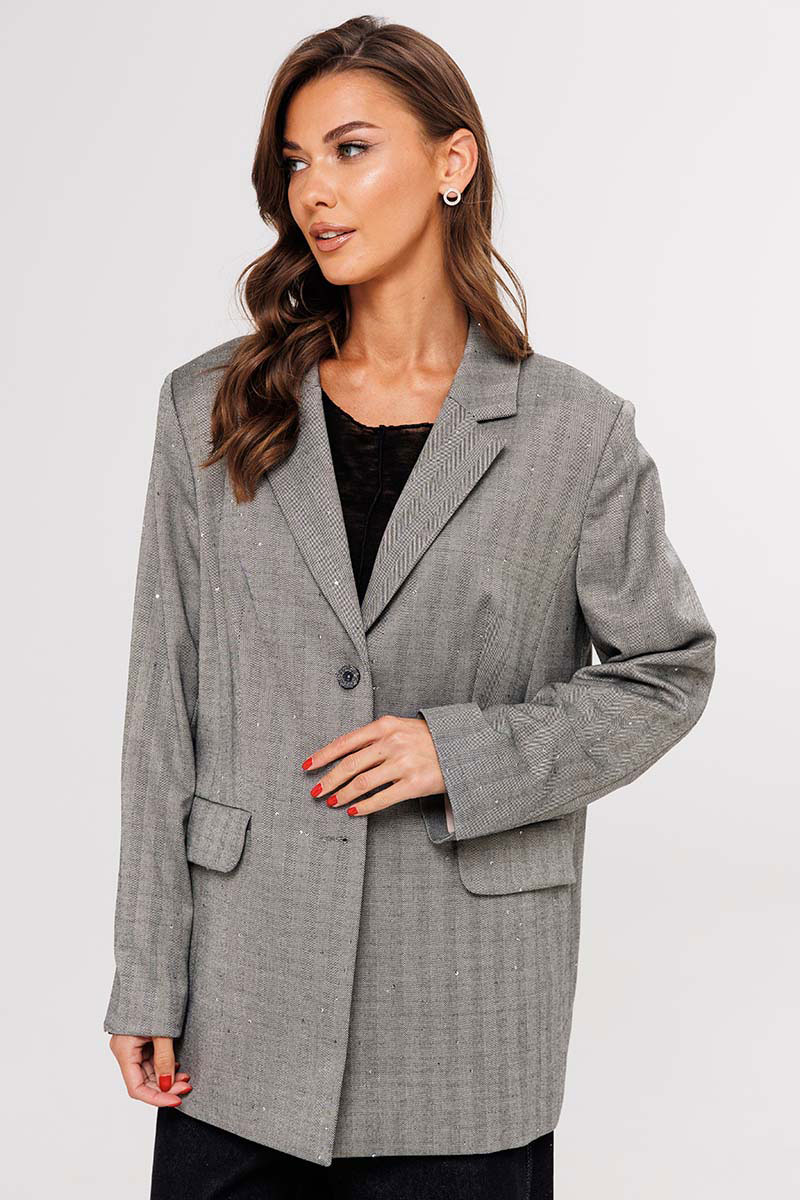 Жакет свободного расширенного силуэта, втачного покроя с центральной застёжкой и классическим английским воротником. Полочка с отрезным бочком, нагрудной вытачкой и прорезным карманом с клапаном. Спинка с центральным швом, шлицей и отрезным бочком. Рукав двухшовный с отлетной шлицей. Элегантность и нарядность жакету придает ткань в мелкую рассыпную пайетку.