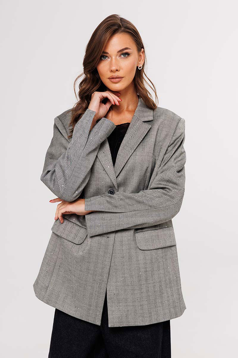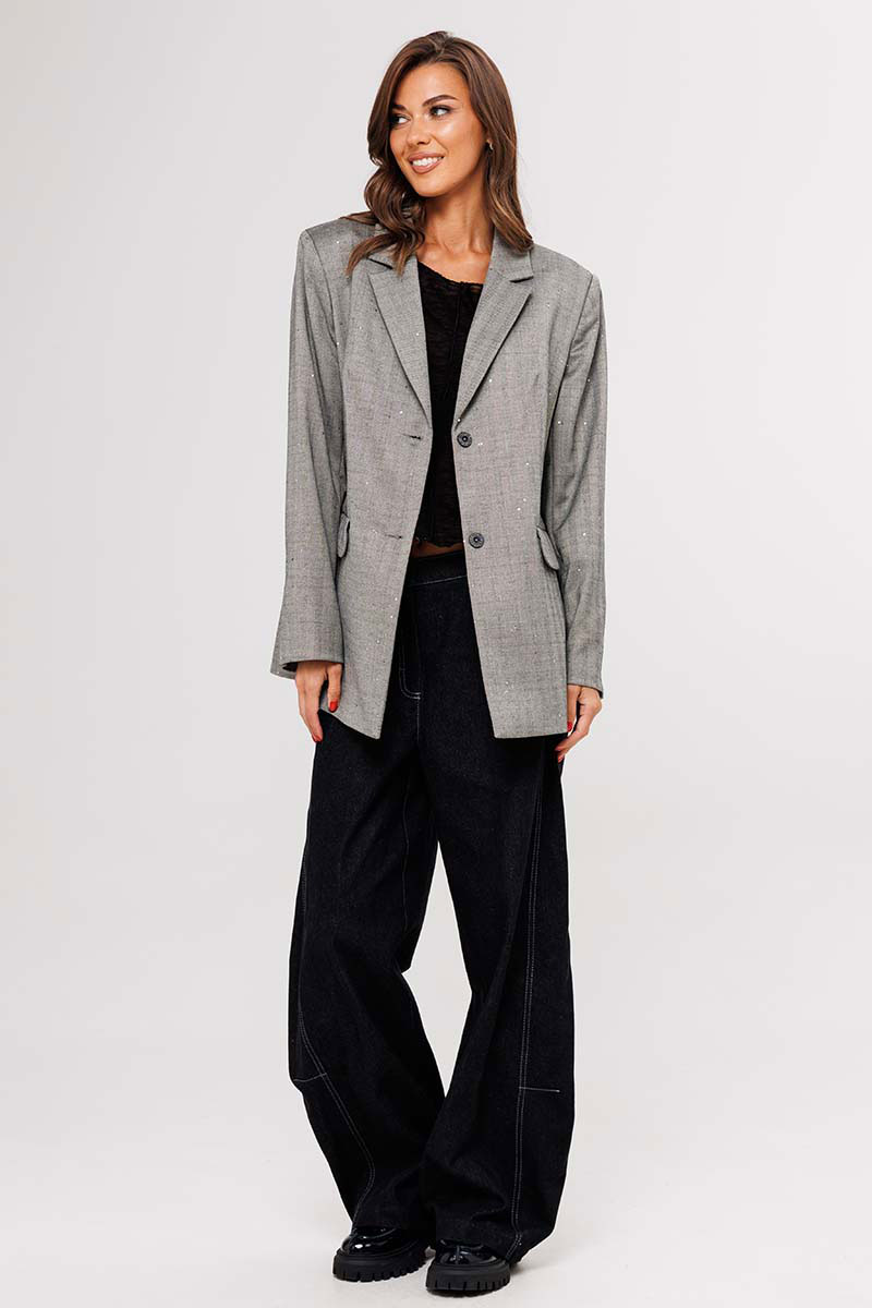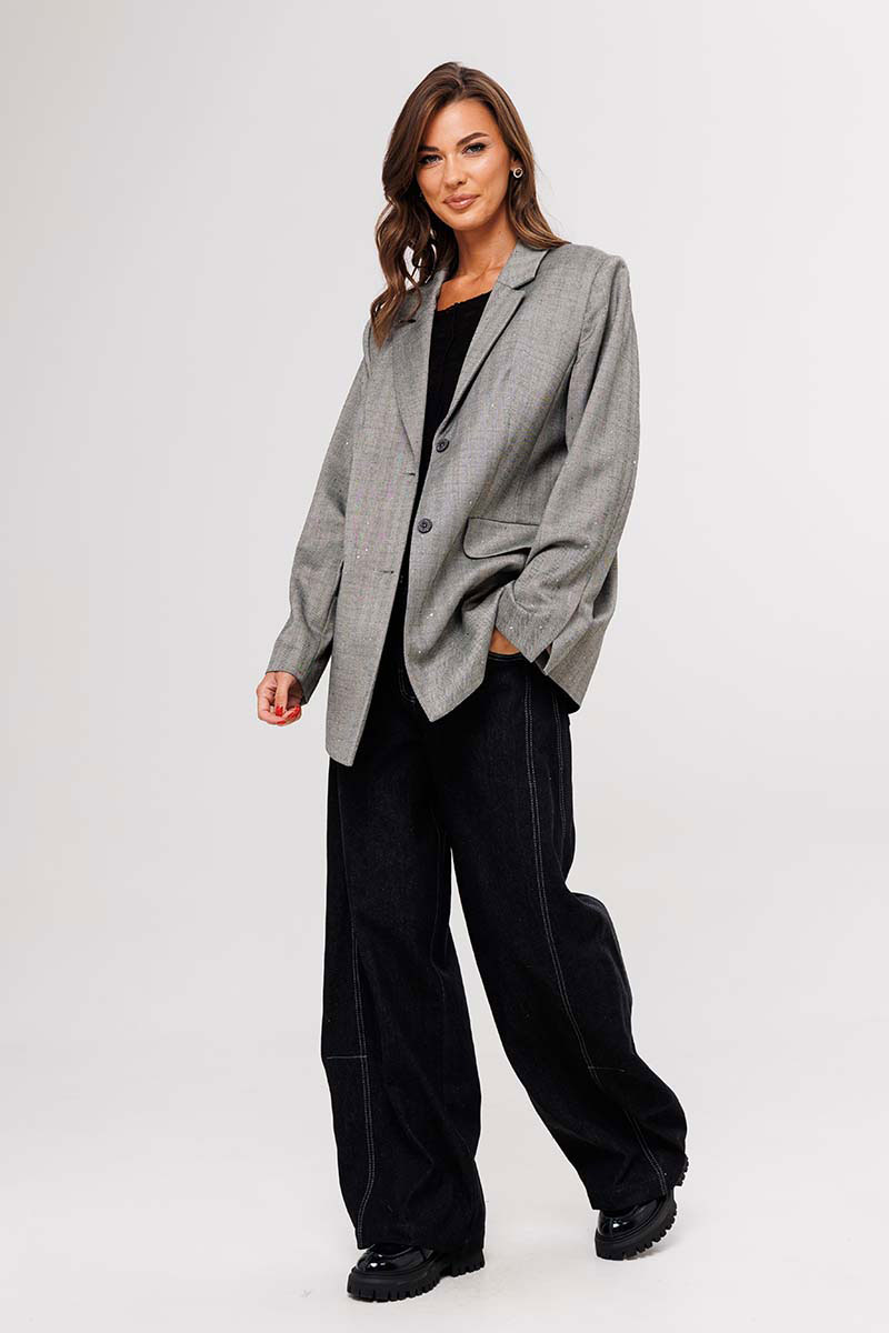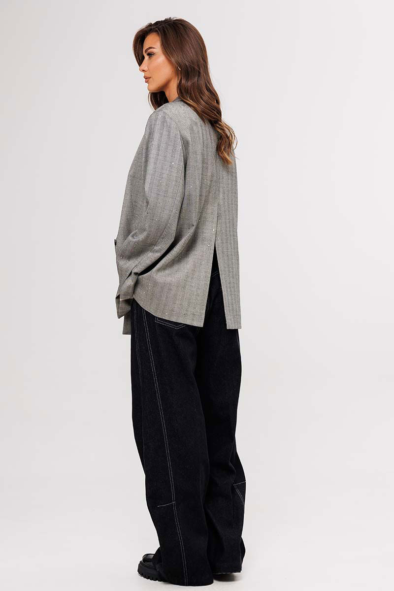 Жакет свободного расширенного силуэта, втачного покроя с центральной застёжкой и классическим английским воротником. Полочка с отрезным бочком, нагрудной вытачкой и прорезным карманом с клапаном. Спинка с центральным швом, шлицей и отрезным бочком. Рукав двухшовный с отлетной шлицей. Элегантность и нарядность жакету придает ткань в мелкую рассыпную пайетку.