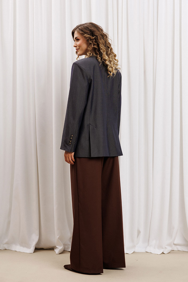 Жакет прямого свободного силуэта из костюмной ткани. Воротник пиджачного типа, застежка обнобортная на 4 петли и пуговицы. Перед с талиевой вытачкой и карманом с клапаном в рамку, с рельефом. Спинка со средним швом и рельефами, в рельефах шлица. Рукав втачной одношовный со шлицей и 4-мя пуговицами. Жакет на подкладке.