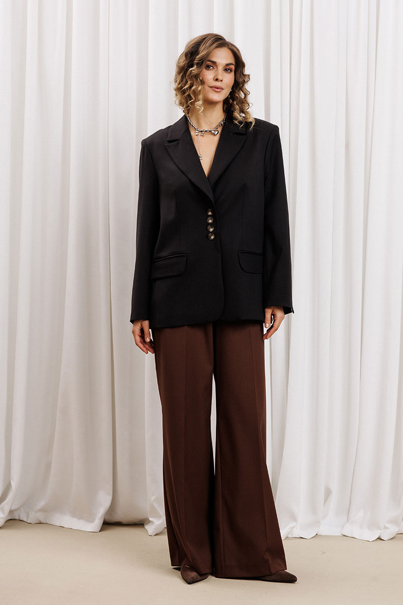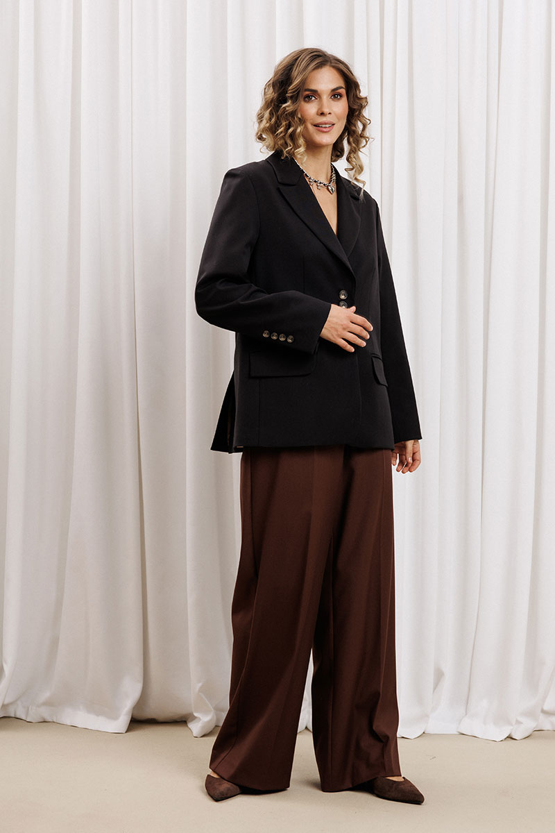 Жакет прямого свободного силуэта из костюмной ткани. Воротник пиджачного типа, застежка обнобортная на 4 петли и пуговицы. Перед с талиевой вытачкой и карманом с клапаном в рамку, с рельефом. Спинка со средним швом и рельефами, в рельефах шлица. Рукав втачной одношовный со шлицей и 4-мя пуговицами. Жакет на подкладке.