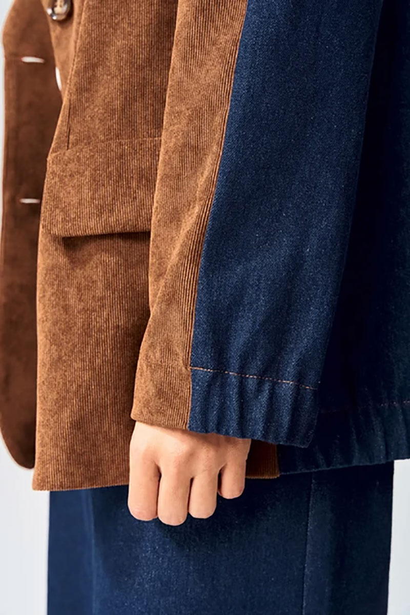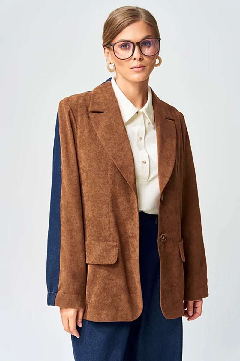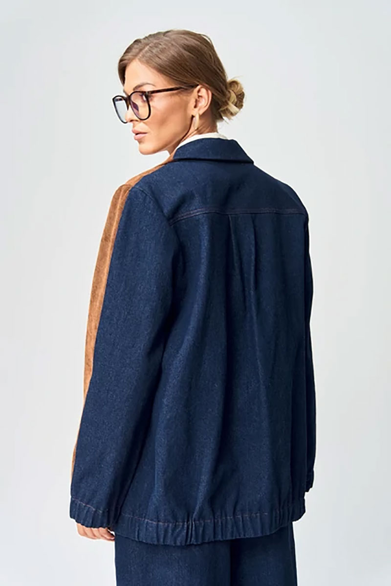 Жакет прямого силуэта сзади с имитацией куртки. Перед из вельветовой ткани, спинка из хлопковой джинсовой. Застежка однобортная на 2 петли и пуговицы. Воротник пиджачного типа. Перед с талиевой вытачкой, рельефом и декоративным клапаном. Спинка с кокеткой и складкой. Рукав втачной двухшовный. Низ спинки и нижней части рукава собраны на резинку.