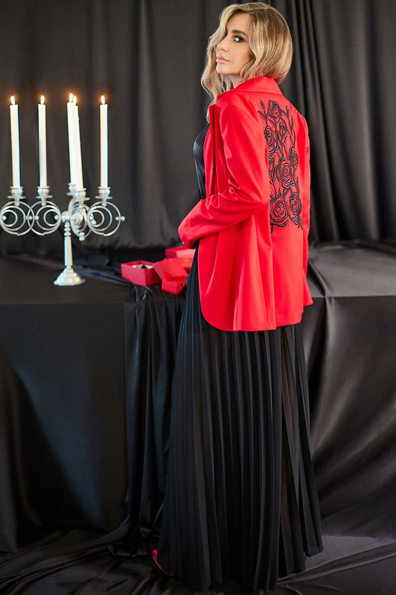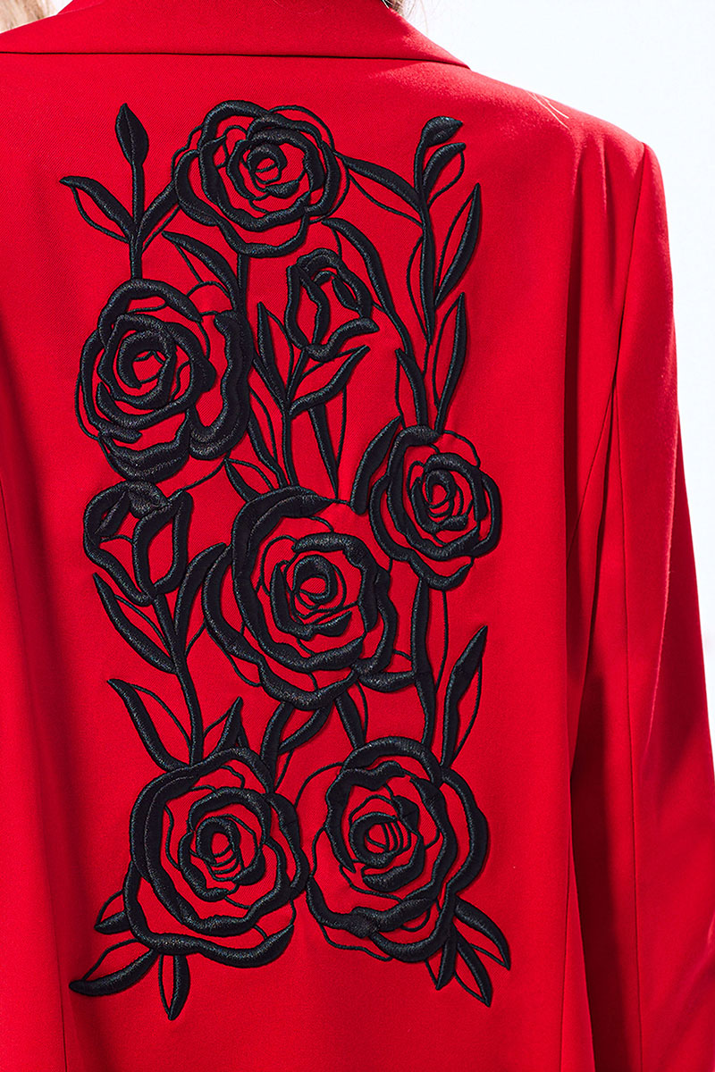 Жакет с центральной застежкой на петли и пуговицы, втачным воротником и лацканом пиджачного типа. По переду с рельефами, выходящими из проймы и нагрудными вытачками. В рельефных швах расположены карманы. По спинке с рельефами, выходящими из проймы. Центральная часть спинки с вышивкой в тон основной ткани. Рукав втачной, длинный.
