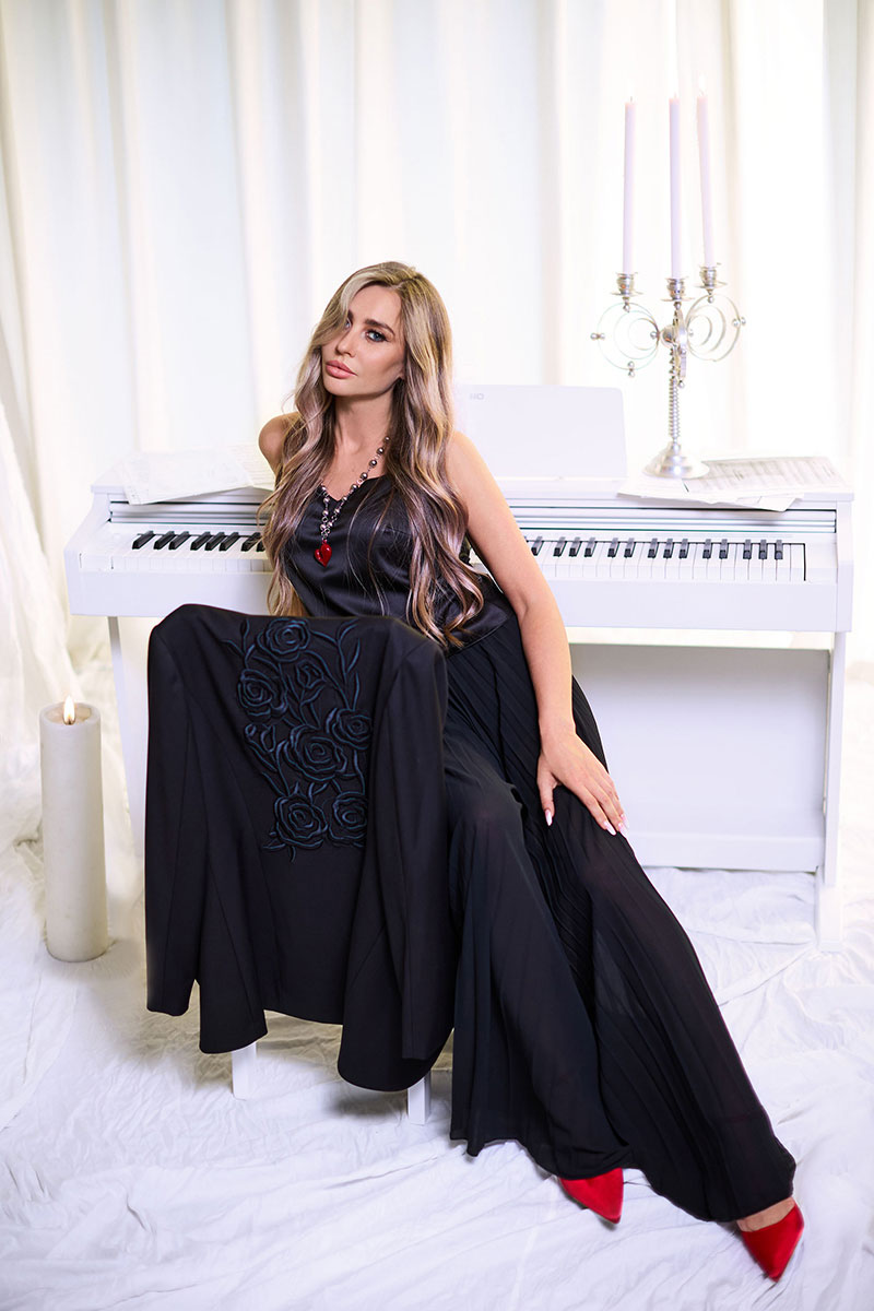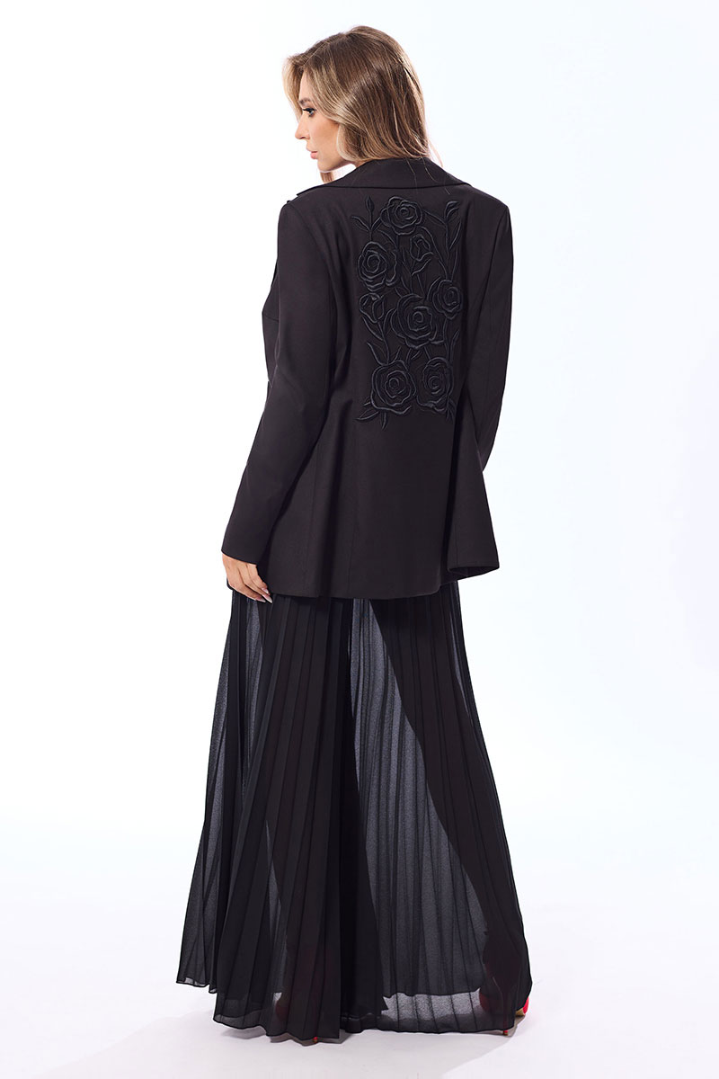 Жакет с центральной застежкой на петли и пуговицы, втачным воротником и лацканом пиджачного типа. По переду с рельефами, выходящими из проймы и нагрудными вытачками. В рельефных швах расположены карманы. По спинке с рельефами, выходящими из проймы. Центральная часть спинки с вышивкой в тон основной ткани. Рукав втачной, длинный.