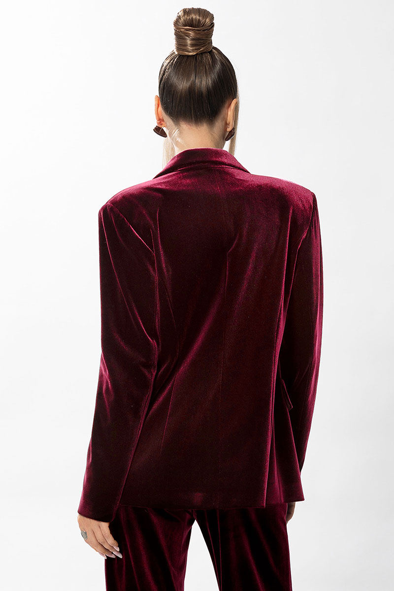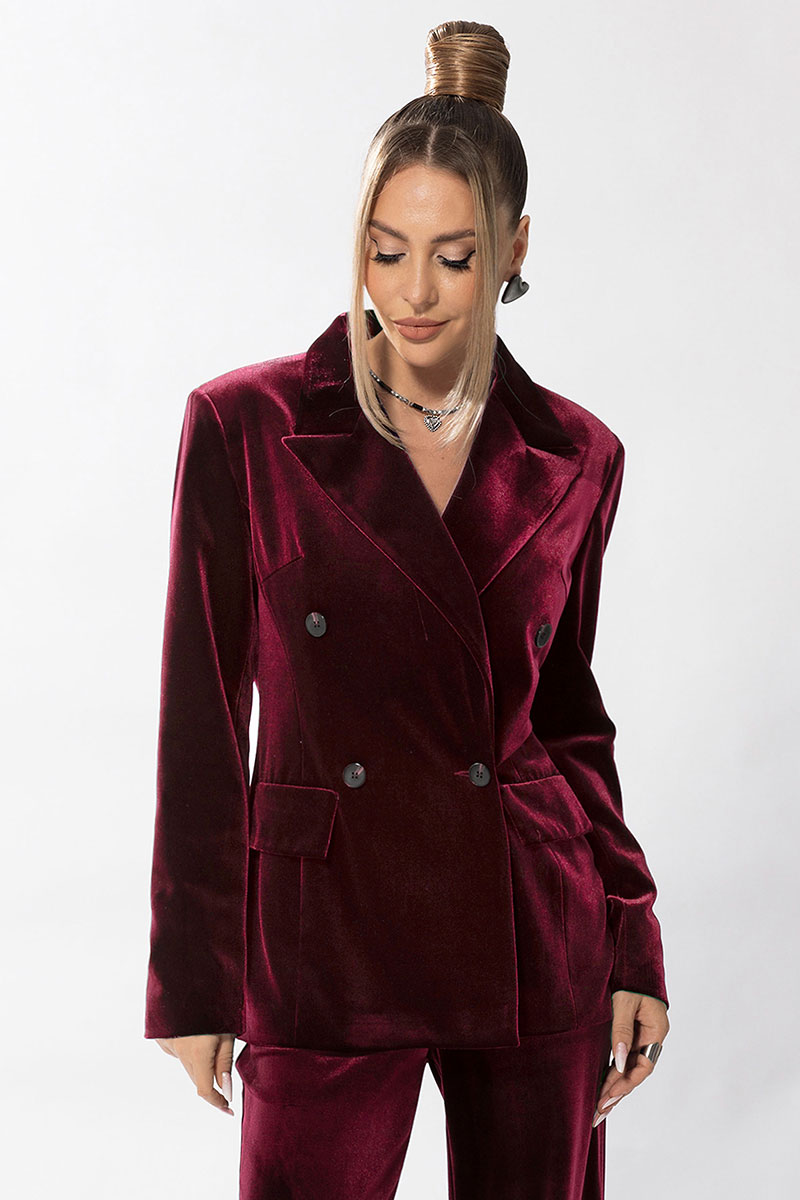 Описание внешнего вида: жакет прямого силуэта с центральной двубортной застежкой на петли и пуговицы, с втачным воротником и отложными лацканами пиджачного типа. По переду с рельефами, выходящими из проймы. На уровне линии талии расположены настрочные клапаны. Спинка со средним швом, рельефами, выходящими из проймы. Рукав втачной, длинный.