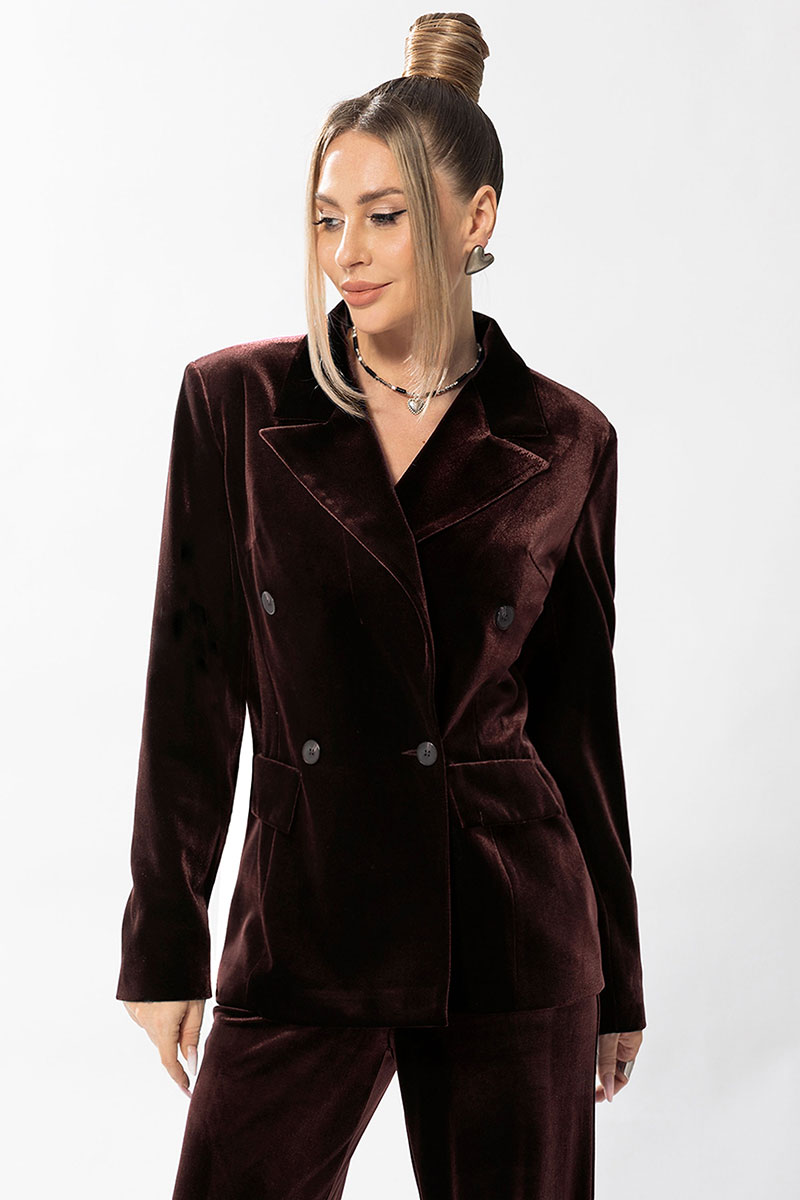 Описание внешнего вида: жакет прямого силуэта с центральной двубортной застежкой на петли и пуговицы, с втачным воротником и отложными лацканами пиджачного типа. По переду с рельефами, выходящими из проймы. На уровне линии талии расположены настрочные клапаны. Спинка со средним швом, рельефами, выходящими из проймы. Рукав втачной, длинный.