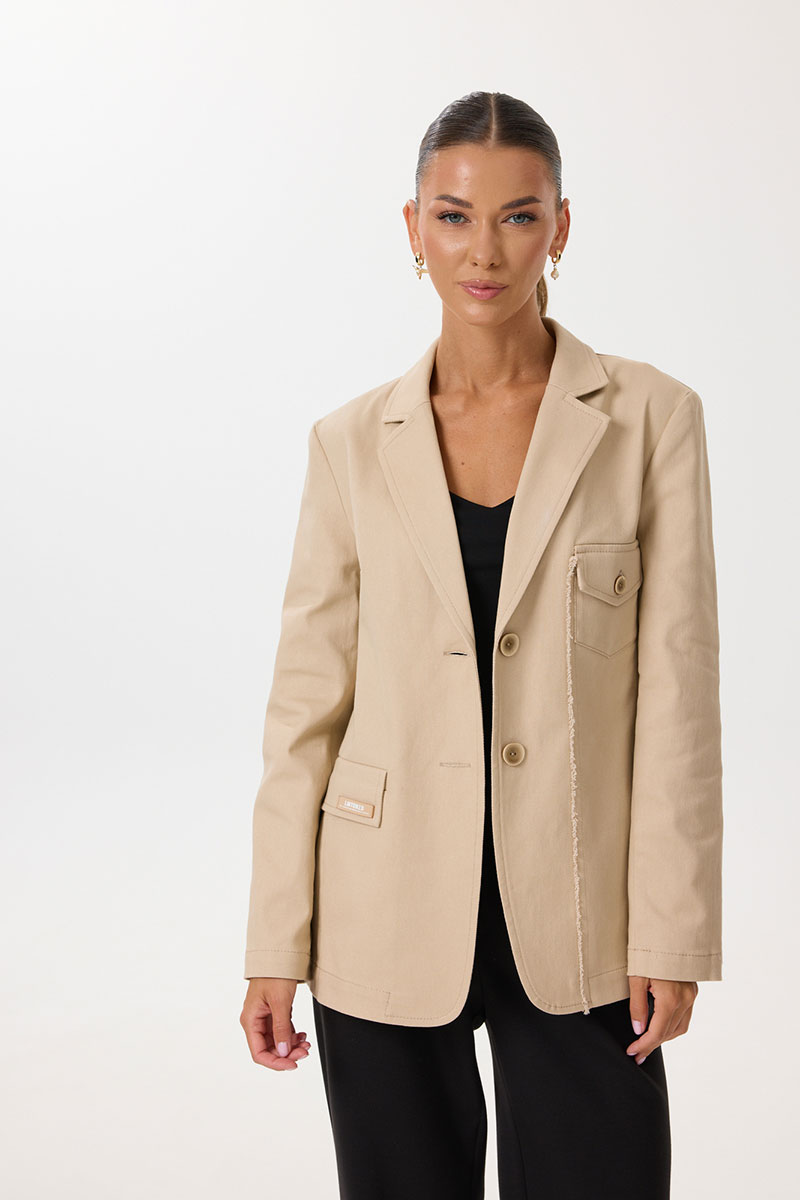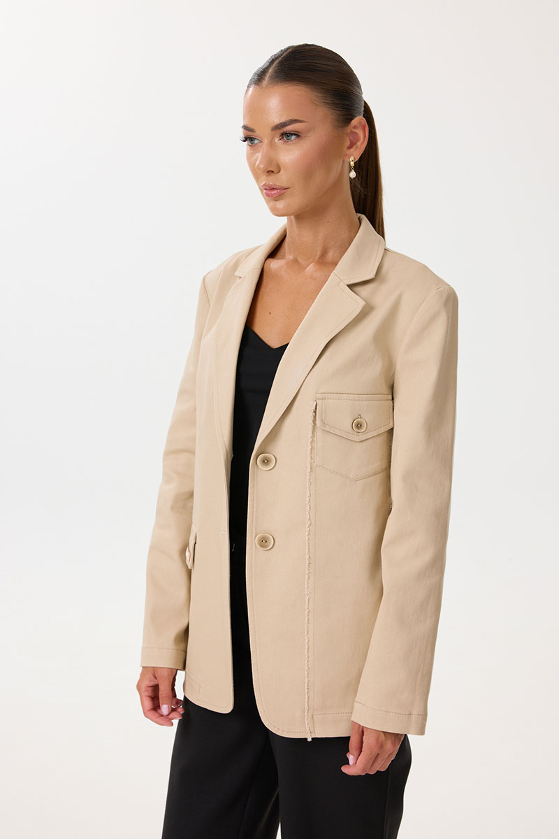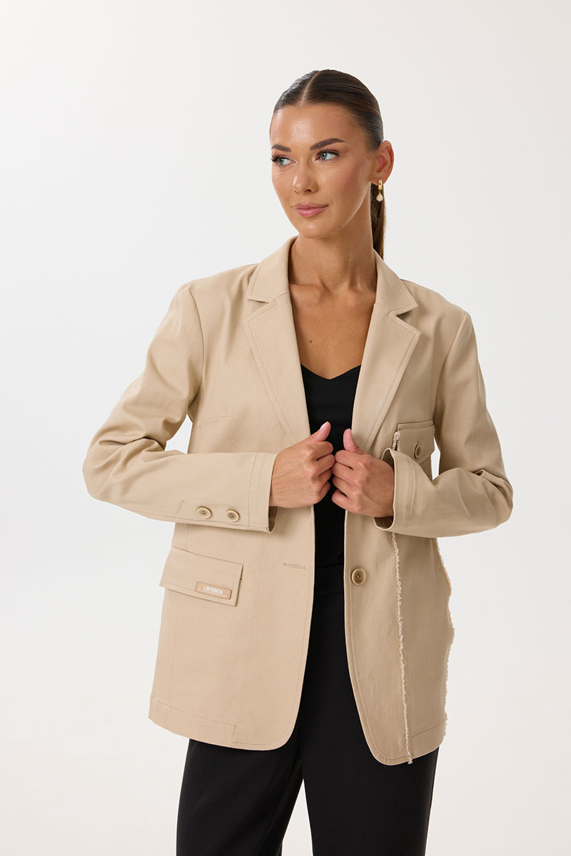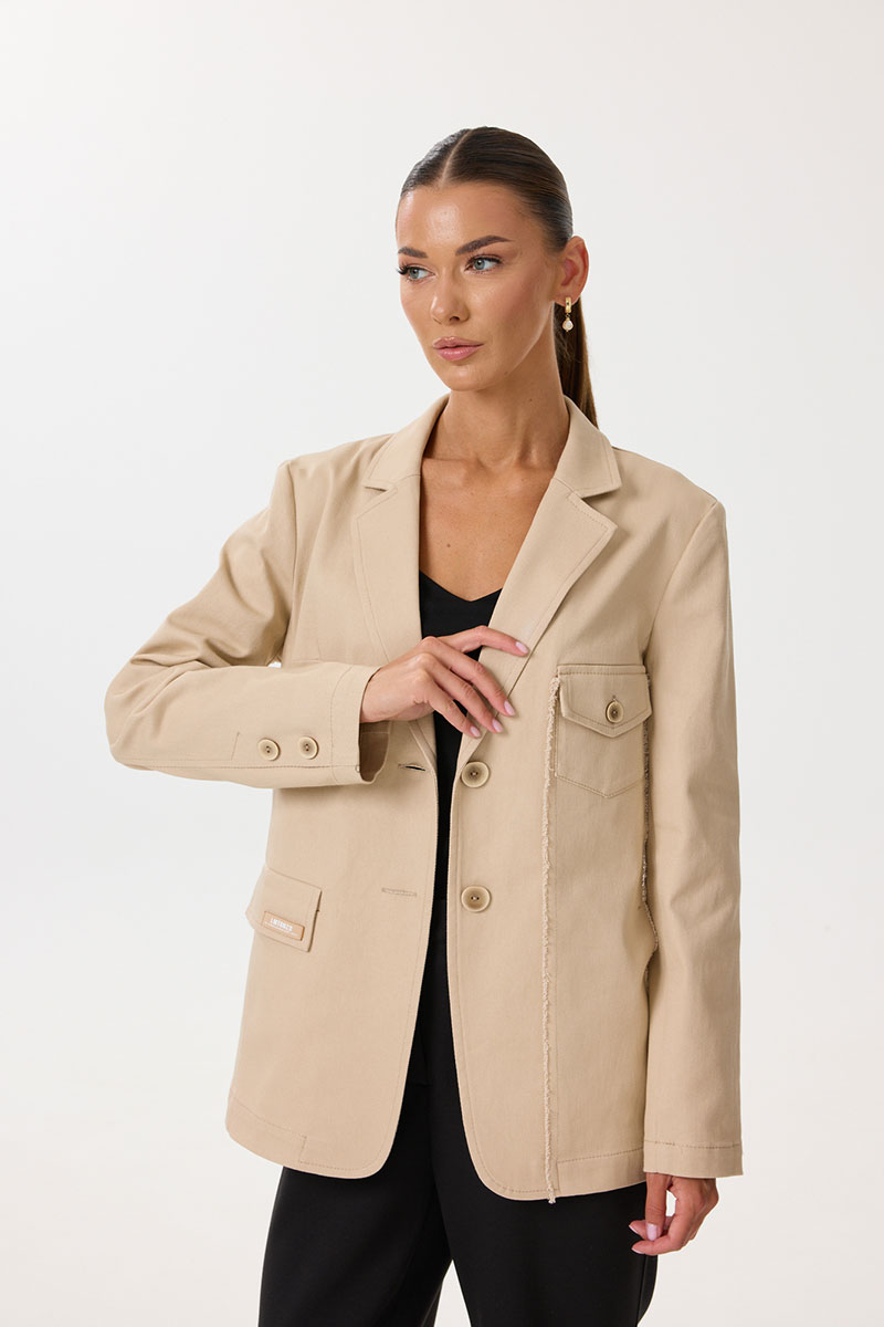Жакет женский прямого силуэта с центральной бортовой застежкой на петли и пуговицы. По переду обработаны нагрудные вытачки, рельефы, справа прорезной карман с клапаном и листочкой (клапан декорирован нашивкой). Слева расположена настрочная «вытрепанная» деталь с накладным карманом и клапаном, застегивающимся на петлю и пуговицу. Спинка с «вытрепанной» кокеткой, на которой расположена декоративная нашивка. Нижняя часть спинки с отстрочными «вытрепанными» рельефами. Рукав длинный 2-х шовный отстрочной, с имитацией шлицы, декорированной пуговицами. Воротник пиджачного типа с отрезной стойкой.