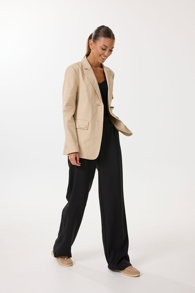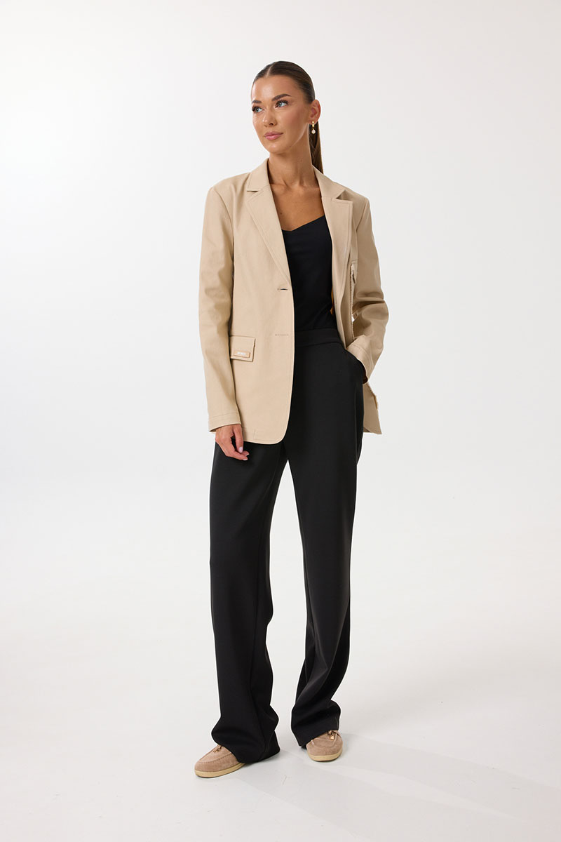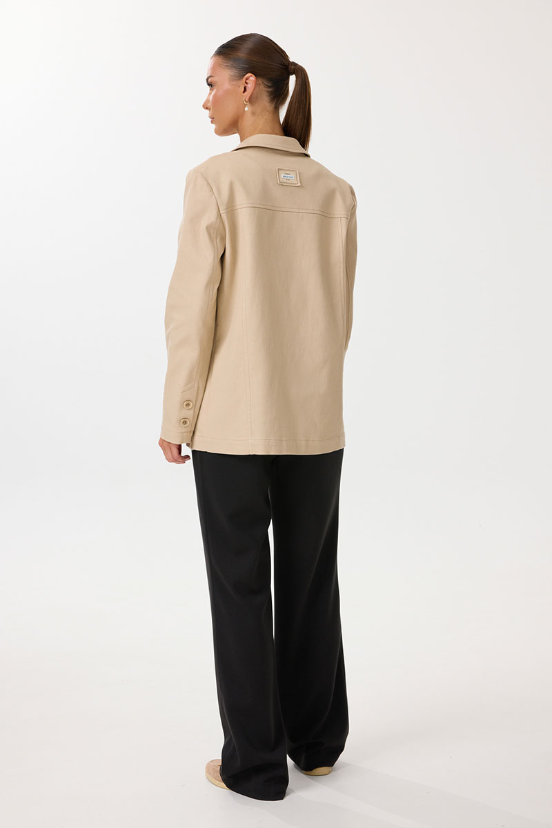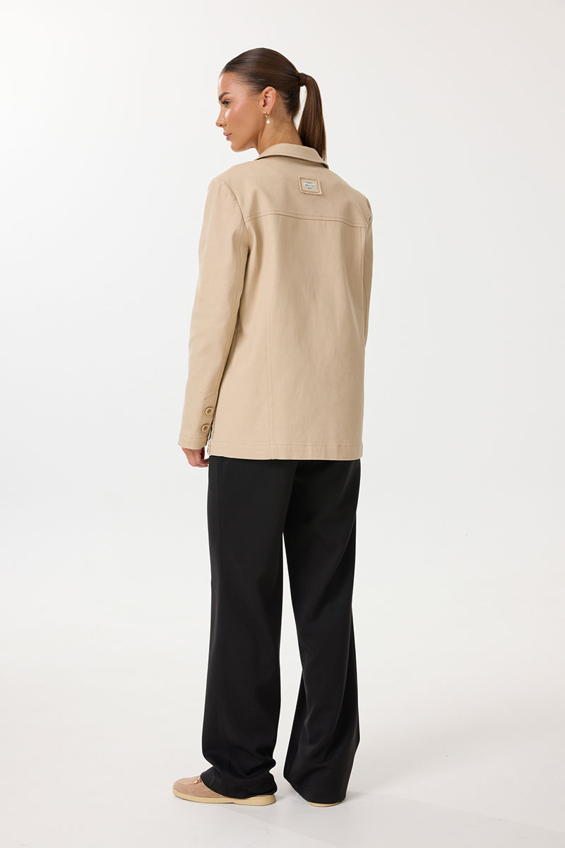 Жакет женский прямого силуэта с центральной бортовой застежкой на петли и пуговицы. По переду обработаны нагрудные вытачки, рельефы, справа прорезной карман с клапаном и листочкой (клапан декорирован нашивкой). Слева расположена настрочная «вытрепанная» деталь с накладным карманом и клапаном, застегивающимся на петлю и пуговицу. Спинка с «вытрепанной» кокеткой, на которой расположена декоративная нашивка. Нижняя часть спинки с отстрочными «вытрепанными» рельефами. Рукав длинный 2-х шовный отстрочной, с имитацией шлицы, декорированной пуговицами. Воротник пиджачного типа с отрезной стойкой.