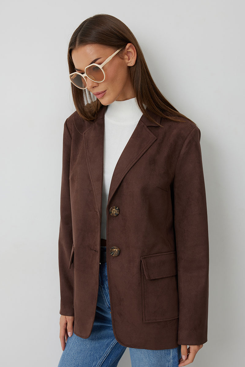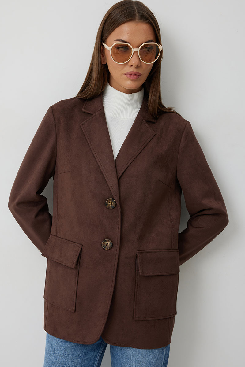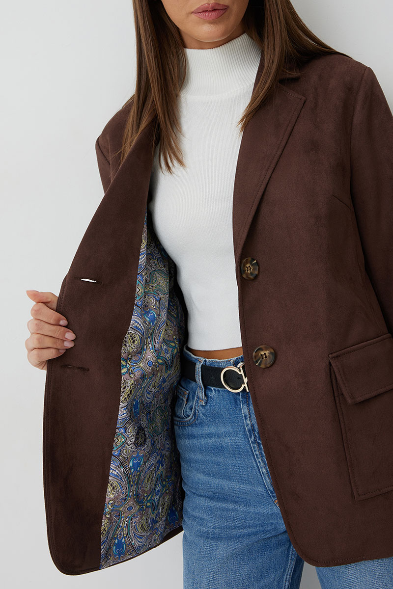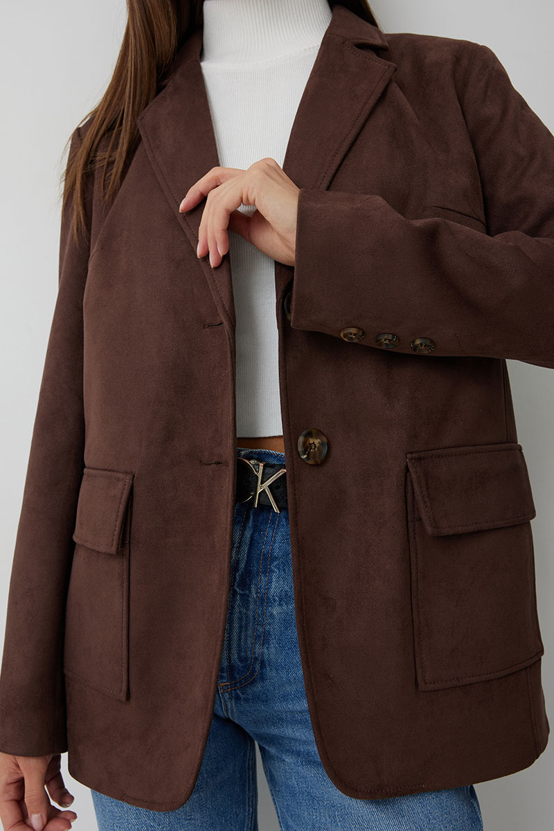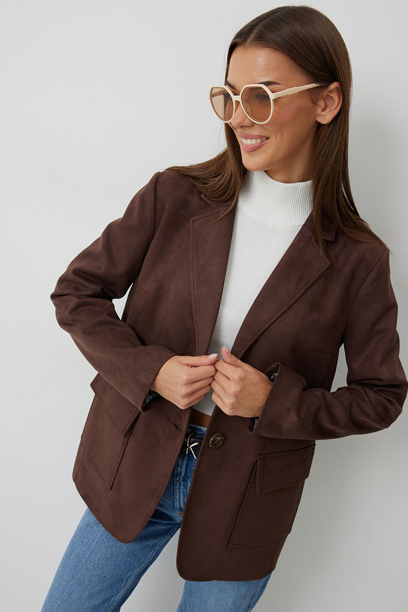 Жакет женский прямого силуэта на частичной подкладке. Жакет  однобортный, длинной до середины бедра. Полочка с отрезными бочками и вытачкой. На нижней части полочки настрочены накладные карманы с клапаном. Спинка с отрезными бочками и отрезной кокеткой Рукав втачной, полной длинны. По низу рукава обработана имитация шлицы с отделочными декоративными пуговицами. Воротник в жакете втачной с отрезной стойкой и лацканами. Линия низа борта полочки скруглена. Жакет застегивается на петли пуговицы. По воротнику, лацкану, борту, карманам и швам спинки прострочены отделочные строчки. Полочки, кокетка спинки и рукава с контрастной подкладкой.Декоративные элементы и фурнитура могут отличаться от заявленных на фото. Цвет материала может отличаться по тону в зависимости от настроек вашего монитора!