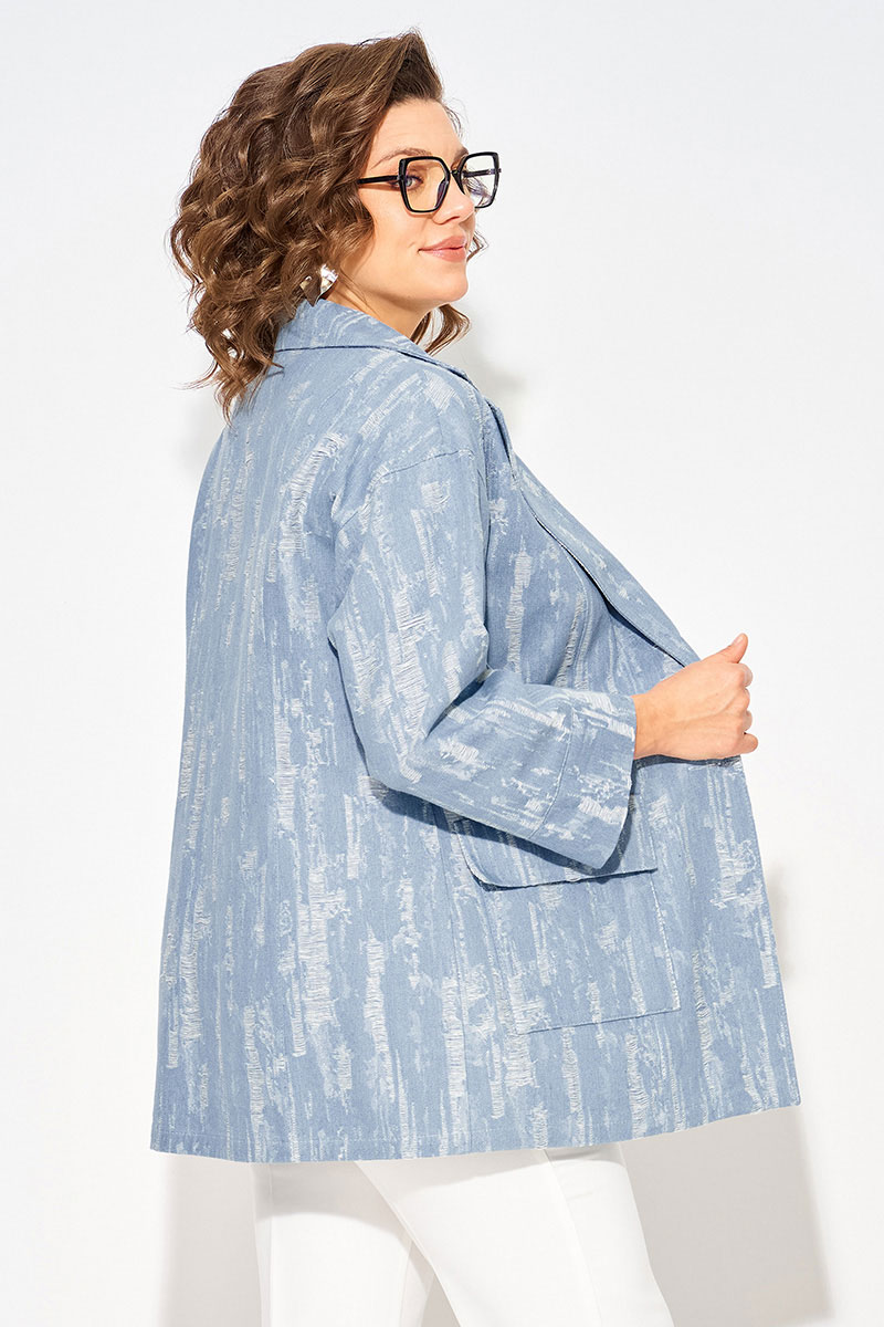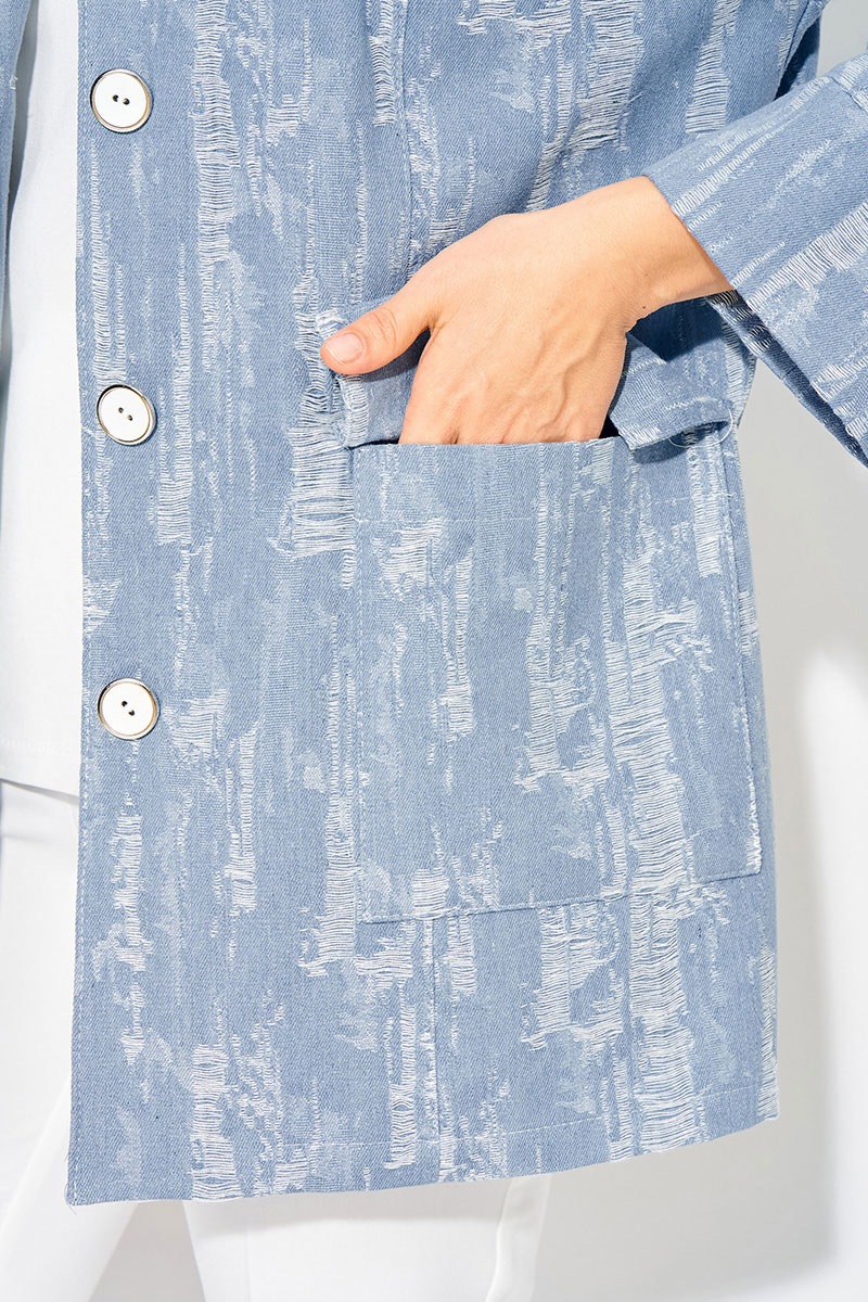Джинсовый женский жакет идеальный выбор для создания стильного весенне-летнего образа 2026 года. Современный, светлый дизайн с эффектом гранжа придает свою изюминку изделию. Модель свободного силуэта, на спущенном плечевом поясе. Воротник отложной, английского типа с подбортом. Застежка центральная на петли и пуговицы. По полочке и спинке расположены продольные рельефы для комфортного прилегания. Спереди расположены накладные карманы с клапаном.