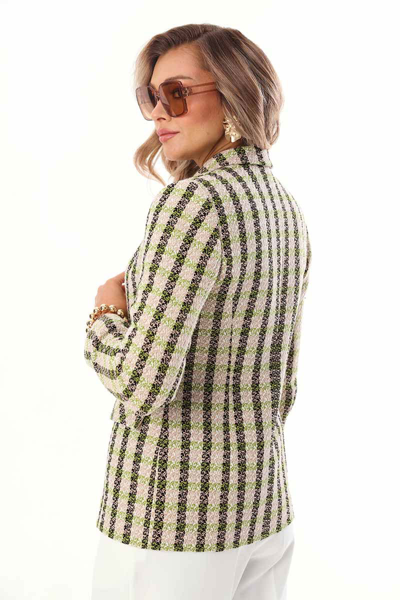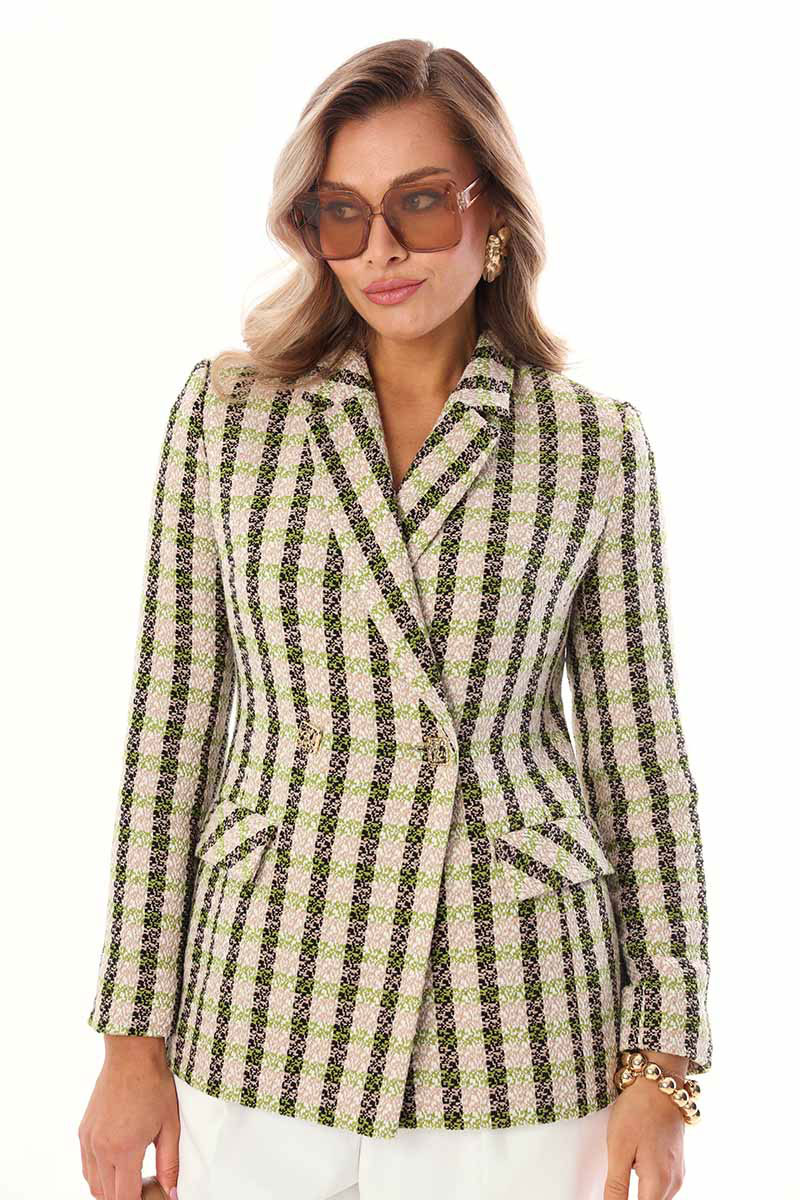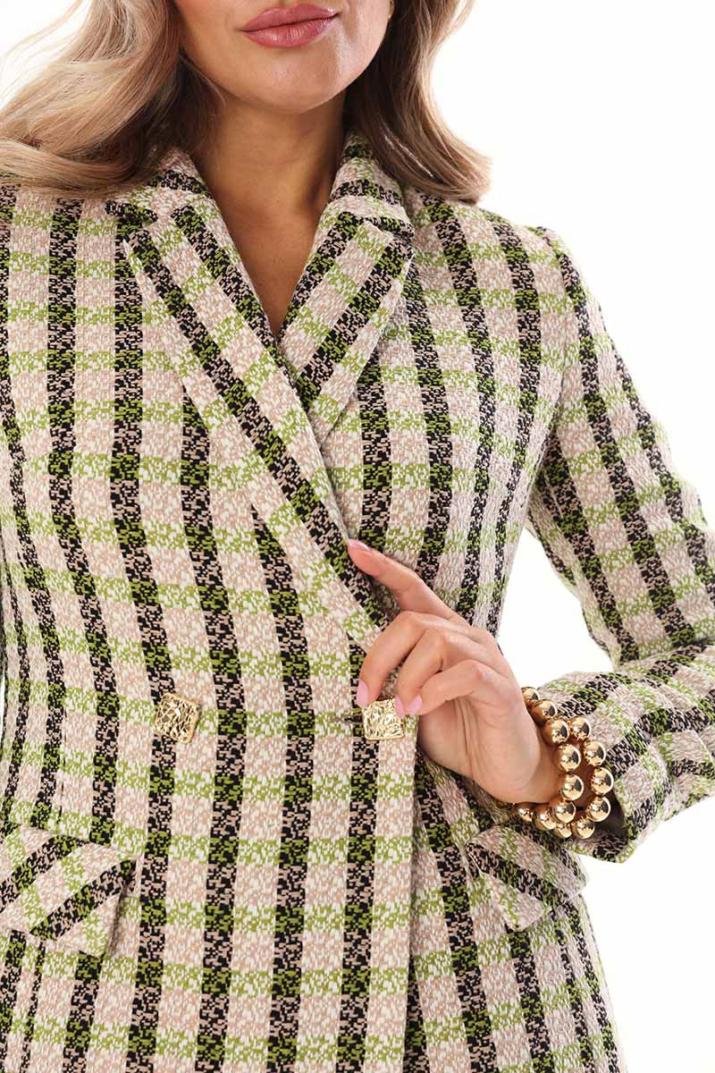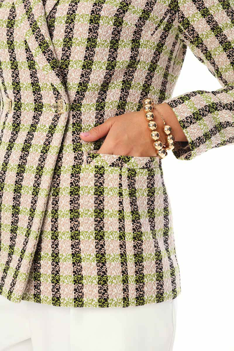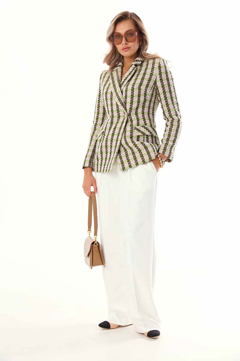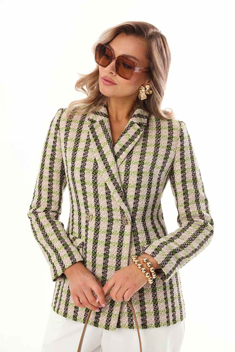 Жакет двубортный умеренного объёма из тёплой мягкой ткани. Застёжка на две пуговицы. По бокам расположены функциональные прорезные карманы с клапаном. Жакет на подкладке.
