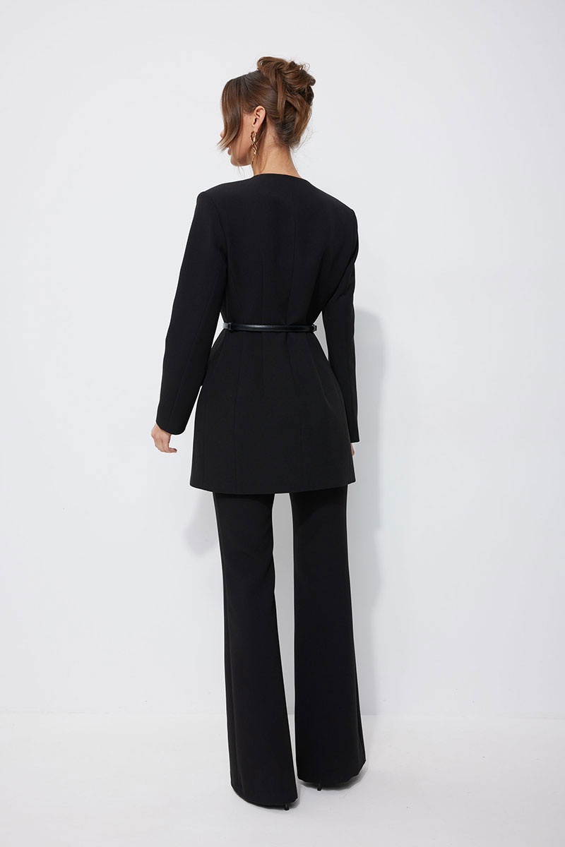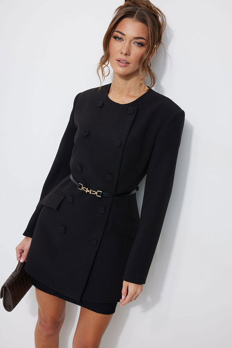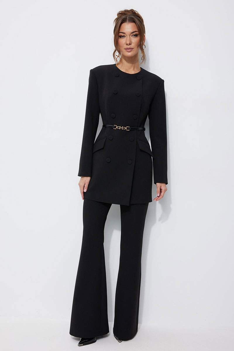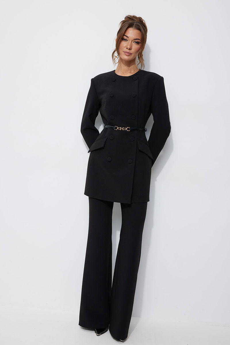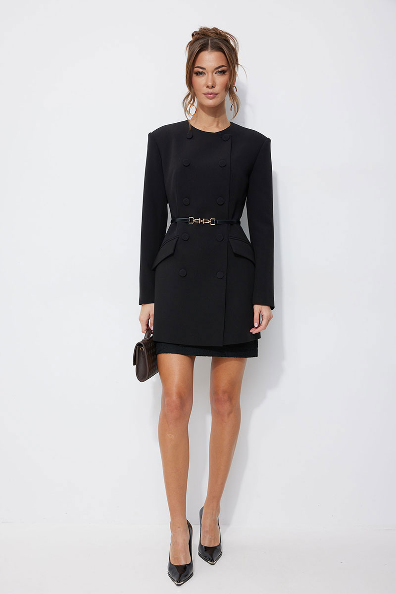 Платье-жакет из плотной поливискозы, длина мини. Платье-жакет приталенного силуэта, с расширенным плечевым поясом и расширением по низу. С двубортной застежкой по переду на пуговицы. По переду отрезные бочки и талиевые вытачки. По спинке отрезные бочки, талиевые вытачки, средний шов. Горловина овальной формы. По переду ниже линии талии карманы с клапаном, вход оформлен в рамку. Карманы расположены под наклоном. Платье на подкладке. Рукав втачной, длинный. Платье дополняется готовым съемным поясом. Обращаем Ваше внимание, что фурнитура может незначительно отличаться от фото. Данное платье-жакет можно носить, как самостоятельное изделие либо в комплекте с юбками и брюками.