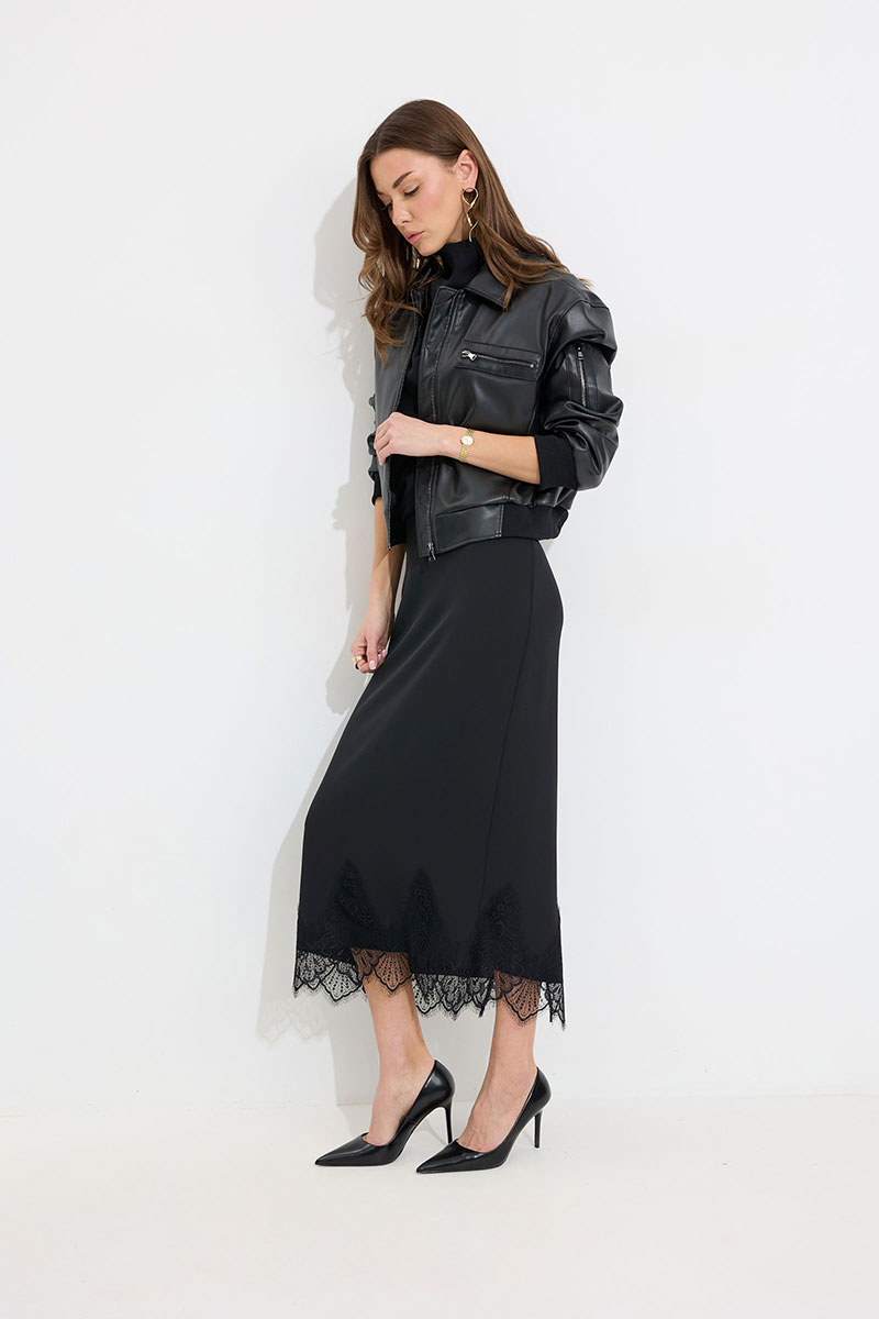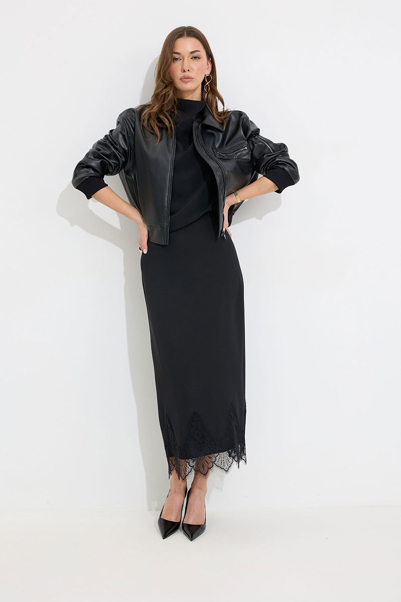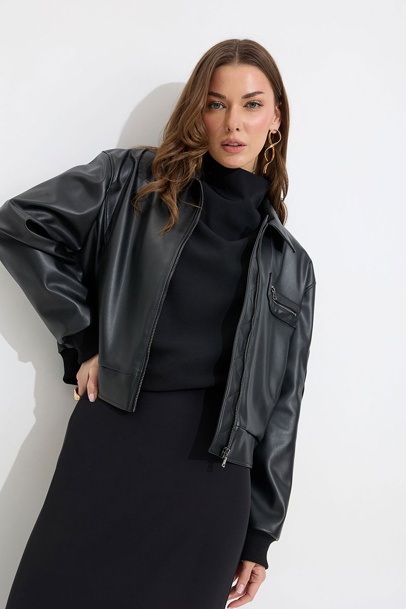 Жакет прямого силуэта из экокожи. Воротник отложной, по центру застежка на молнию. Жакет с удлиненной линией плеча, рукав одношовный втачной, по низу рукава  манжета (из трикотажного полотна). По переду рельефы  с функциональными карманами и декоративный элемент с молнией. На спинке кокетка. По низу жакета притачной пояс (из трикотажного полотна). Жакет на подкладке. Обращаем ваше внимание, что фурнитура может отличаться от фото.