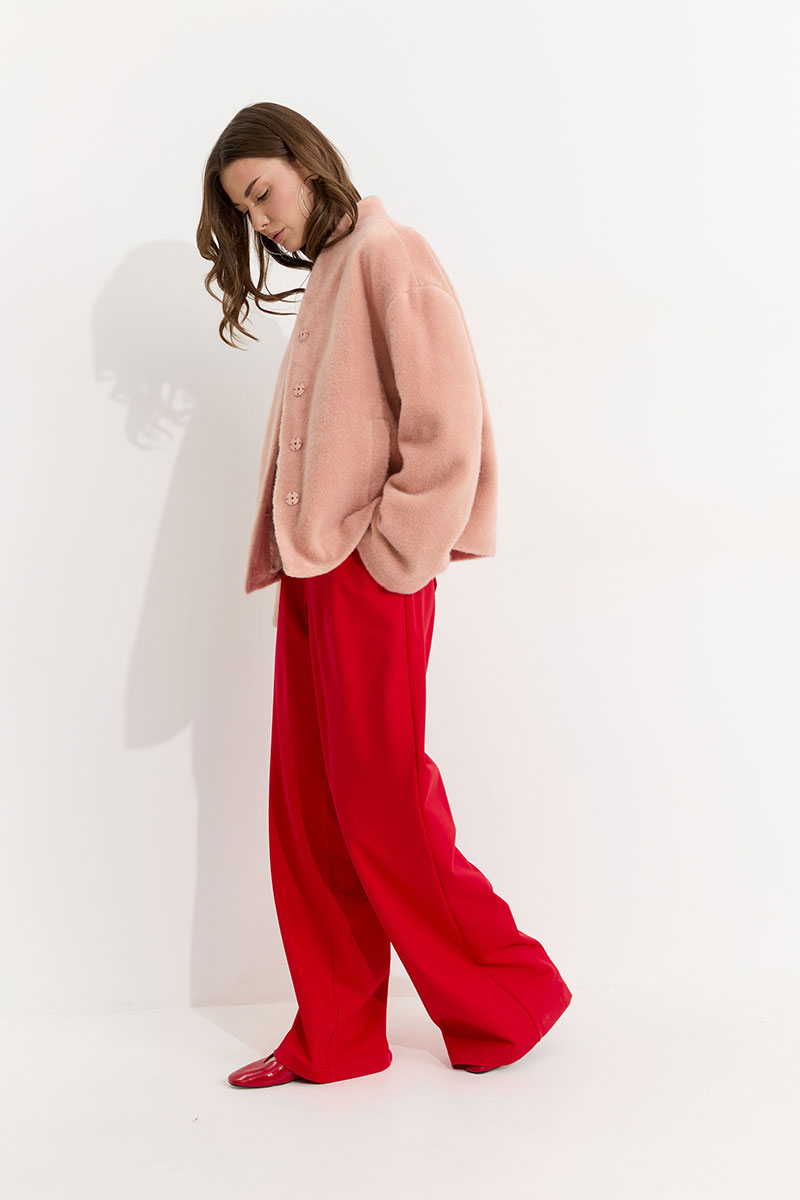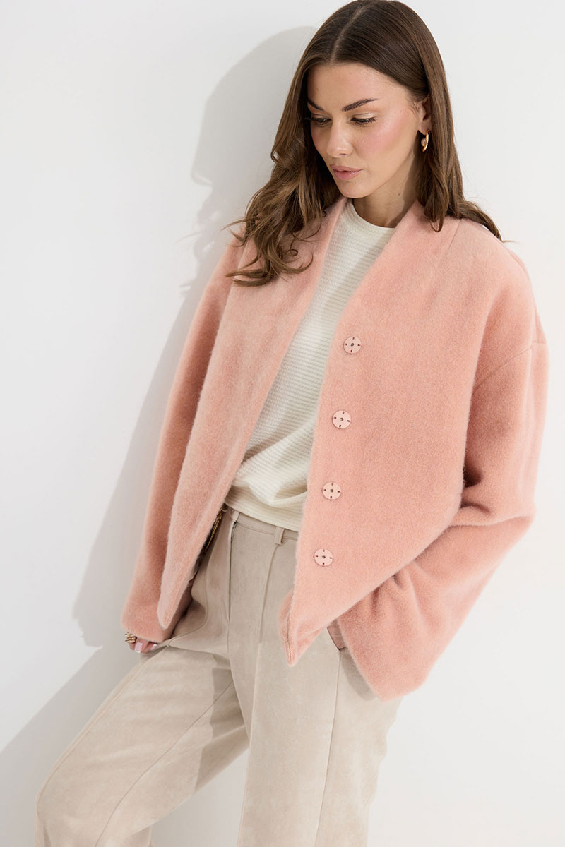 Жакет прямого силуэта из трикотажного полотна. Горловина цельнокроеная стойка по центру застежка на кнопки. Рукав со спущенной линией плеча, расширенный к низу. По переду карманы с листочками. Жакет на подкладке. Обращаем ваше внимание, что фурнитура может отличаться от фото.