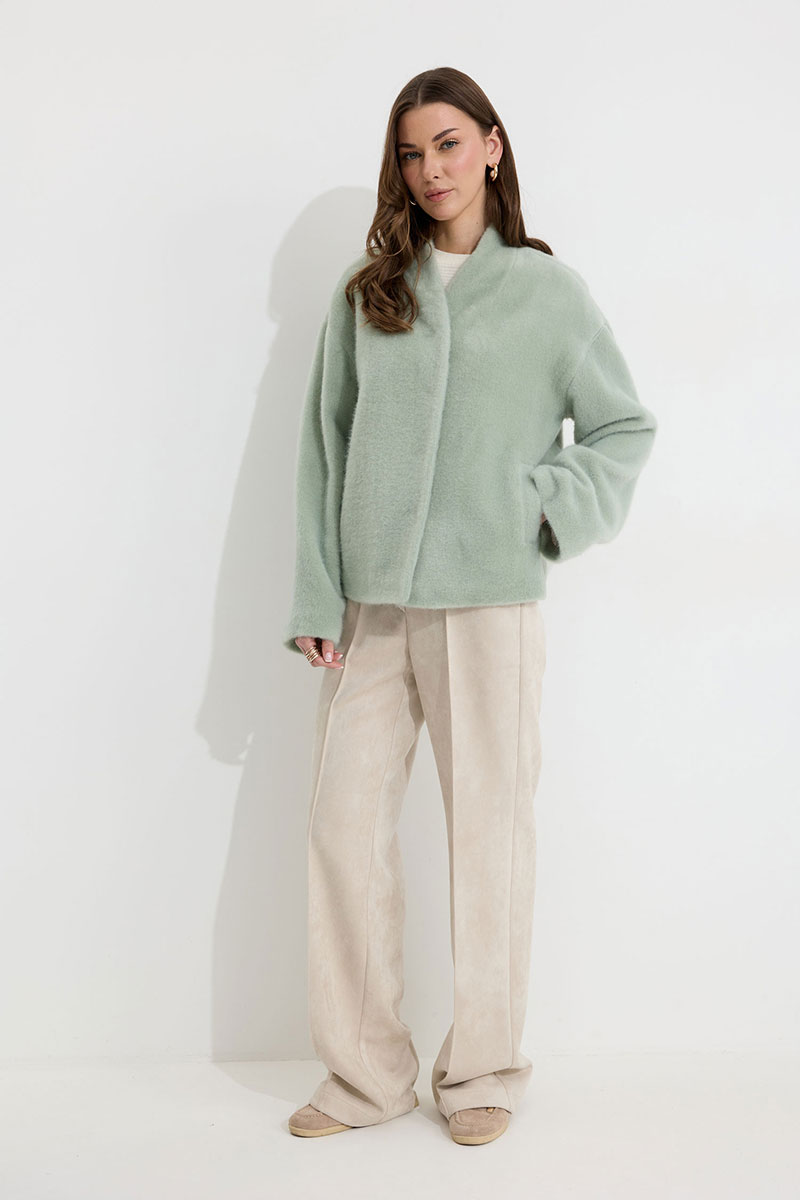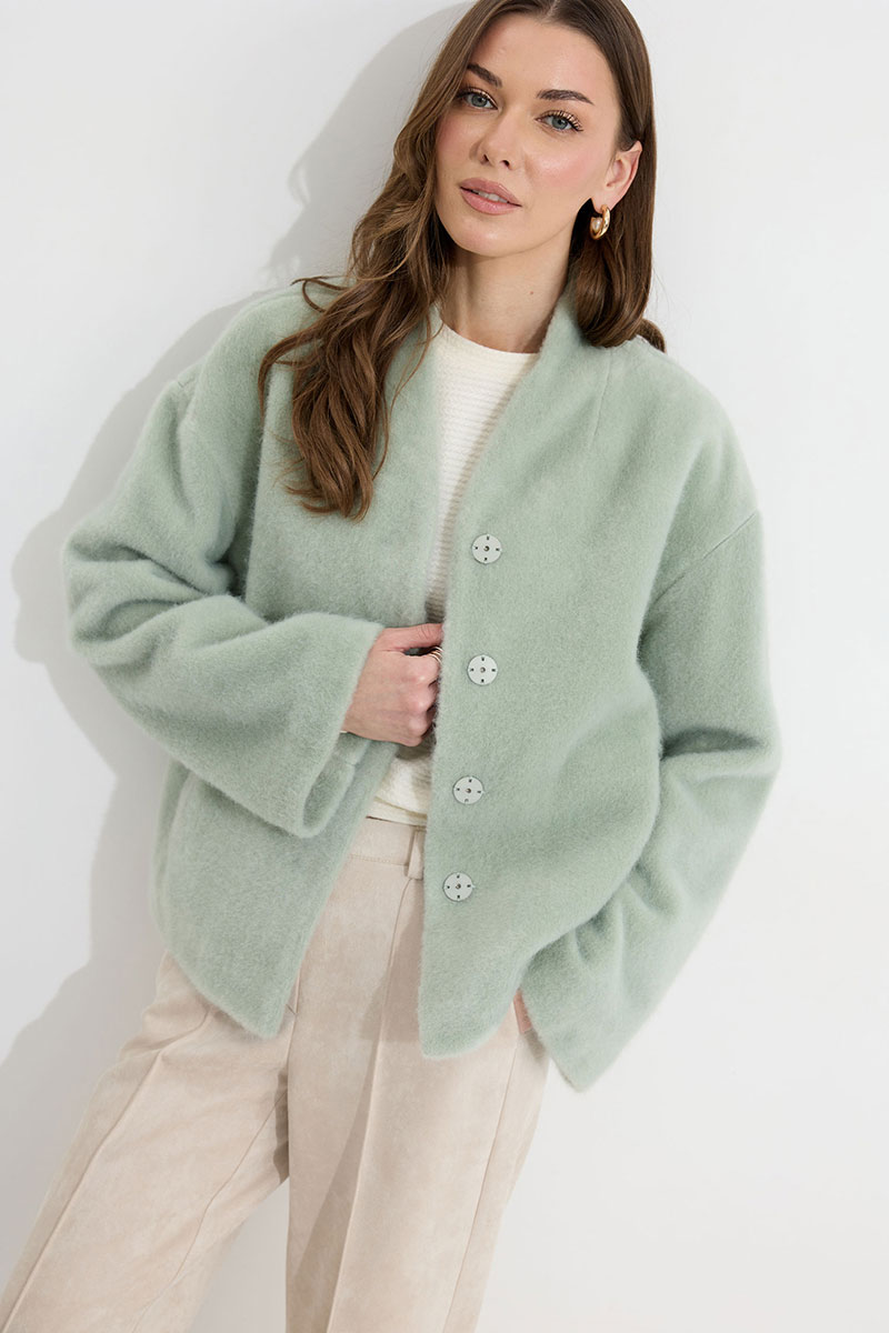 Жакет прямого силуэта из трикотажного полотна. Горловина цельнокроеная стойка по центру застежка на кнопки. Рукав со спущенной линией плеча, расширенный к низу. По переду карманы с листочками. Жакет на подкладке. Обращаем ваше внимание, что фурнитура может отличаться от фото.