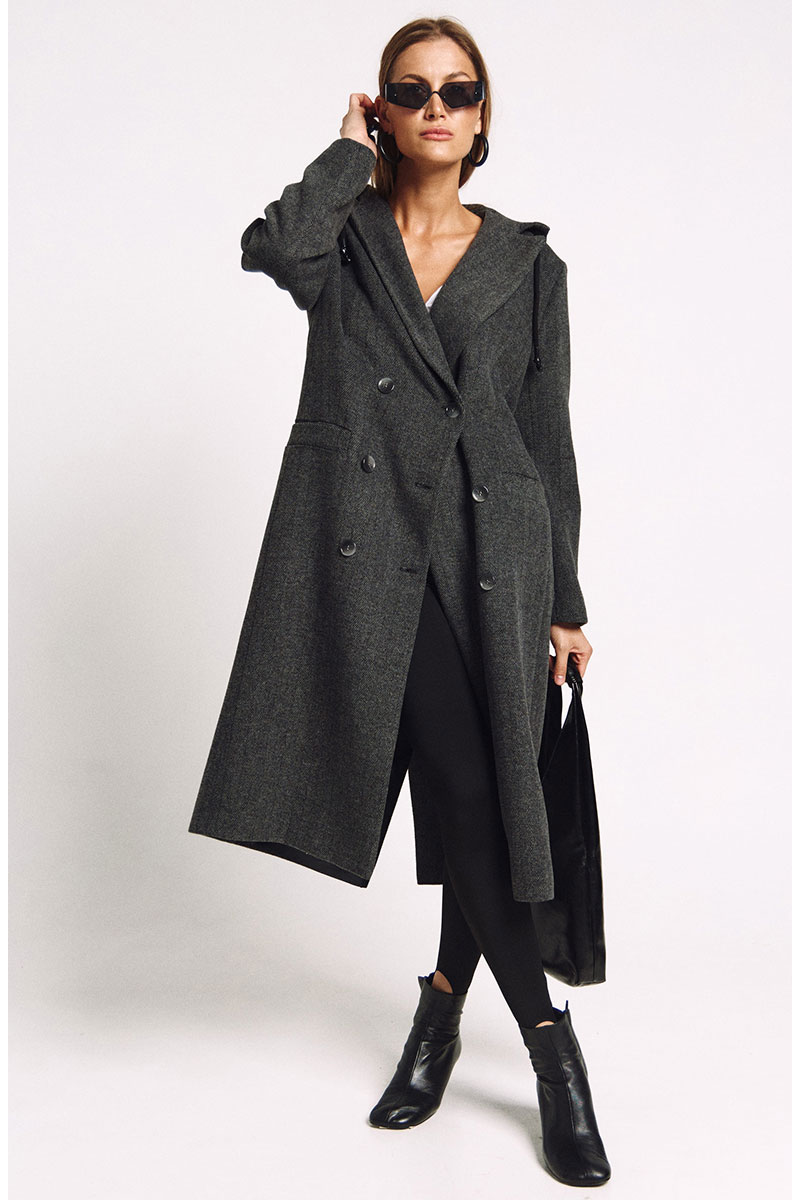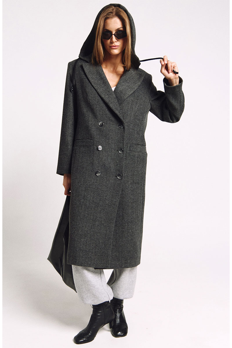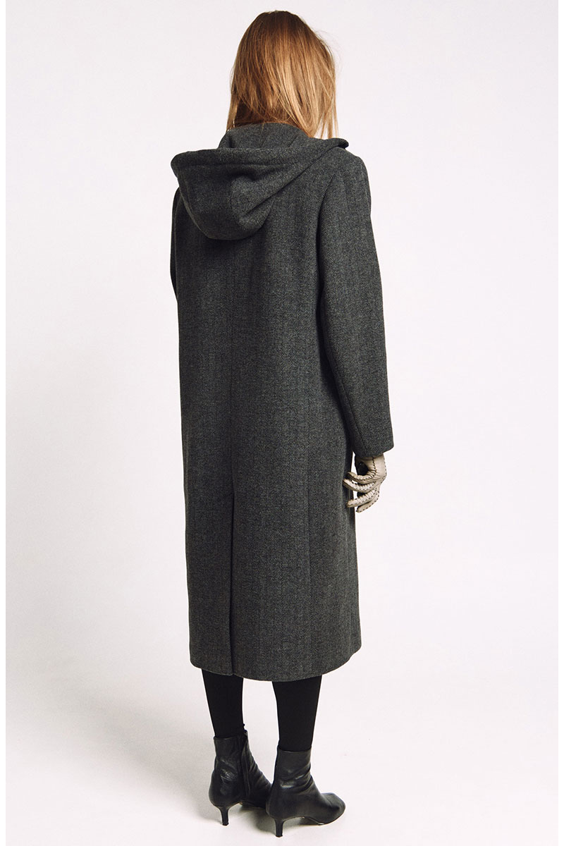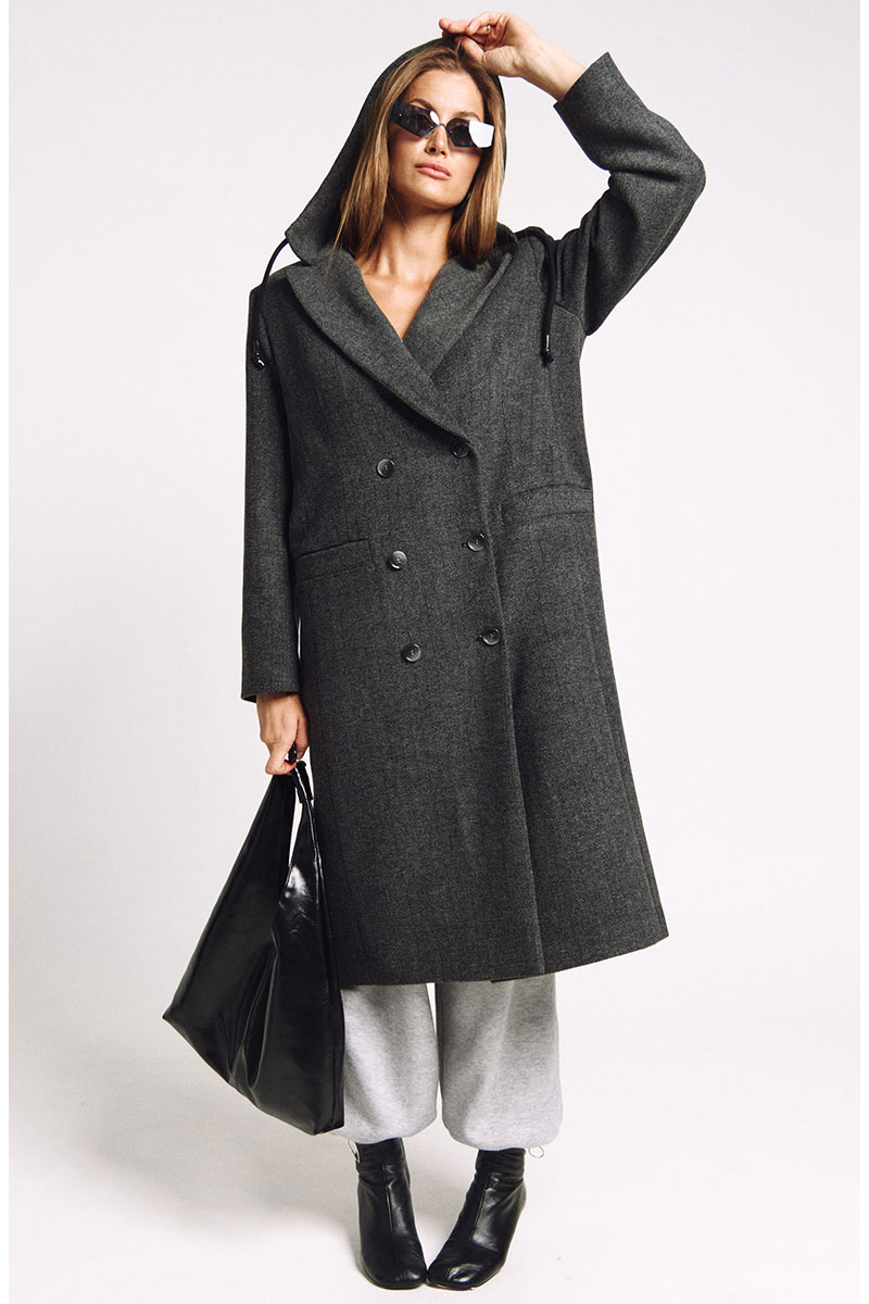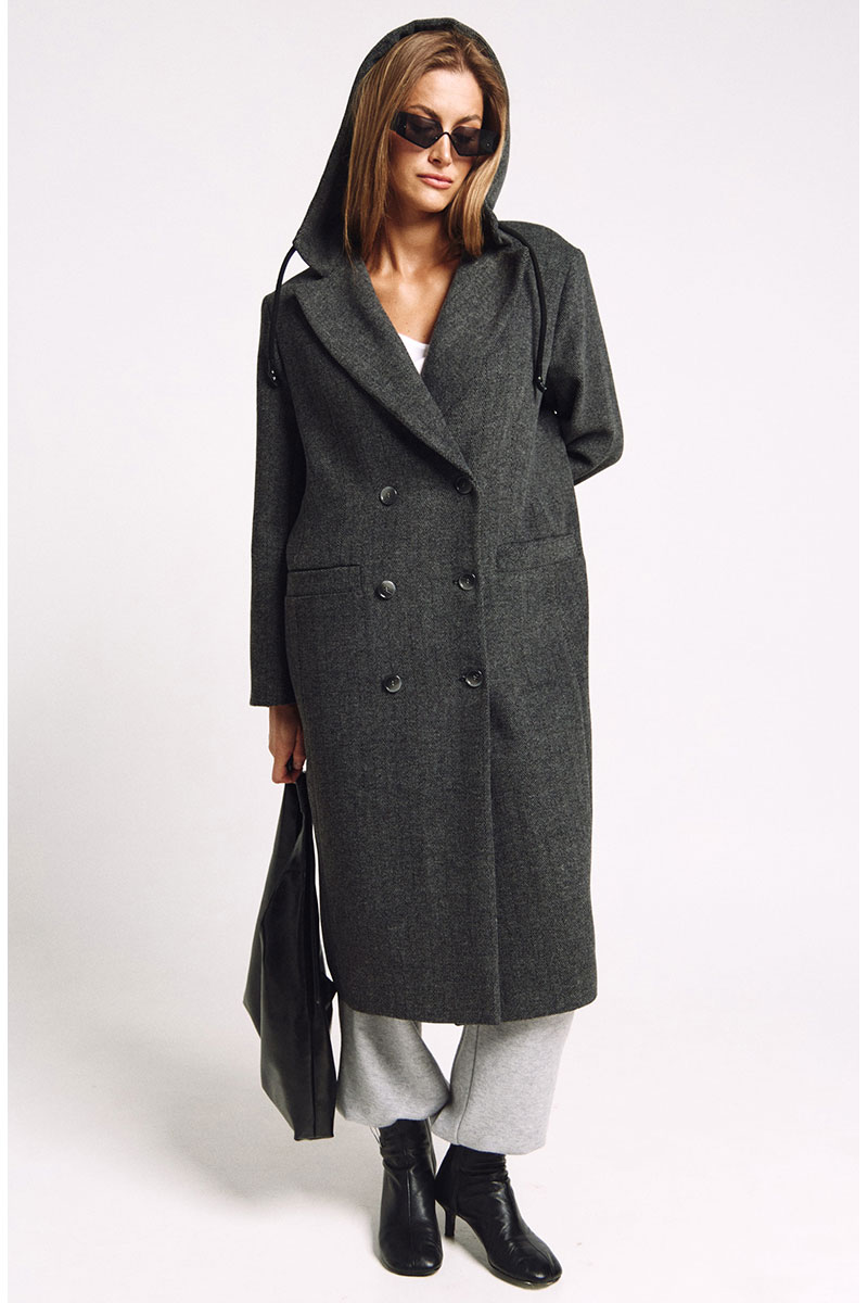 Жакет из пальтовой ткани, удлиненный, на подкладке. Капюшон конструктивно из верхней части воротника.