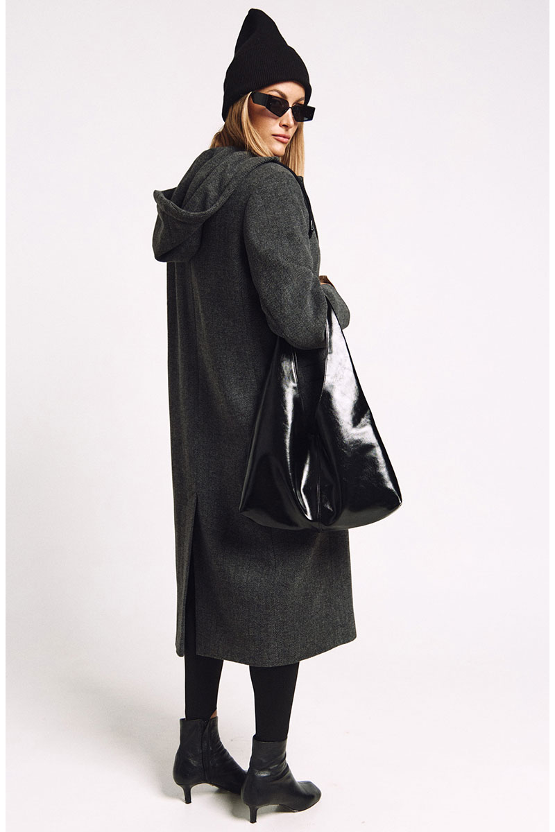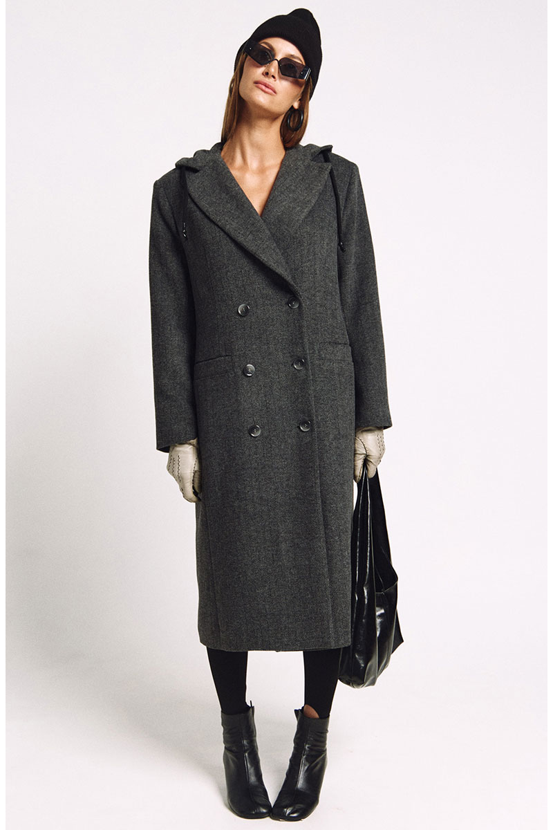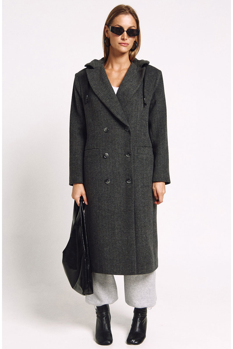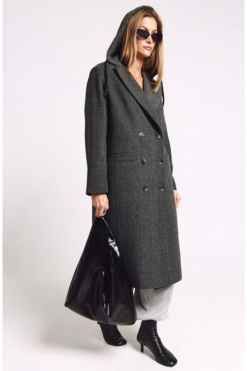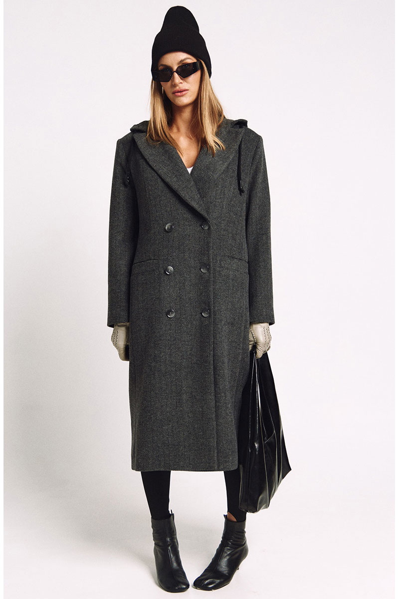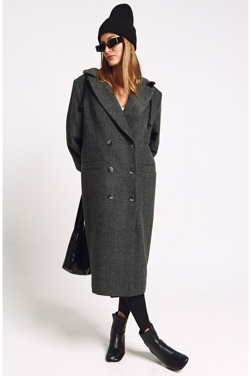 Жакет из пальтовой ткани, удлиненный, на подкладке. Капюшон конструктивно из верхней части воротника.