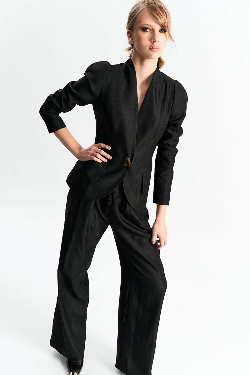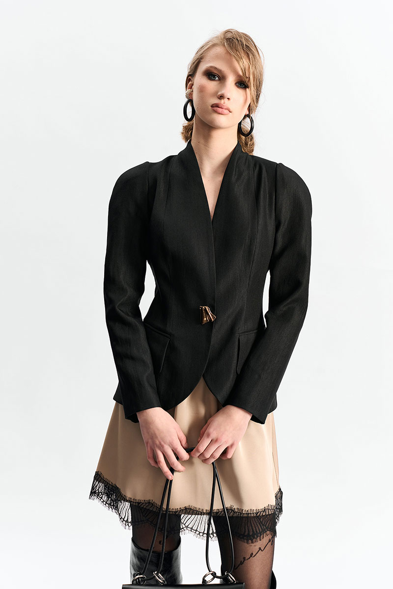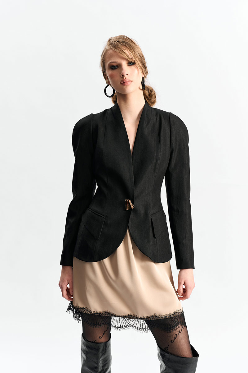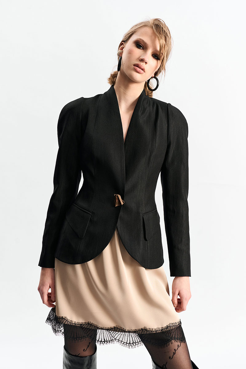 Жакет прилегающего силуэта, с акцентной округлой линией плеча. Декоративная пуговица-украшение. Выполнен из смесовой вискозы с легким ненавязчивым блеском.
