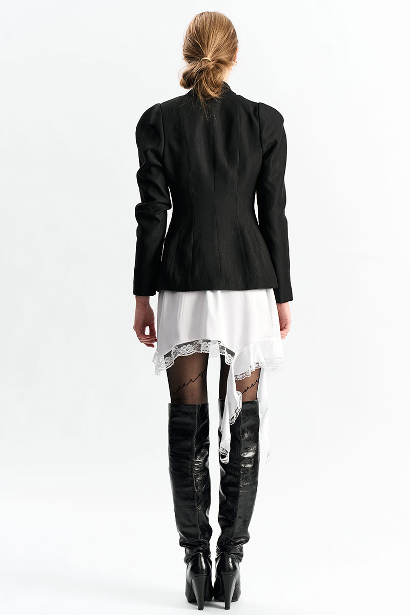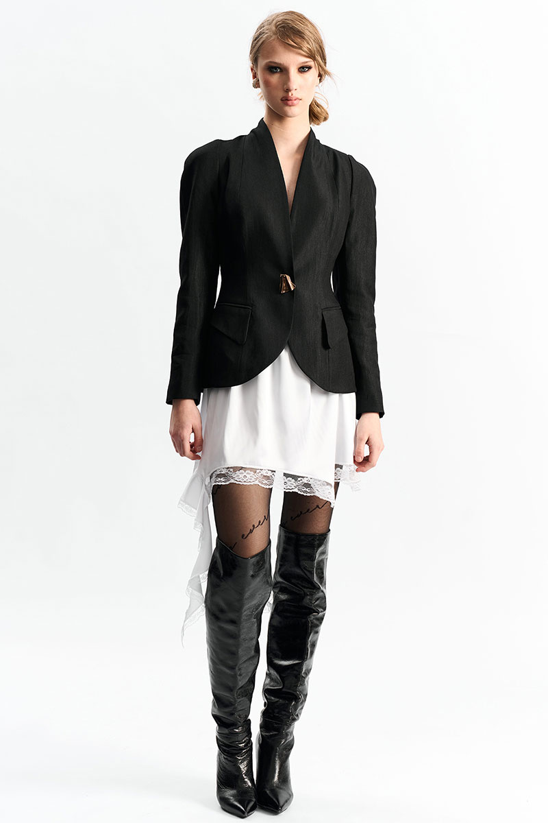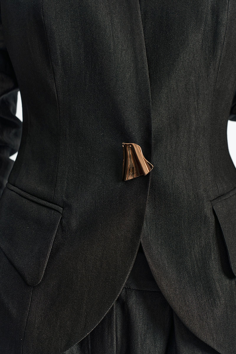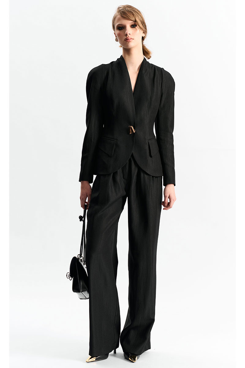 Жакет прилегающего силуэта, с акцентной округлой линией плеча. Декоративная пуговица-украшение. Выполнен из смесовой вискозы с легким ненавязчивым блеском.