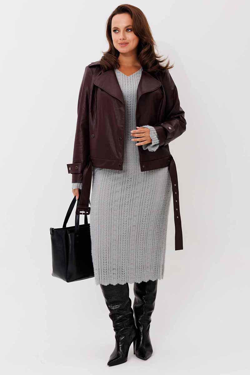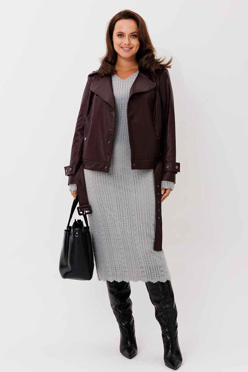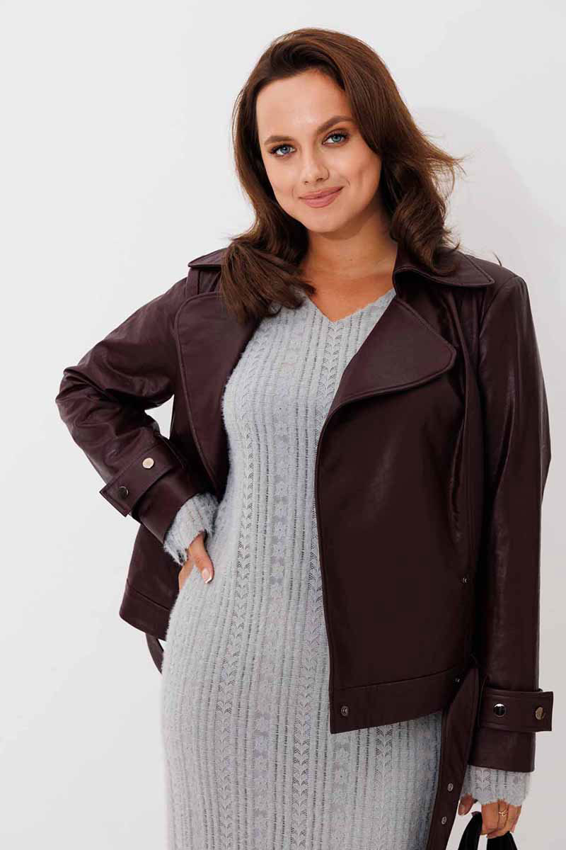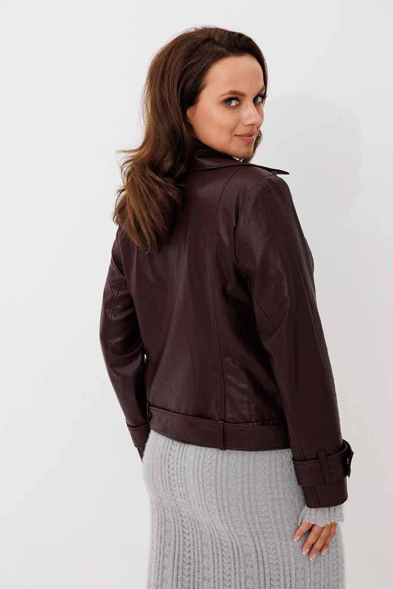 Жакет женский, укороченная, прямого силуэта на подкладке, выполнена из качественной экокожи. Застёжка двубортная на кнопки. По переду рельефы от плеча до низа и прорезные карманы с листочкой. Спинка с рельефами от плеча до низа. По низу куртки приточная планка со шлёвками, в которые продет пояс с пряжкой. Воротник отложной на стойке. Рукава двух шовные втачные, по низу паты продеты в шлёвки на кнопках.